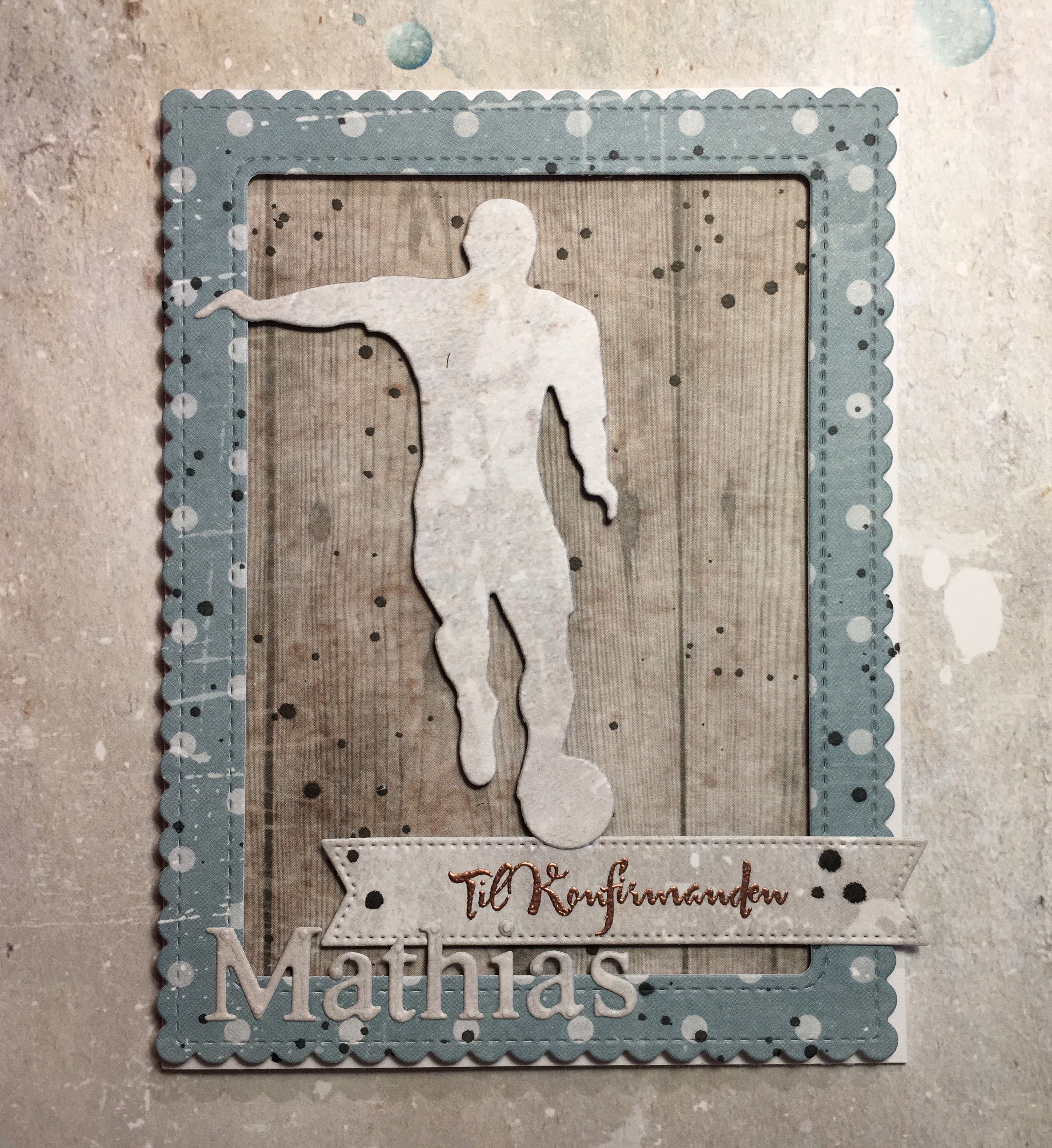 Fodboldspilleren, banneret og bogstaverne er skåret ud i samme mønsterpapir (bagsiden af rammen) - og de er alle fra Dixi. Bogstaverne er helt fantastiske - specielt fordi det er et dansk sæt med æ, ø og å og de fås både med store og små bogstaver. Teksten på banneret er embosset med Wow - Metallic Copper, og herefter har det fået et par splats.