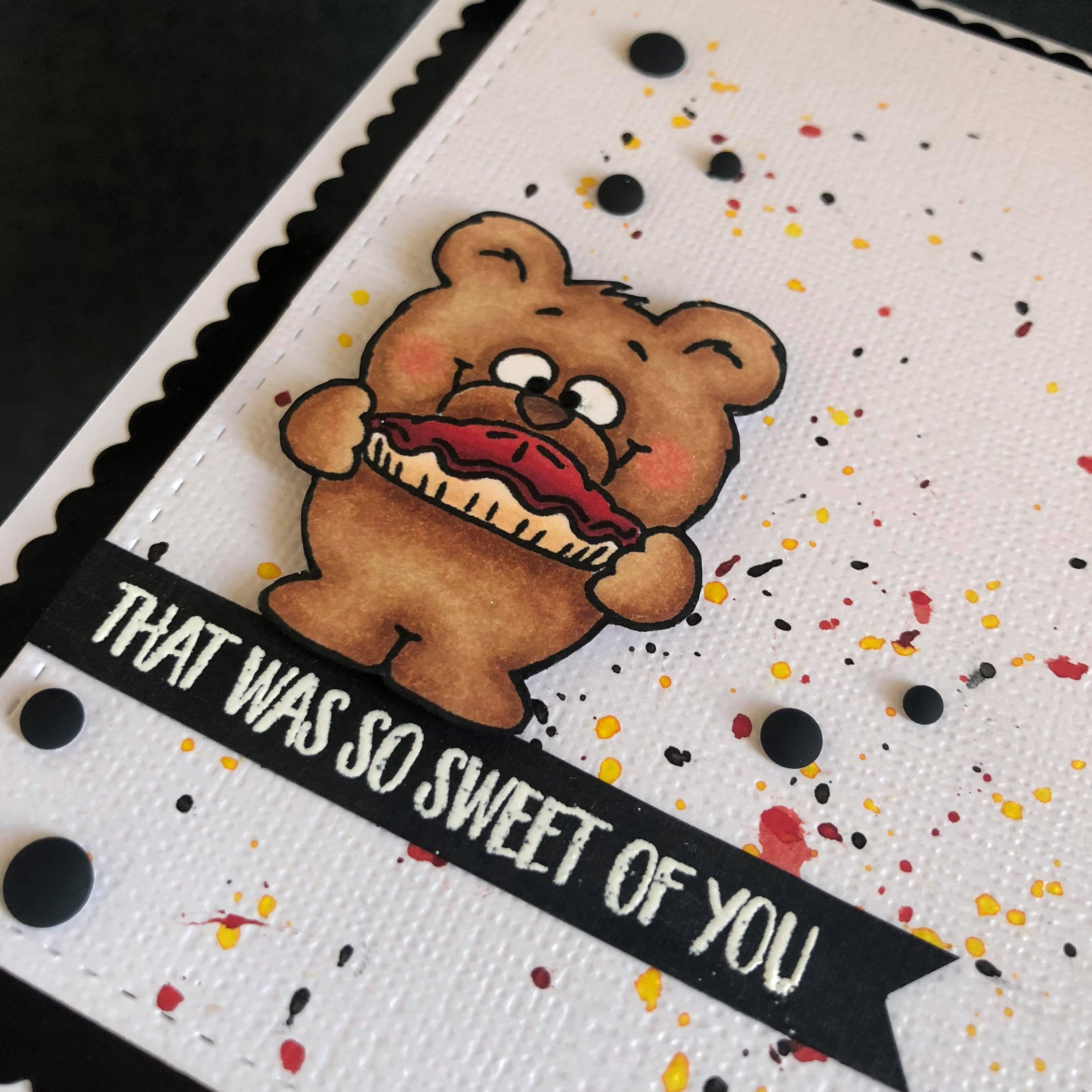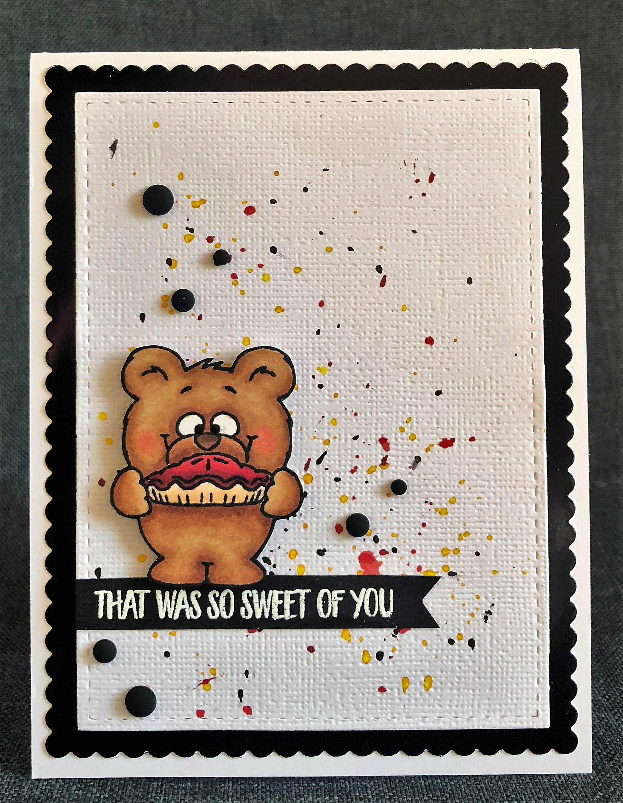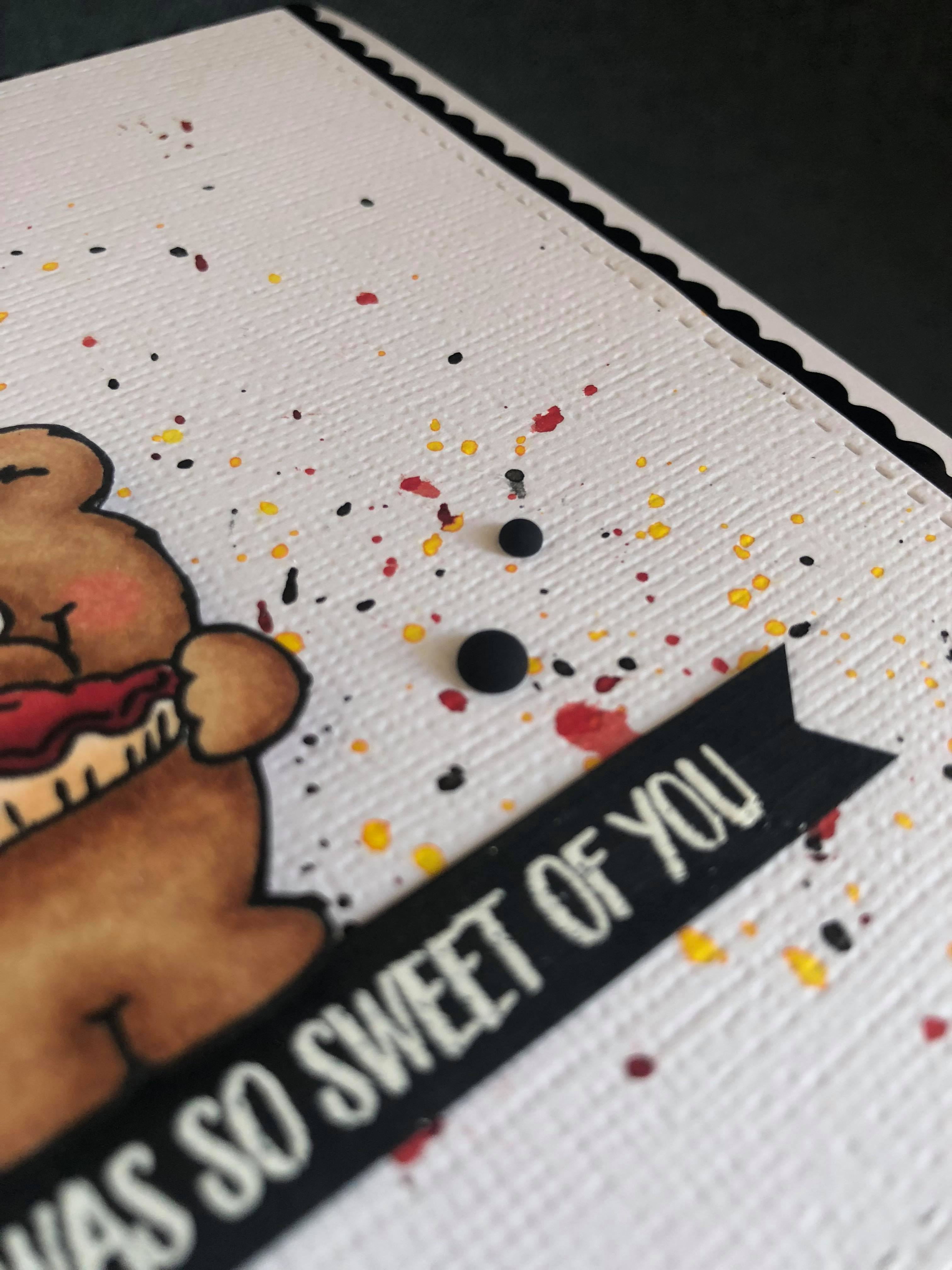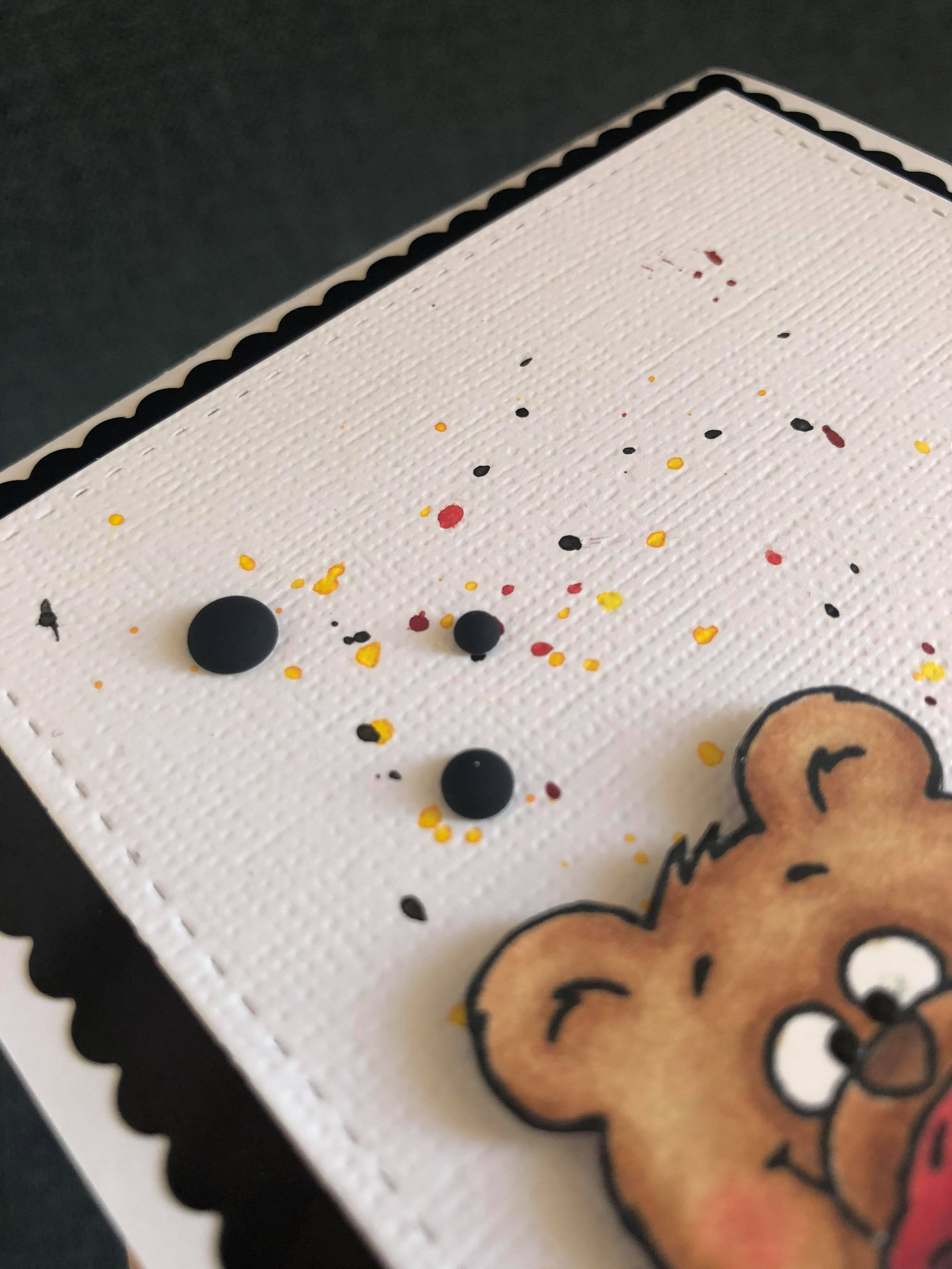 På baggrunden har jeg lavet splats med Dylusion Ink Sprays i farverne Black Marble, Postbox Red og Pure Sunshine.