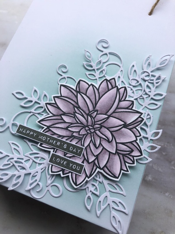 Derefter farvelagde og klippede jeg blomsten ud fra det lækre Dahlia sæt fra Krumspring - Denne satte jeg fast med nogle 3D puder så der stadig var plads til at jeg kunne sætte de små blade og grene fast.