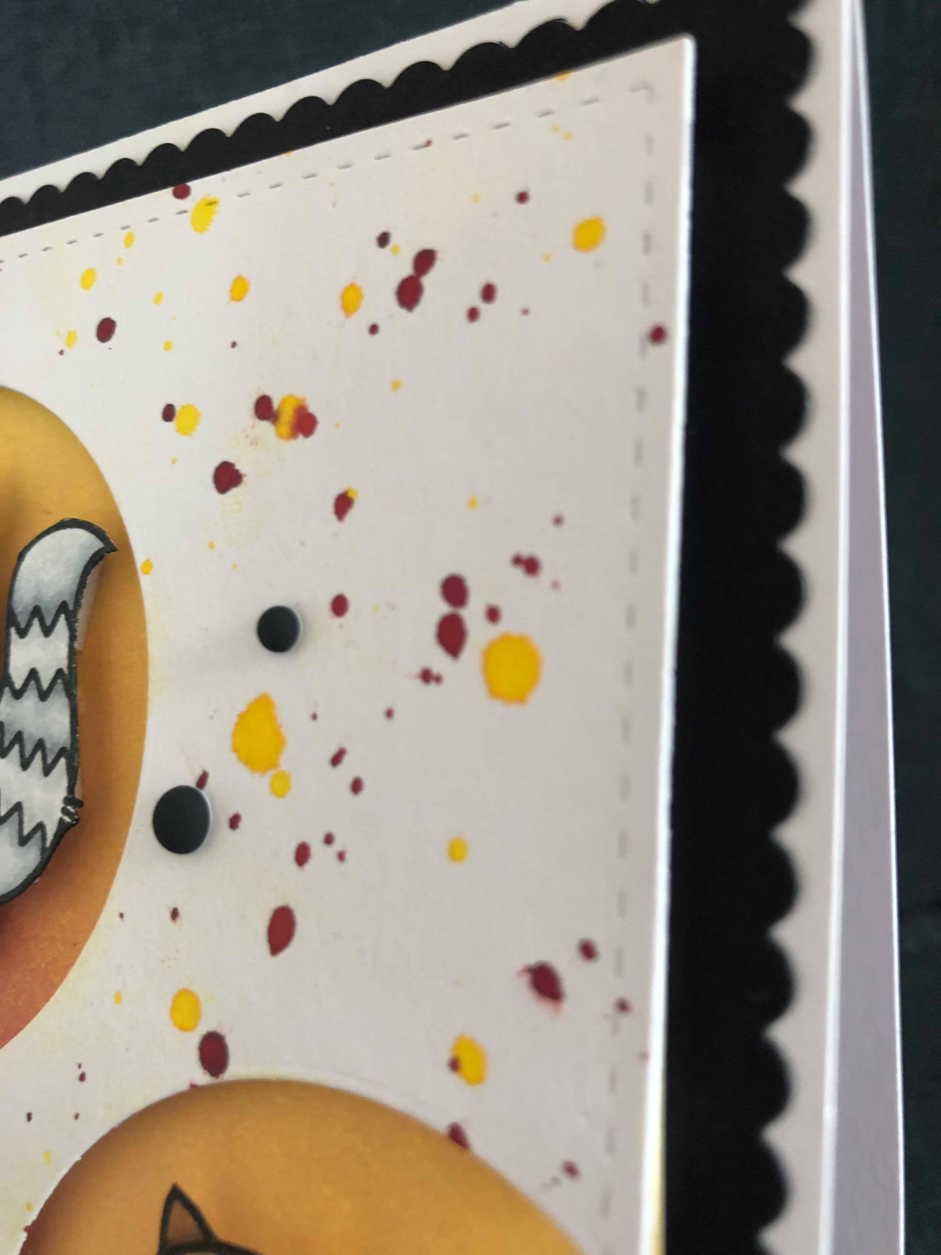 På den hvide baggrund har jeg lavet splats i matchende farver, og har påsat matte sorte enameldots fra Florileges Design. Jeg har påsat baggrunden med 3d tape på arket med de blendede Distress farver.
