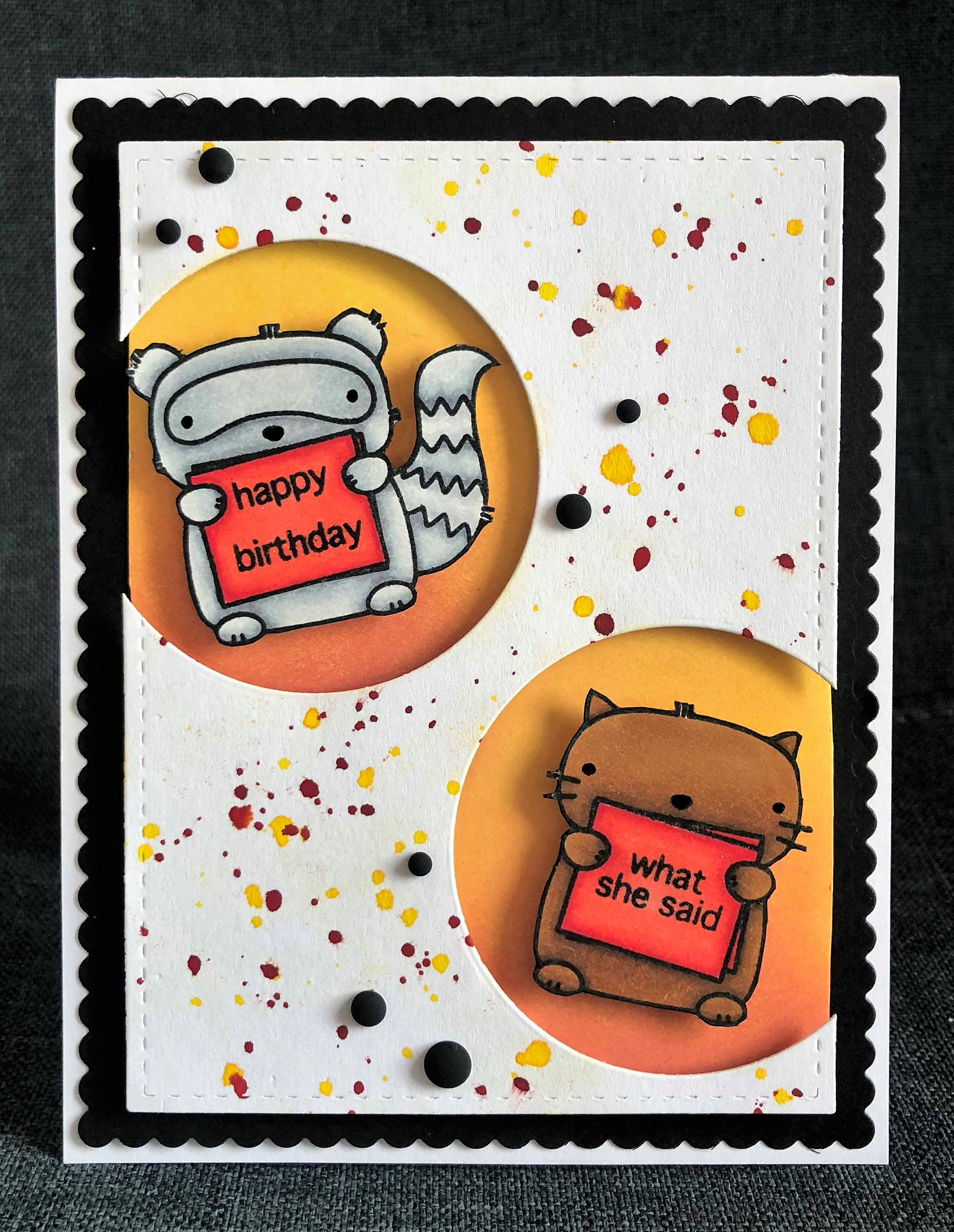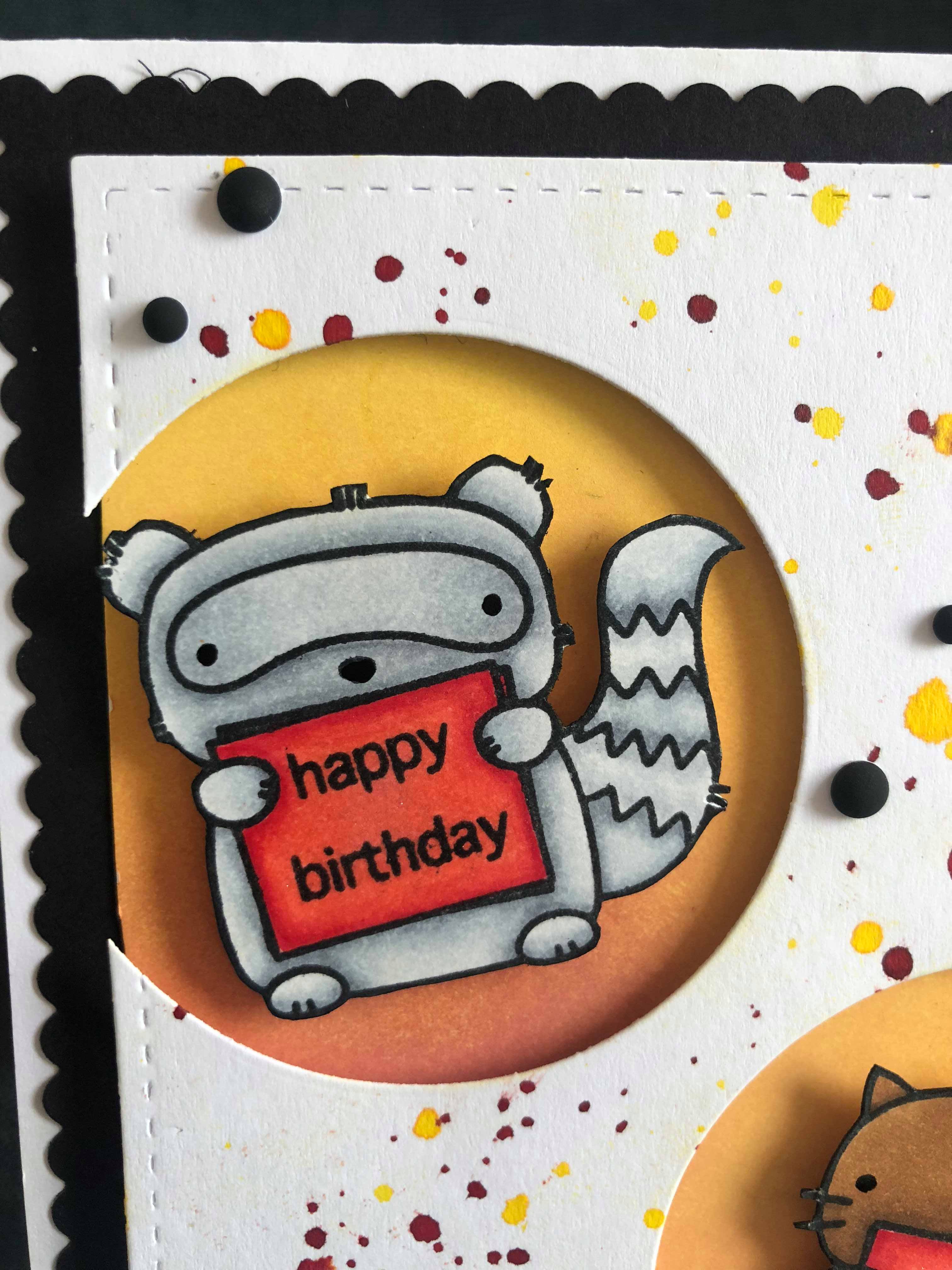 Jeg har altid forskellige farvelagte motiver klar til et hurtigt kort, og denne gang blev det til et fødselsdagkort, hvor jeg også har leget med Distress Oxides og splats.