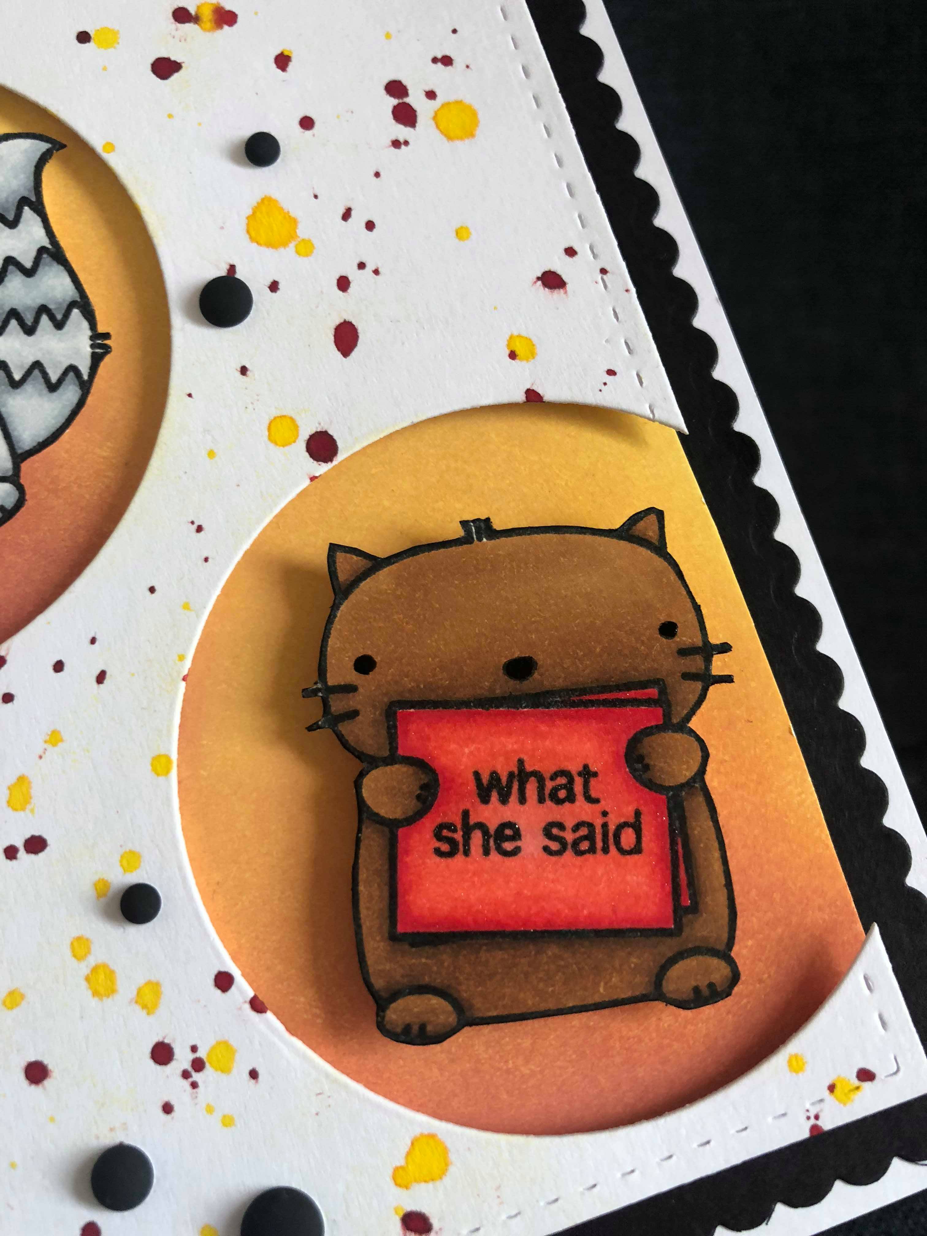 Derefter har jeg også brugt 3d tape til at montere mine stempelmotiver. For at gøre motiverne mere markante har jeg brugt sort Glaze Pen på øjne og næse samt en klar glittertusch på firkanten med teksten.