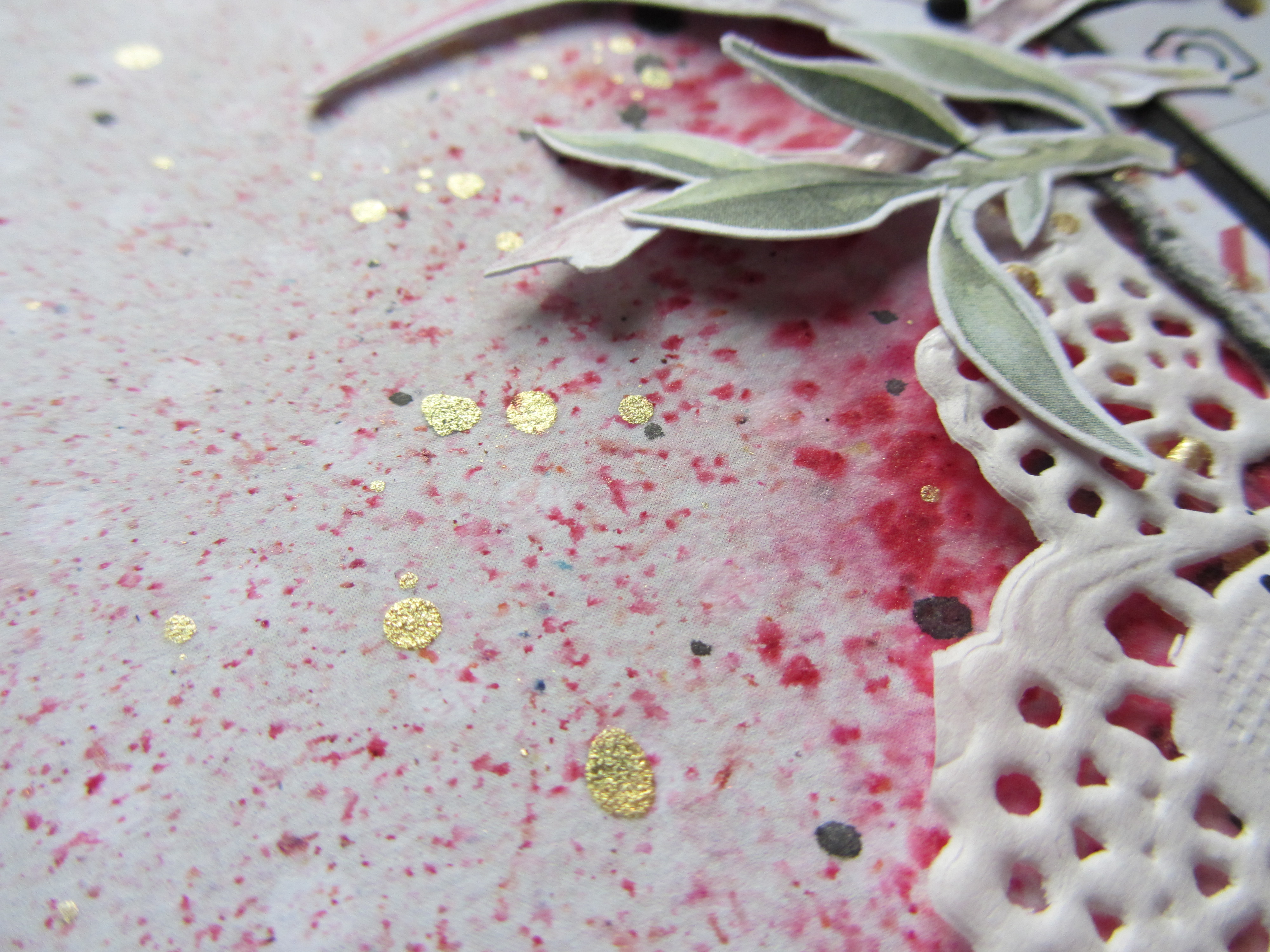 På min baggrund har jeg påført noget Texture Paste fra Ranger gennem en stencil. Da det var tørt, påførte jeg en smule pigment fra Lindys Stamp Gang, som jeg efterfølgende sprøjtede vand på. Der er enormt meget farve i pigmenterne fra Lindys. Til sidst har jeg lavet splats med forskellige mists.