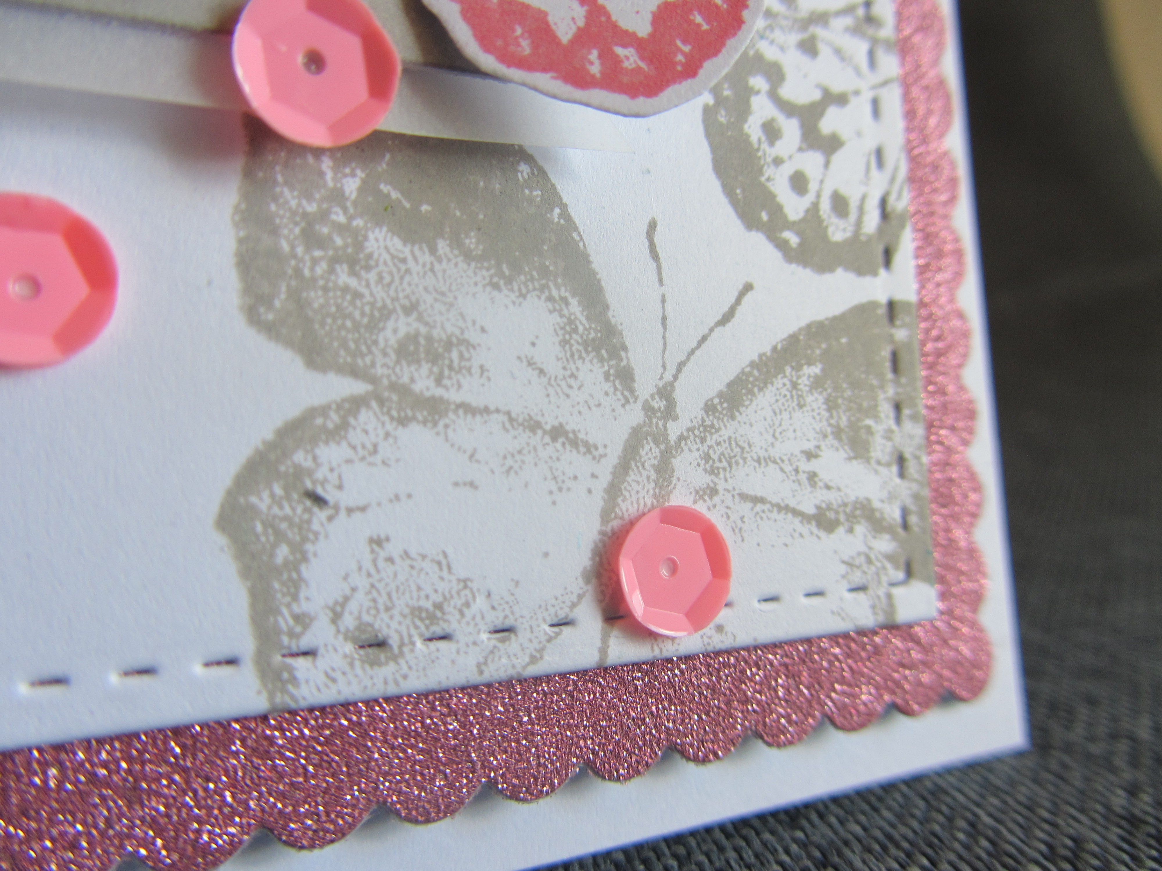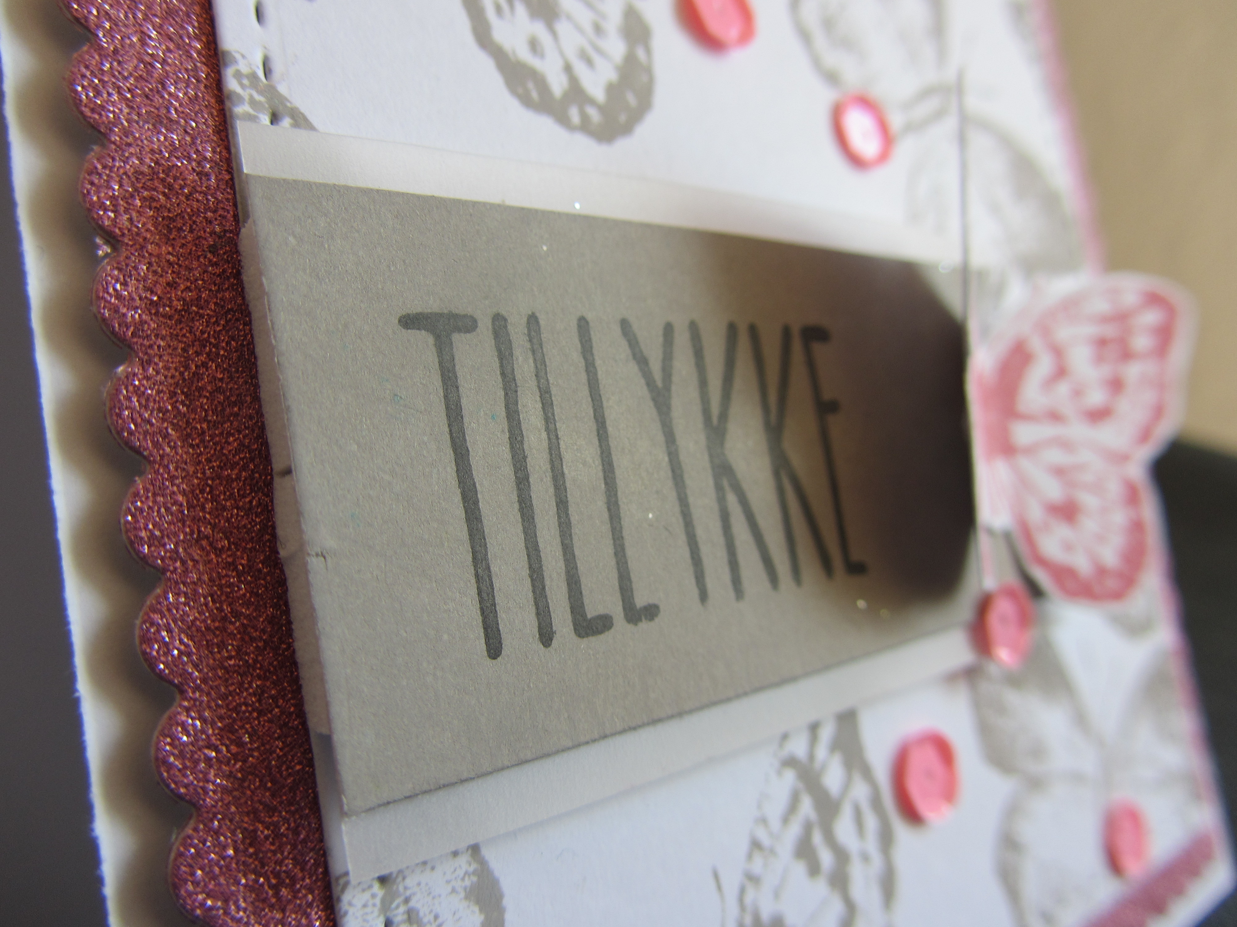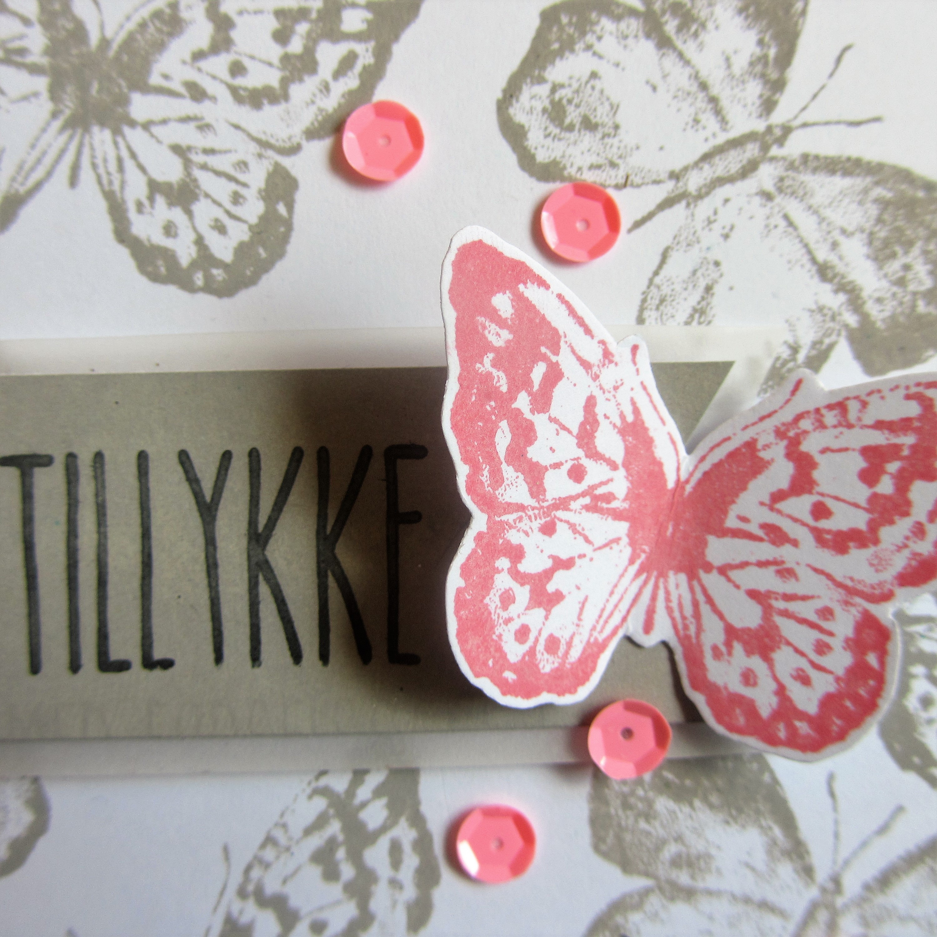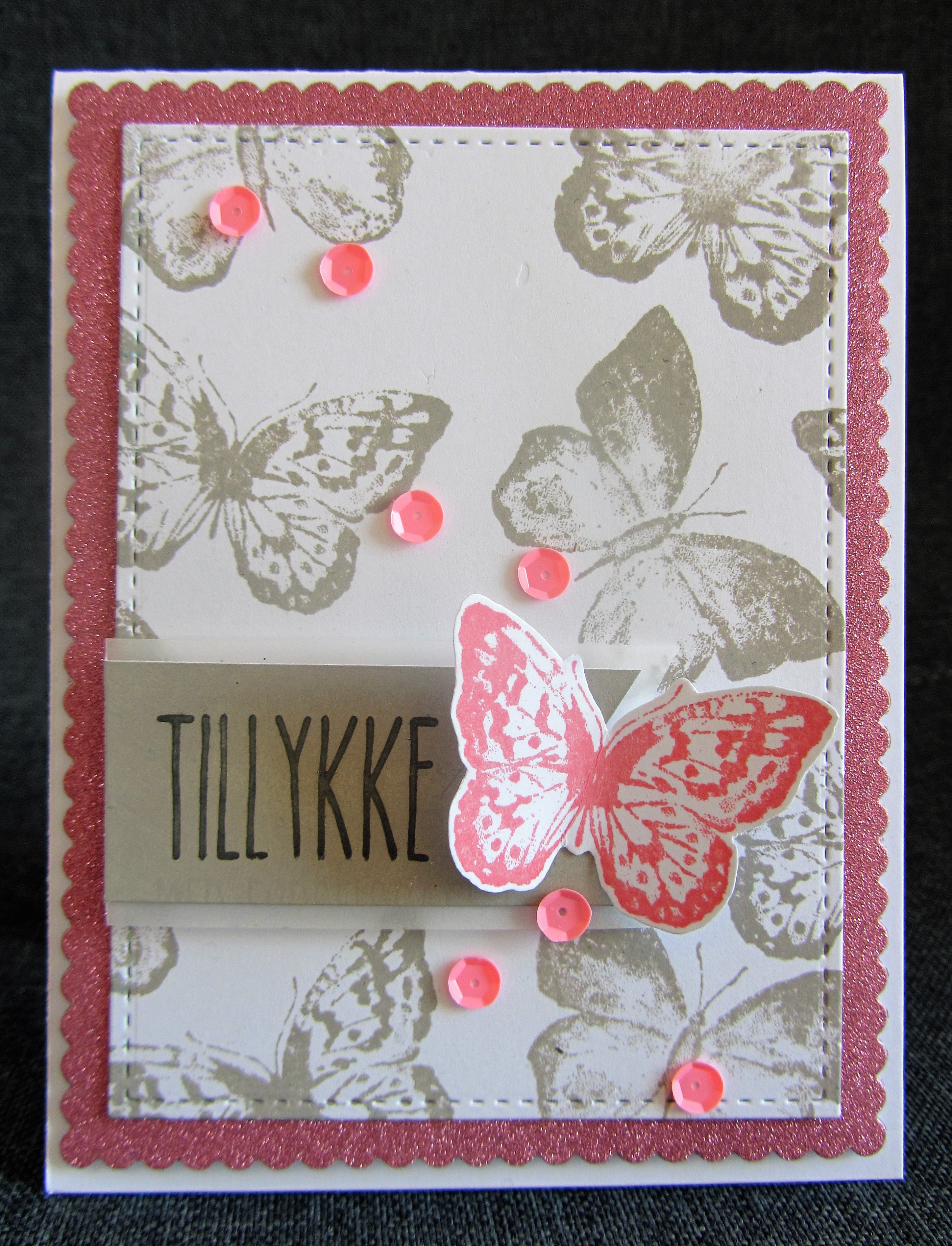 Men en die fra Mama Elephants Basic set har jeg udskåret mit ark med de grå sommerfugle. Motivet med den lyserøde sommerfugl, har jeg klippet ud i hånden.