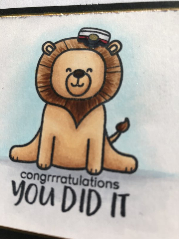 Jeg har startet med at stemple den lille hue fra Mama Elephants Lunar Animals på et stykke Neenah karton og et stykke masking tape. Derefter har jeg klippet min lille mask ud og sat på mit neenah karton - på den måde kunne jeg stemple min løve så det ligner han har huen på. For at få det til at ligne en studenter hue har jeg tegnet nogle ekstra streger så den fik båndet rundt om huen.