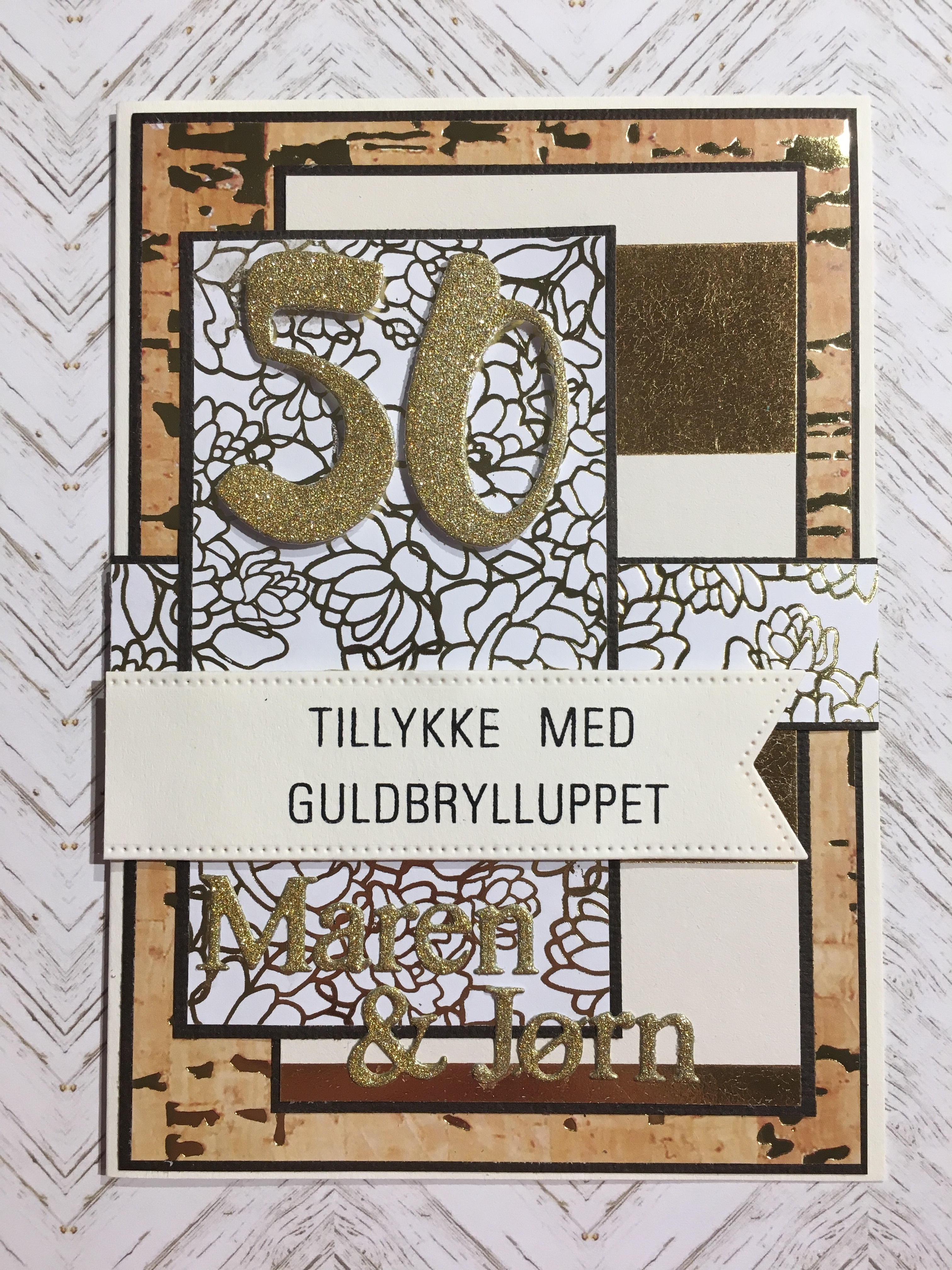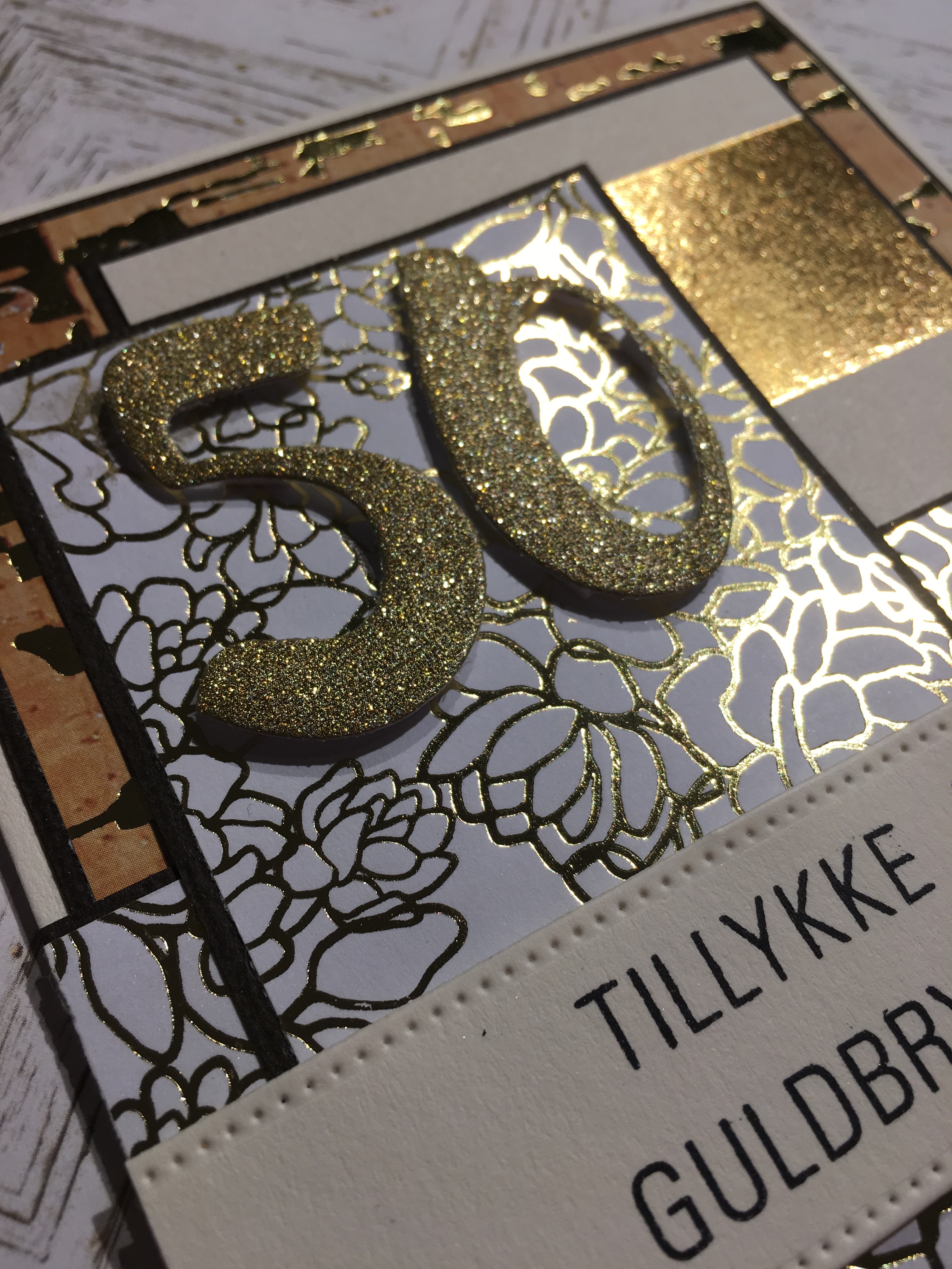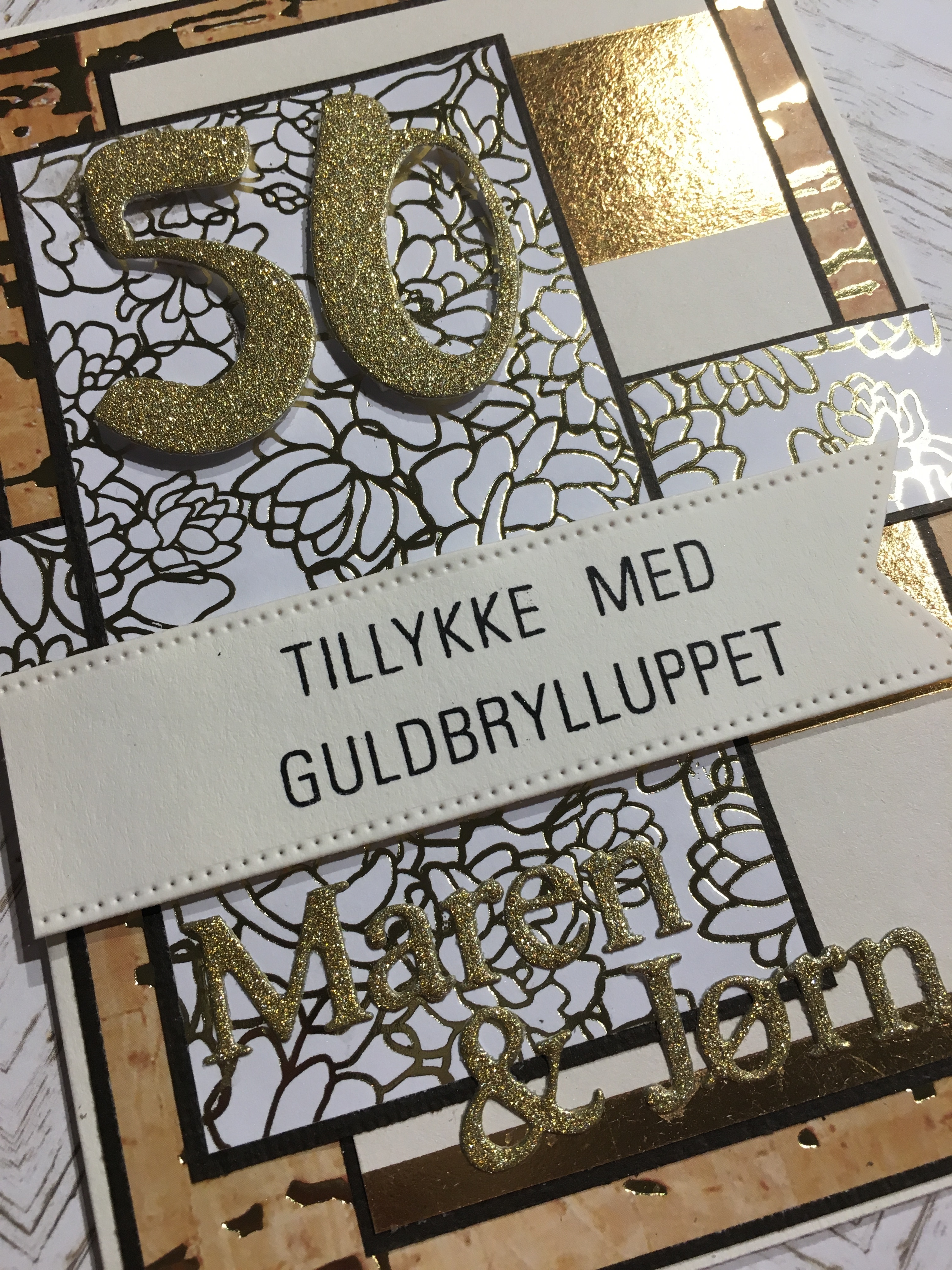Jeg ELSKER guld - så det var himmelsk at få lov til at lave et guldbryllupskort, og her har jeg primært brugt november kittet, hvor der var noget lækkert mønsterpapir i guld.