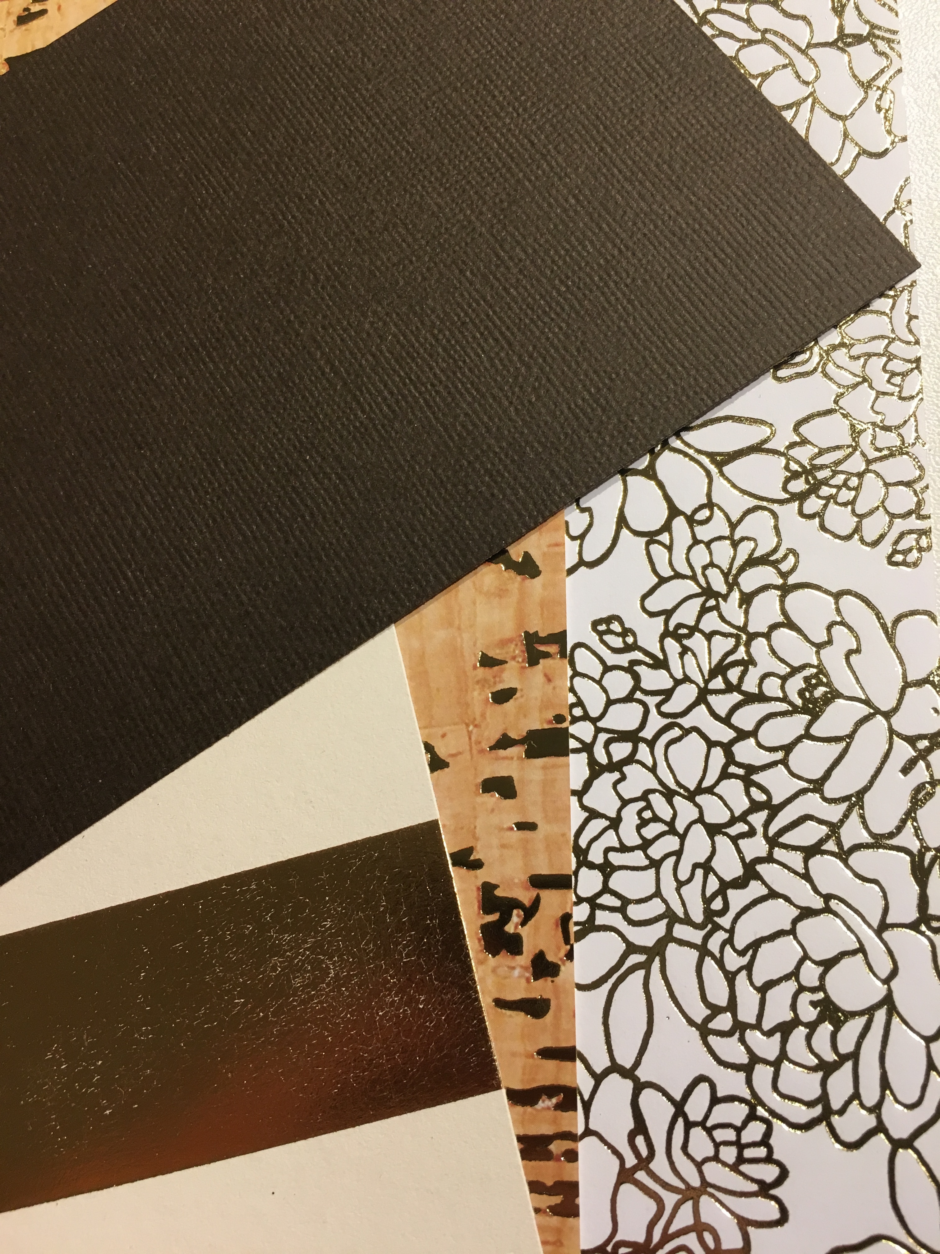 Først jeg har valgt mit mønsterpapir ud - jeg ville lave et kort med 3 forskellig ark mønsterpapir, og for at det ikke bliver alt for forstyrrende er det godt at have noget ensfarvet karton til at skabe ro.