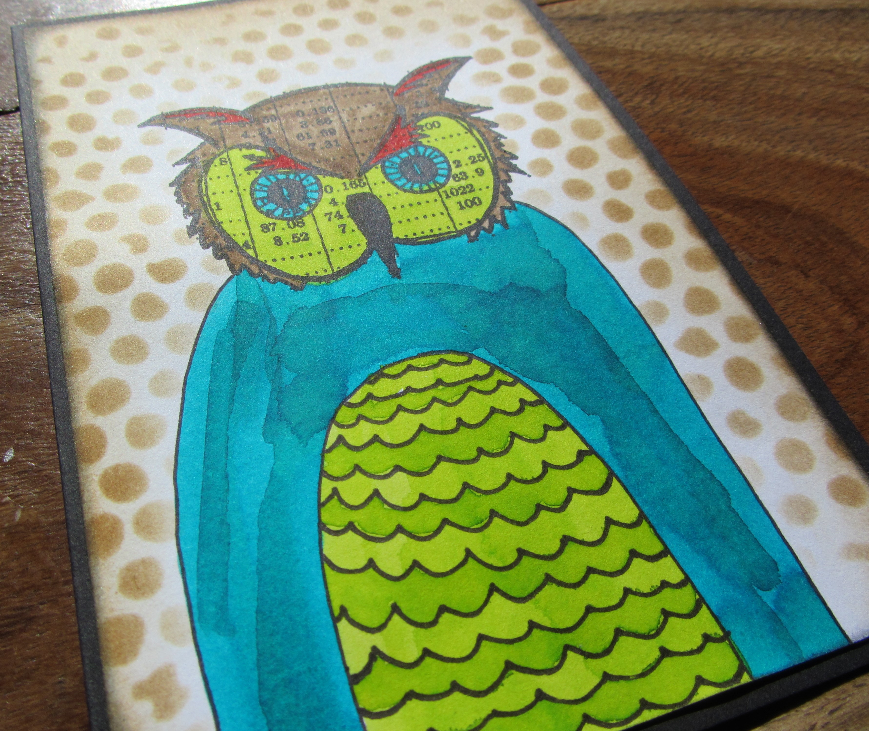 Det første jeg lavede var et kort med uglehovedet... Jeg elsker ugler, så selvfølgelig var det der jeg startede. Kortet er virkelig enkelt. Jeg stemplede hovedet og tegnede en meget simpel krop. Derefter har jeg farvelagt med Dylusions ink og distress ink. Rundt om uglen har jeg brugt en stencil og distress ink.