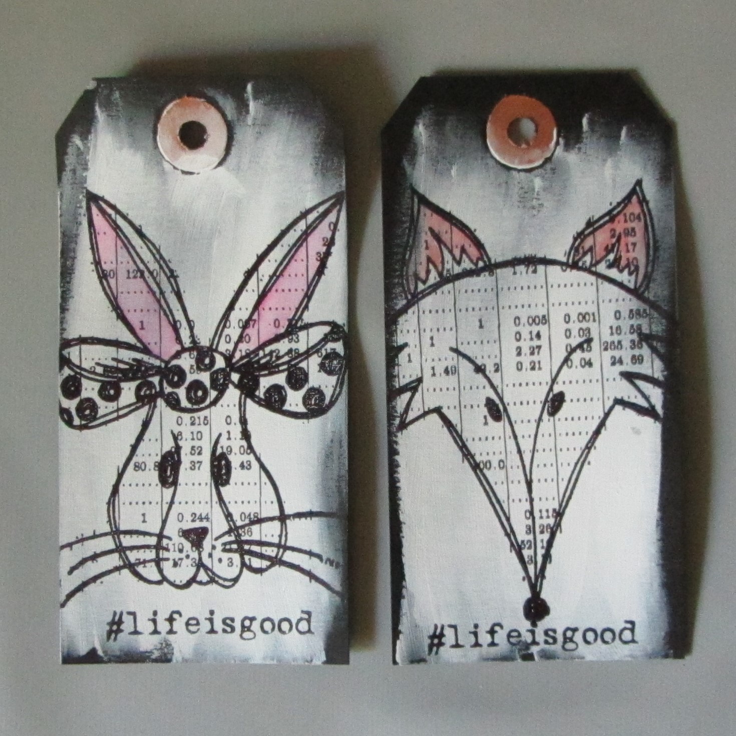 Jeg fik også lavet 2 tags. Det er sorte tags der har fået et lag gesso. Derefter har jeg stemplet hovederne og farvelagt en smule med Distress Oxide. Jeg var ret begejstret for det sort/hvide, så det var kun ørerne der fik lidt farve her.