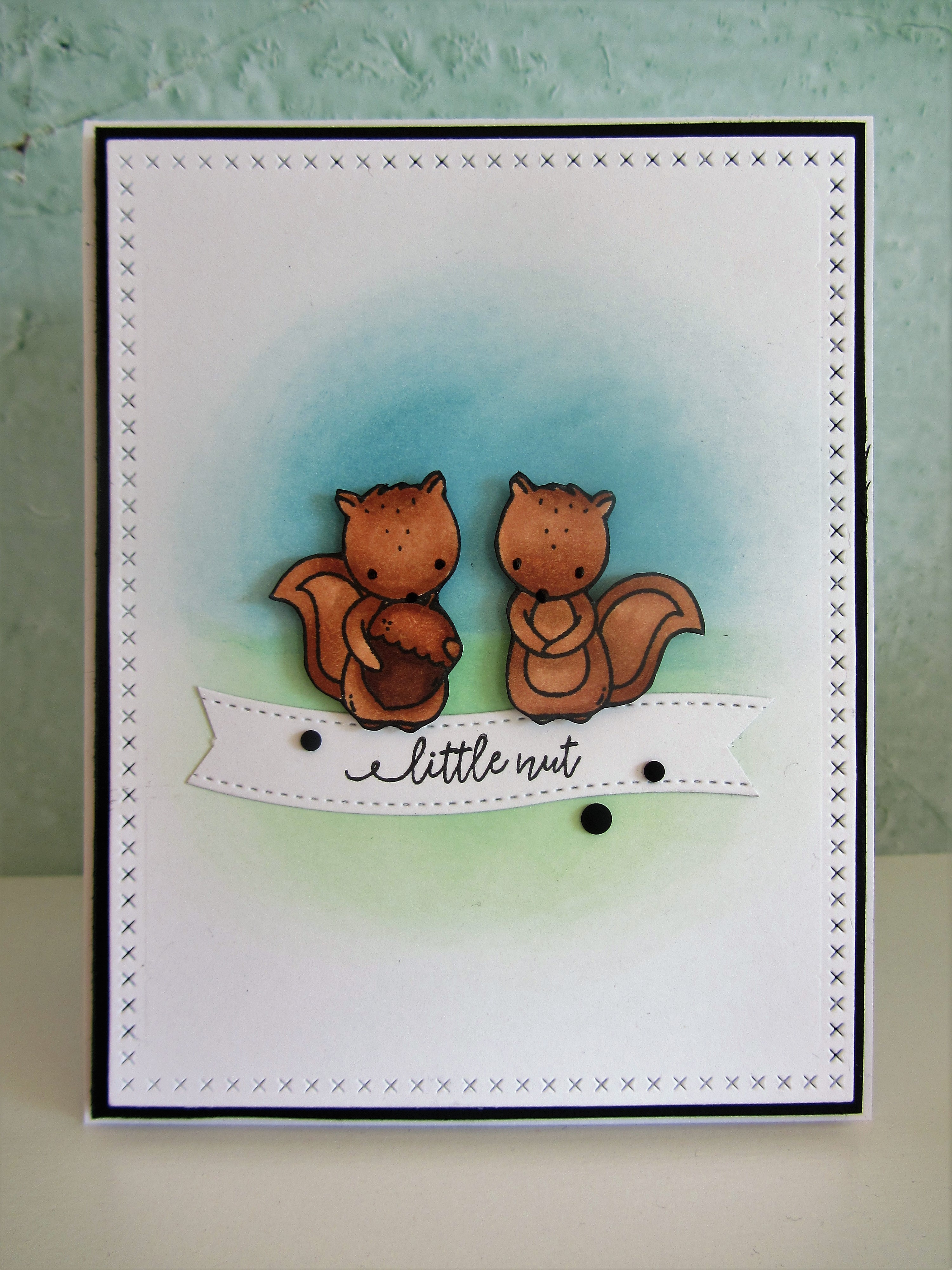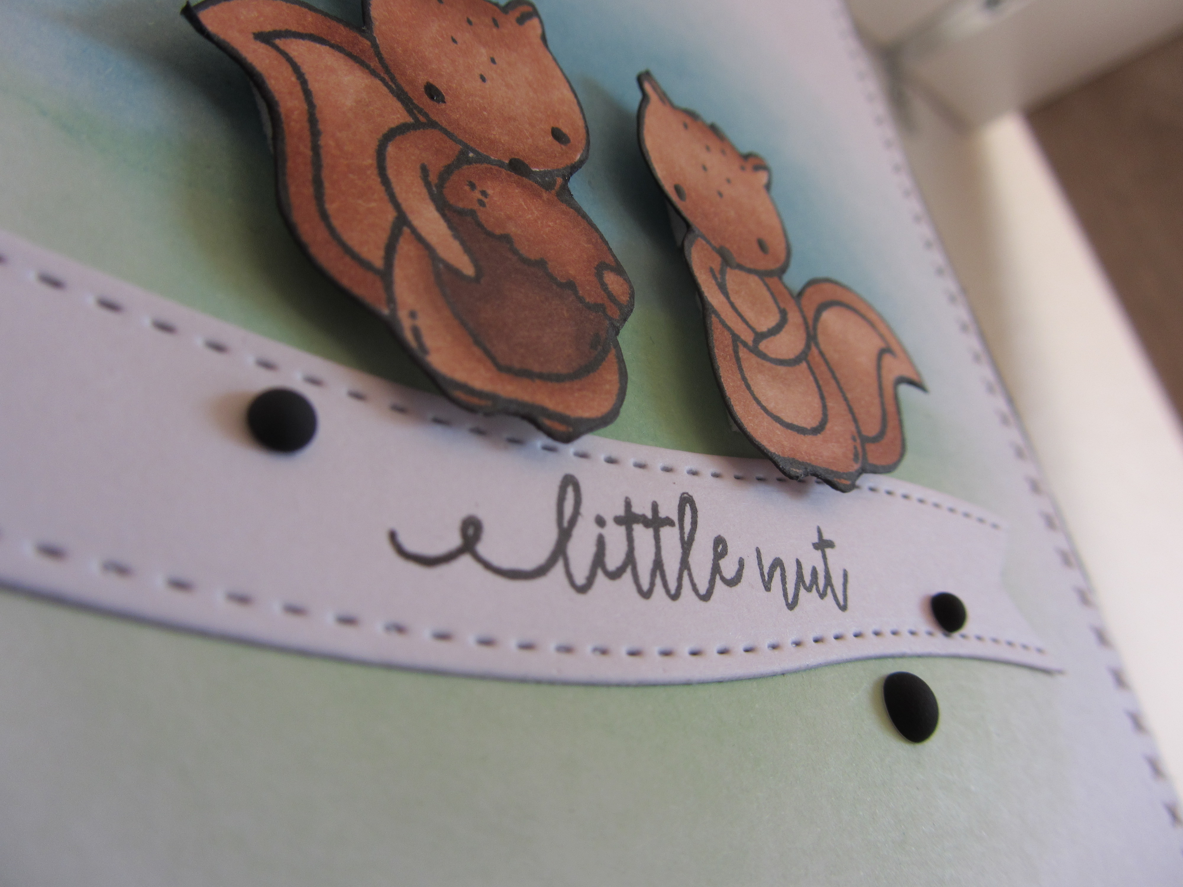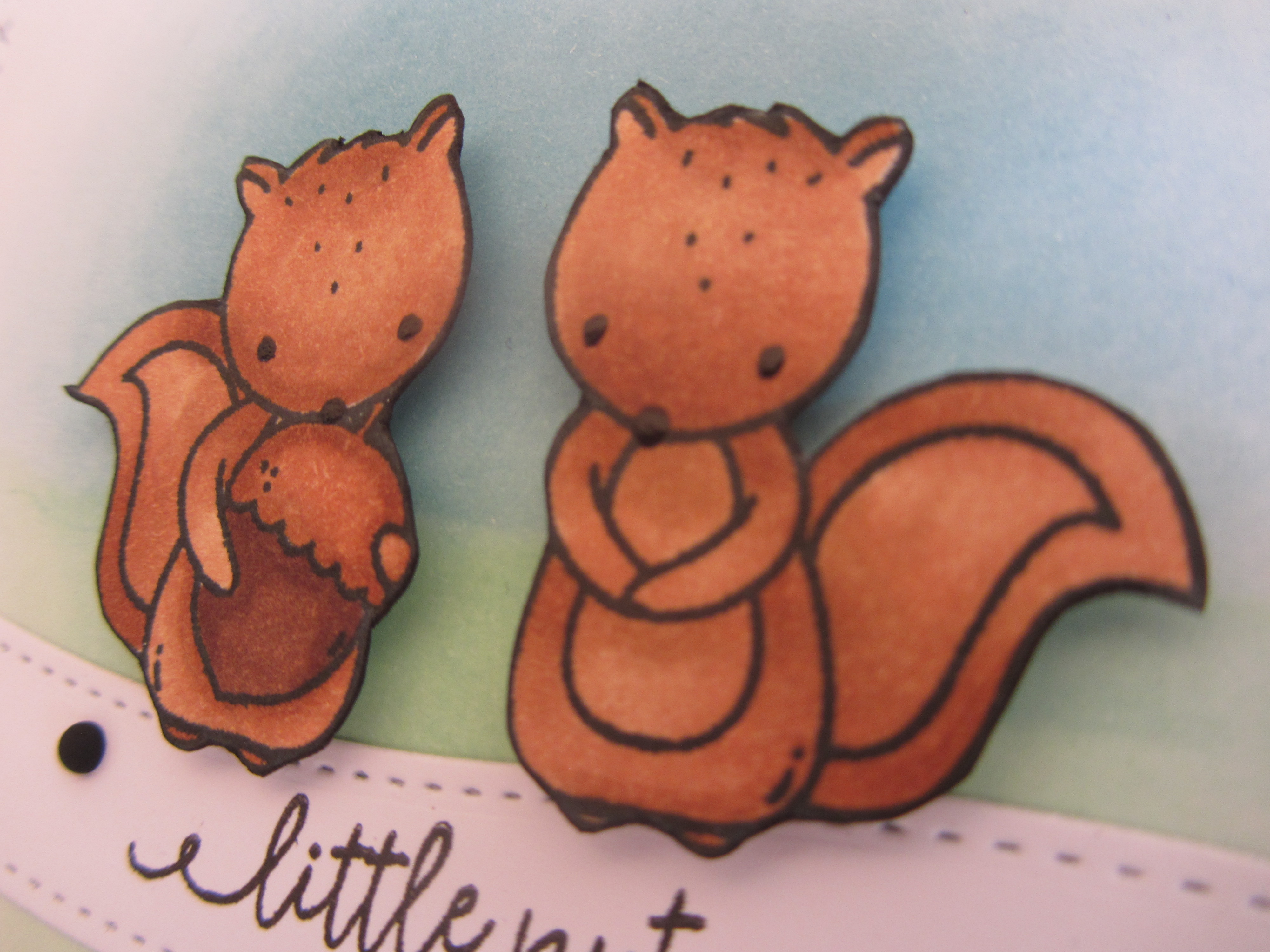 De søde egern er stemplet på Neenah karton med Memento sværte og farvelagt med Copics. De skal symbolisere et forældrepar med deres lille "nød".