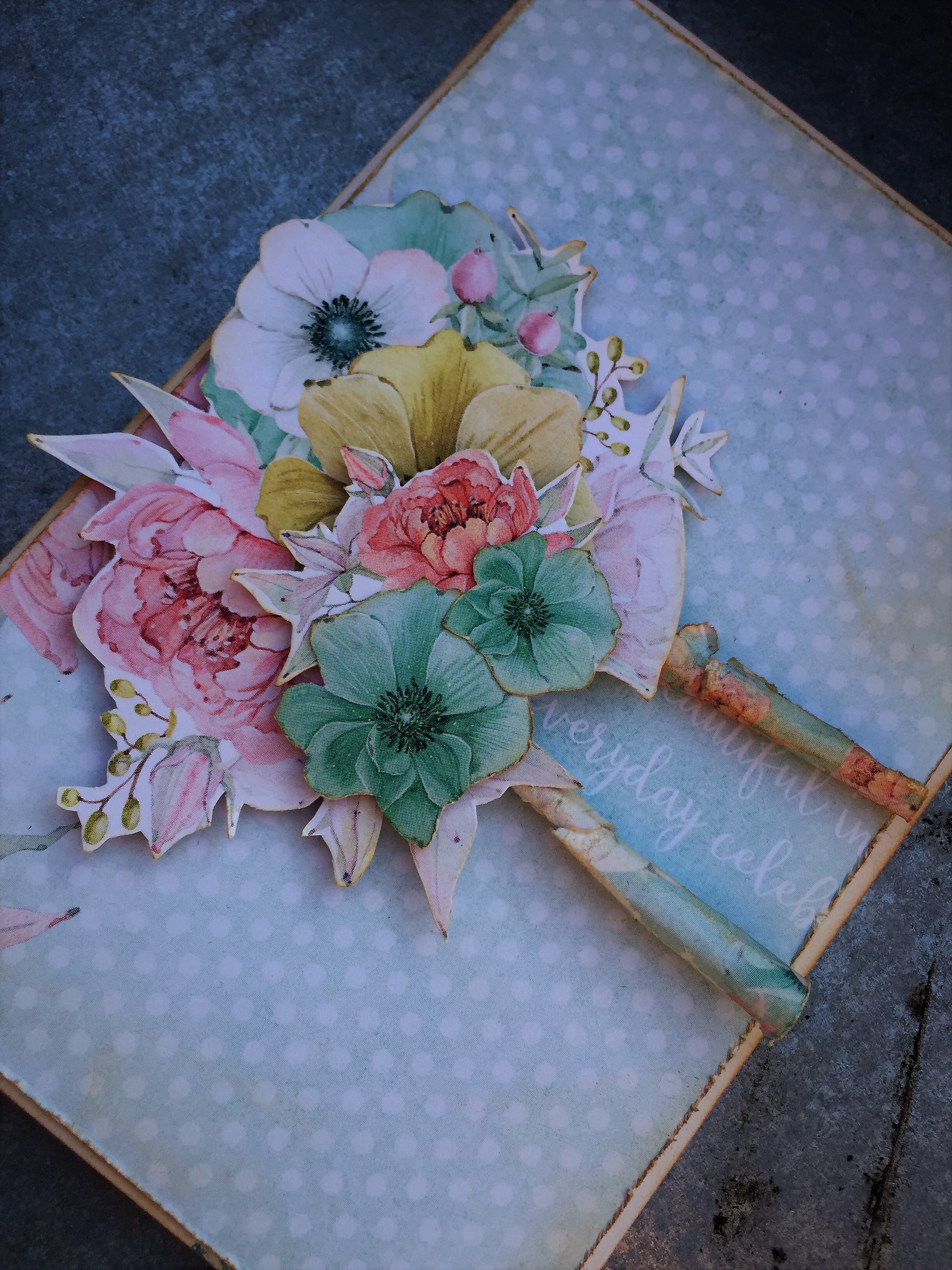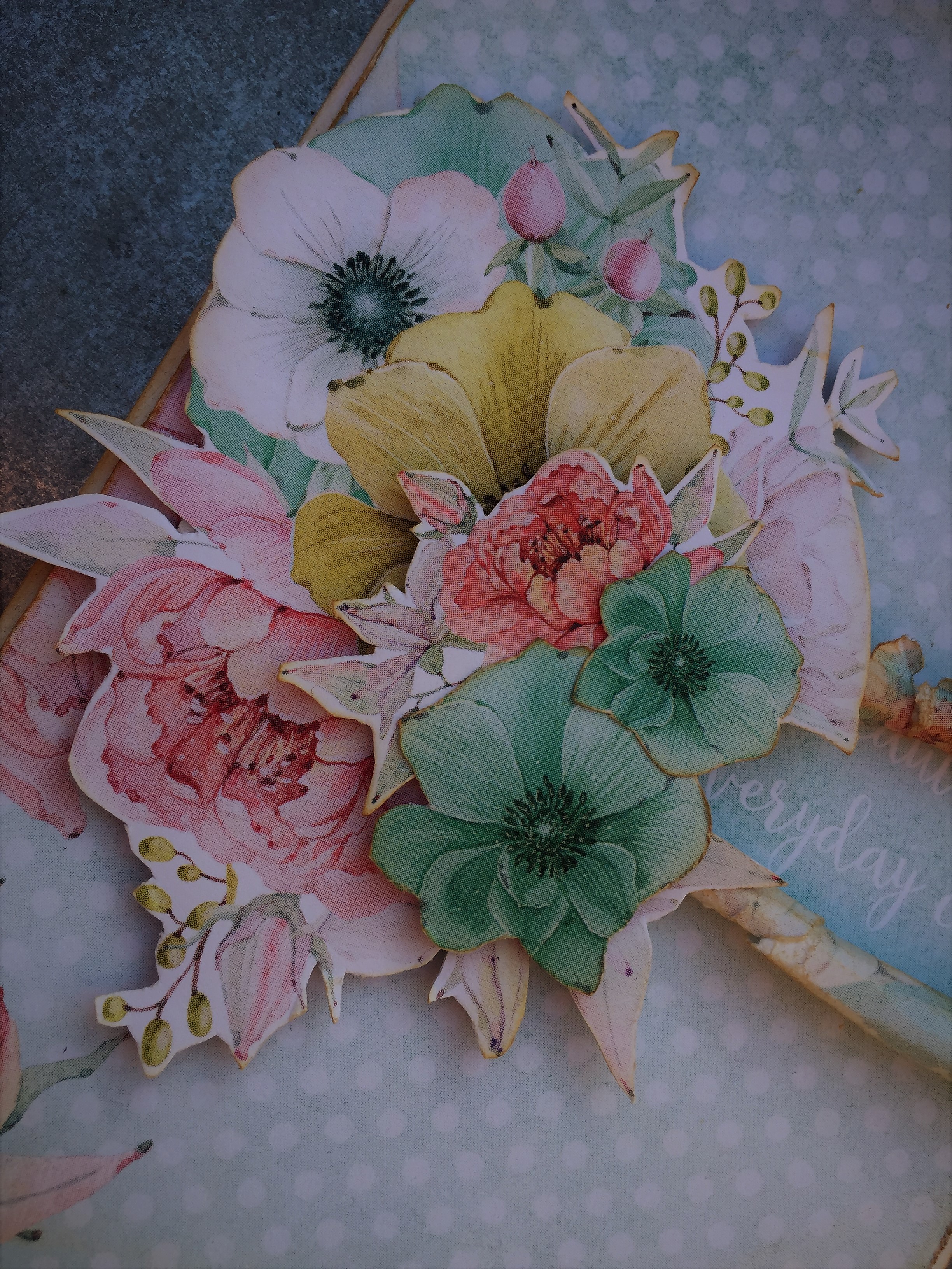 Pynten er et hav af blomster, som er klippet ud af klippearket. De er sat på med masser af 3D puder for at skabe højde og lagpålag. Jeg har lavet blomsterne i 4 lag og stukket grene mm ind i bunden.