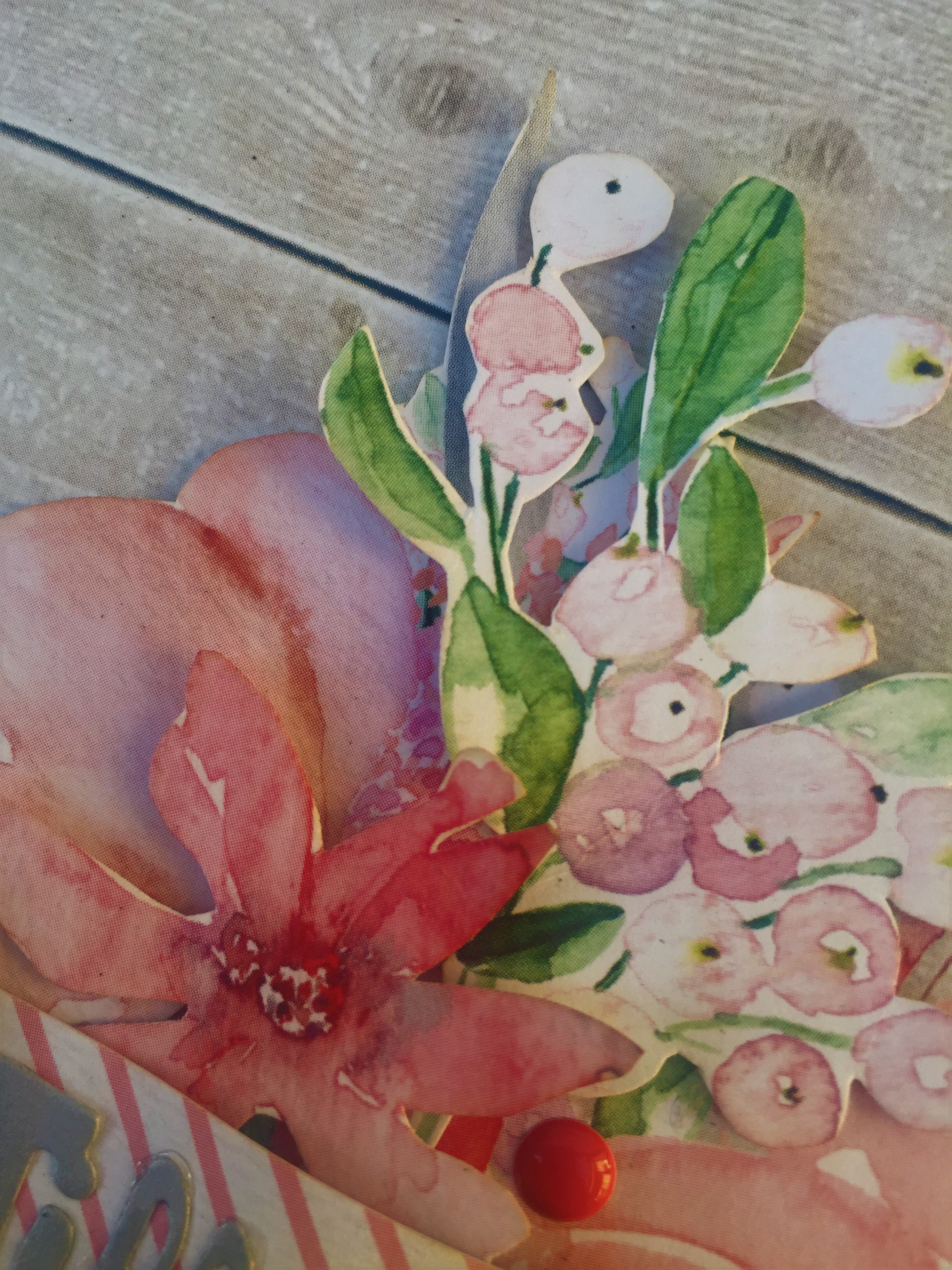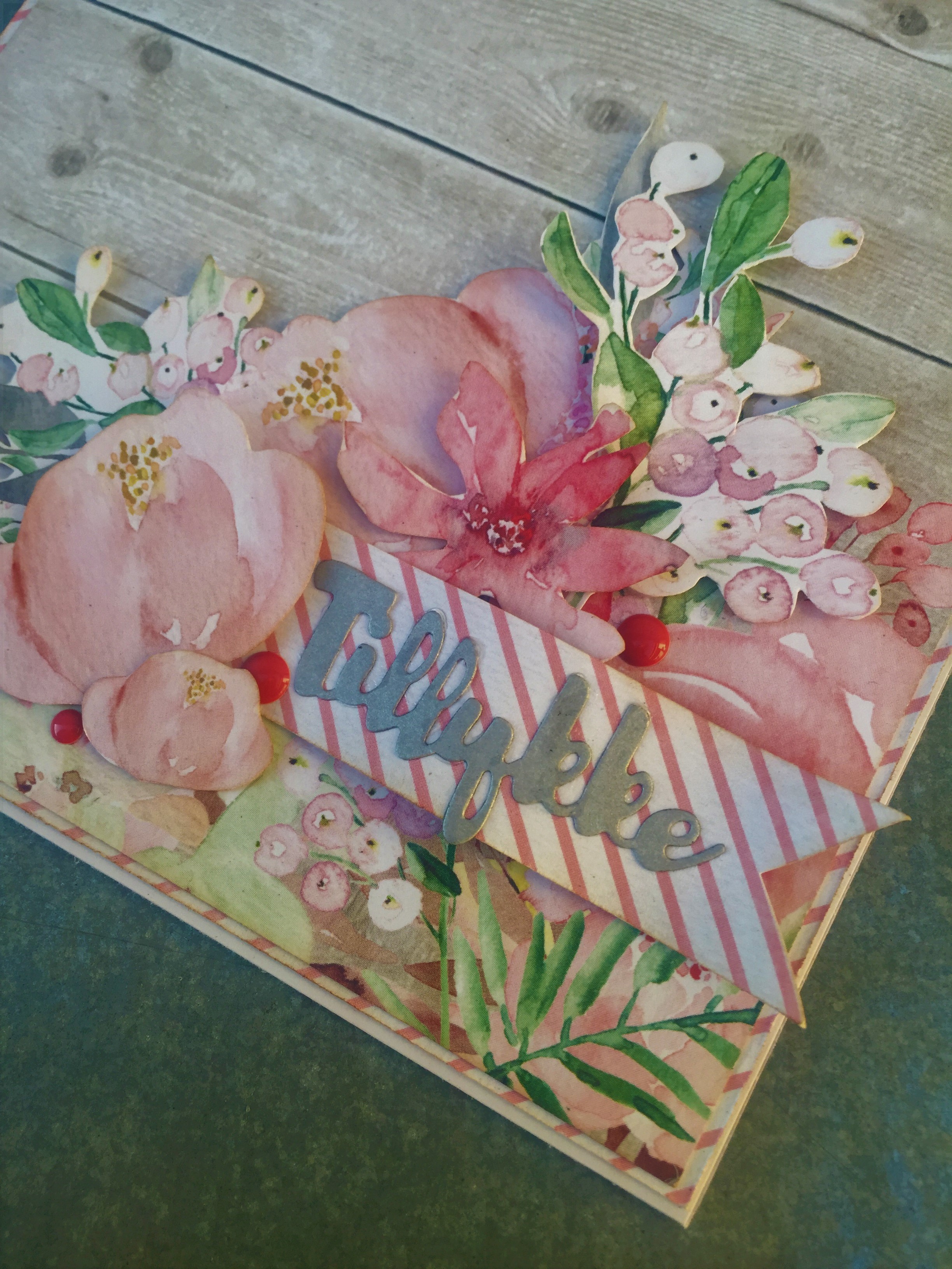 Kortet er dekoreret med udklippede blomster fra kklippearket, emaljedots og små sølvsten fra gemmerne. Alle de klippede blomster er sat på 3D puder.