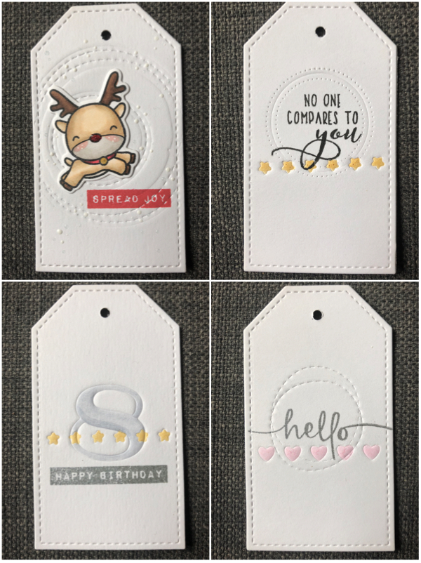Jeg skar mine tags ud på min sidekick og embossede derefter detaljer i fra forskellige die sæt. Nogle af dem gav jeg lidt farve for at fremhæve dem, eller satte et farvelagt billede henover.