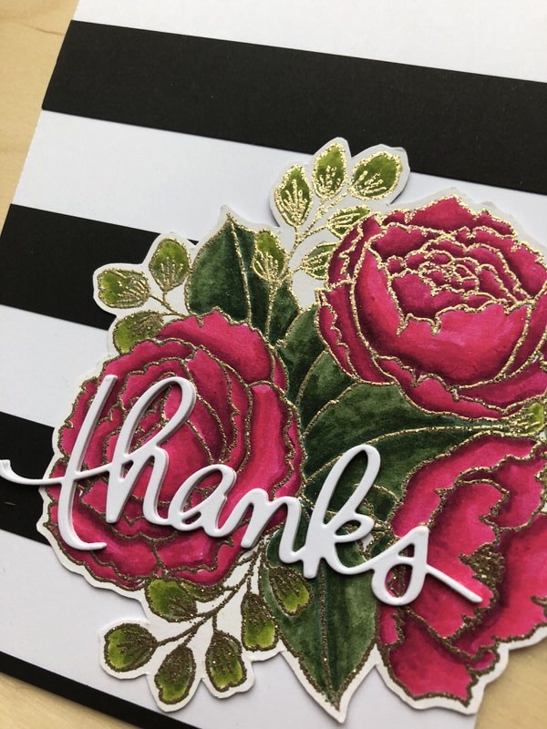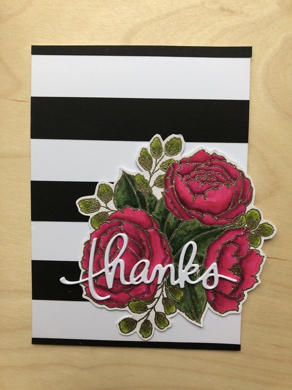 Derefter klippede jeg mine blomster ud og limede dem på mit sort stribede kort. Teksten er skåret ud med en Mama Elephant Script Thanks die 4 gange, sat oven på hianden og endelig over blomsten.
