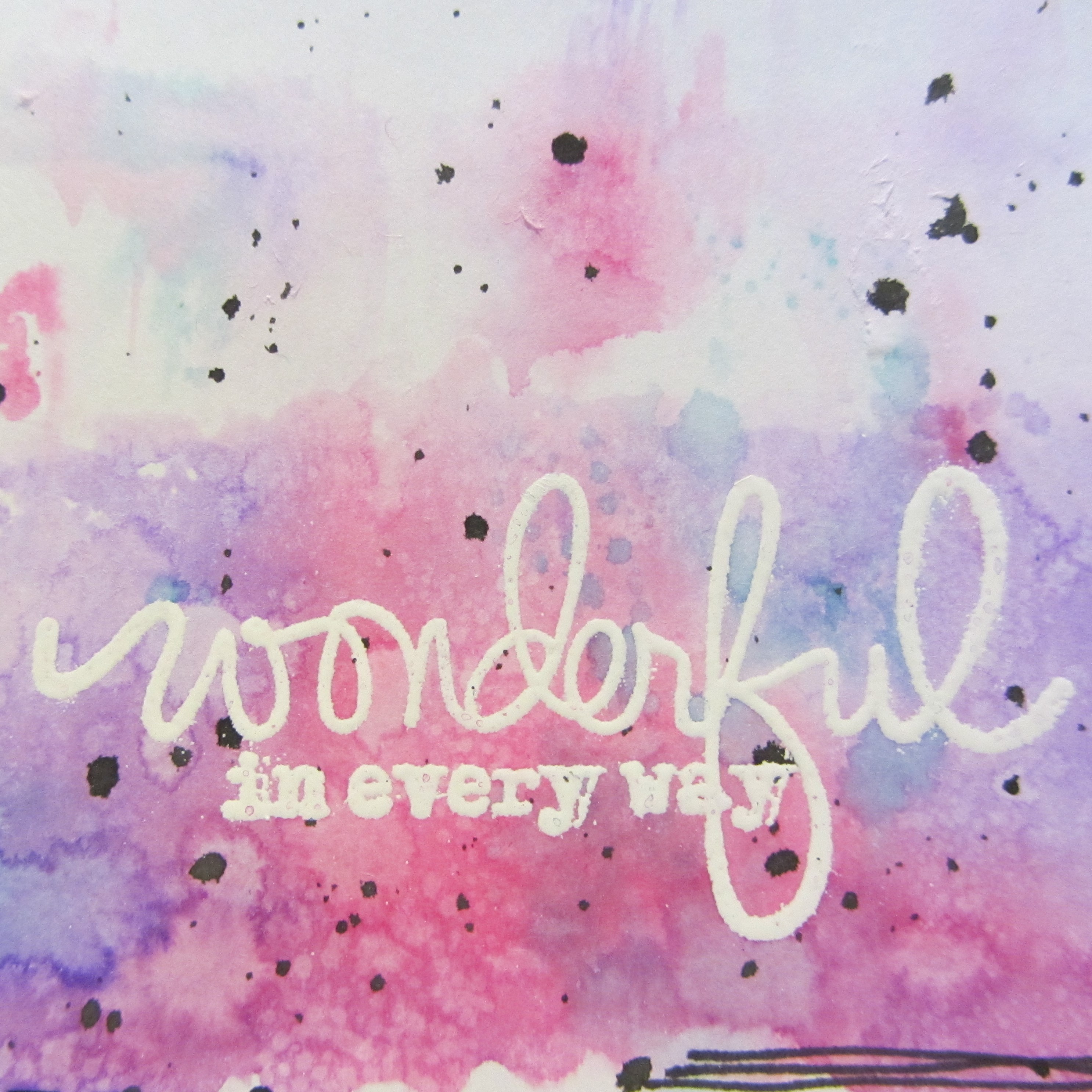 På kortet her har jeg startet med at heatembosse mit stempel med hvidt embossingpulver. Derefter har jeg trykket lilla og lyserød Distress ink ud på mit underlag, sprayet lidt vand på og dyppet mit karton i farven. Jeg tørrede mit Distress ink med varmepistolen og under tørringen lavede jeg lidt vandsplats på farven for at give lidt mere effekt. Da de to farver var tørre syntes jeg der manglede lidt, så jeg tog en smule blå farve og gjorde det en gang til med den blå.