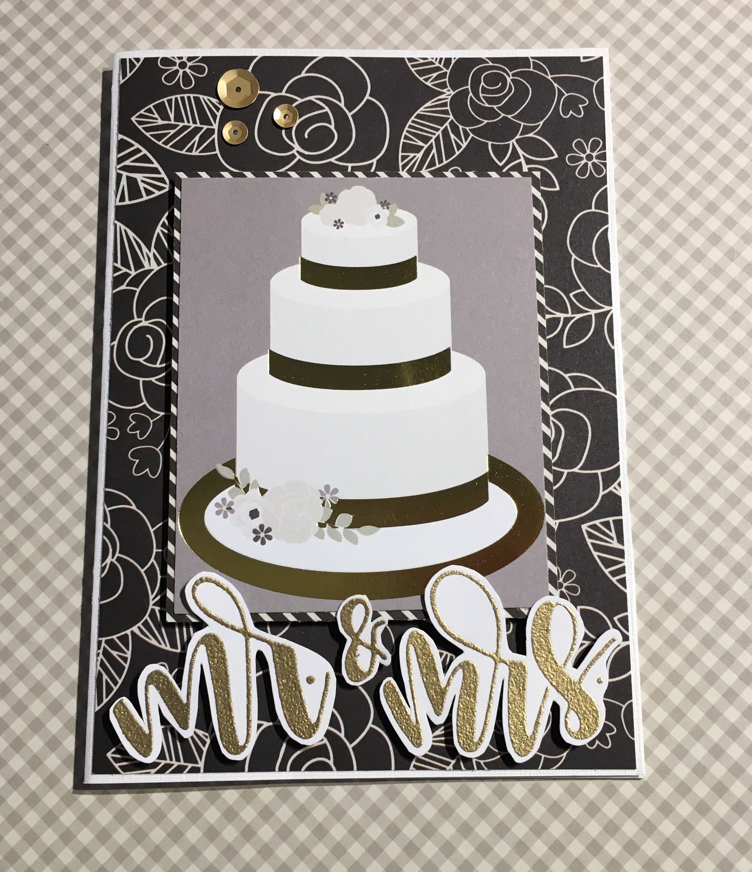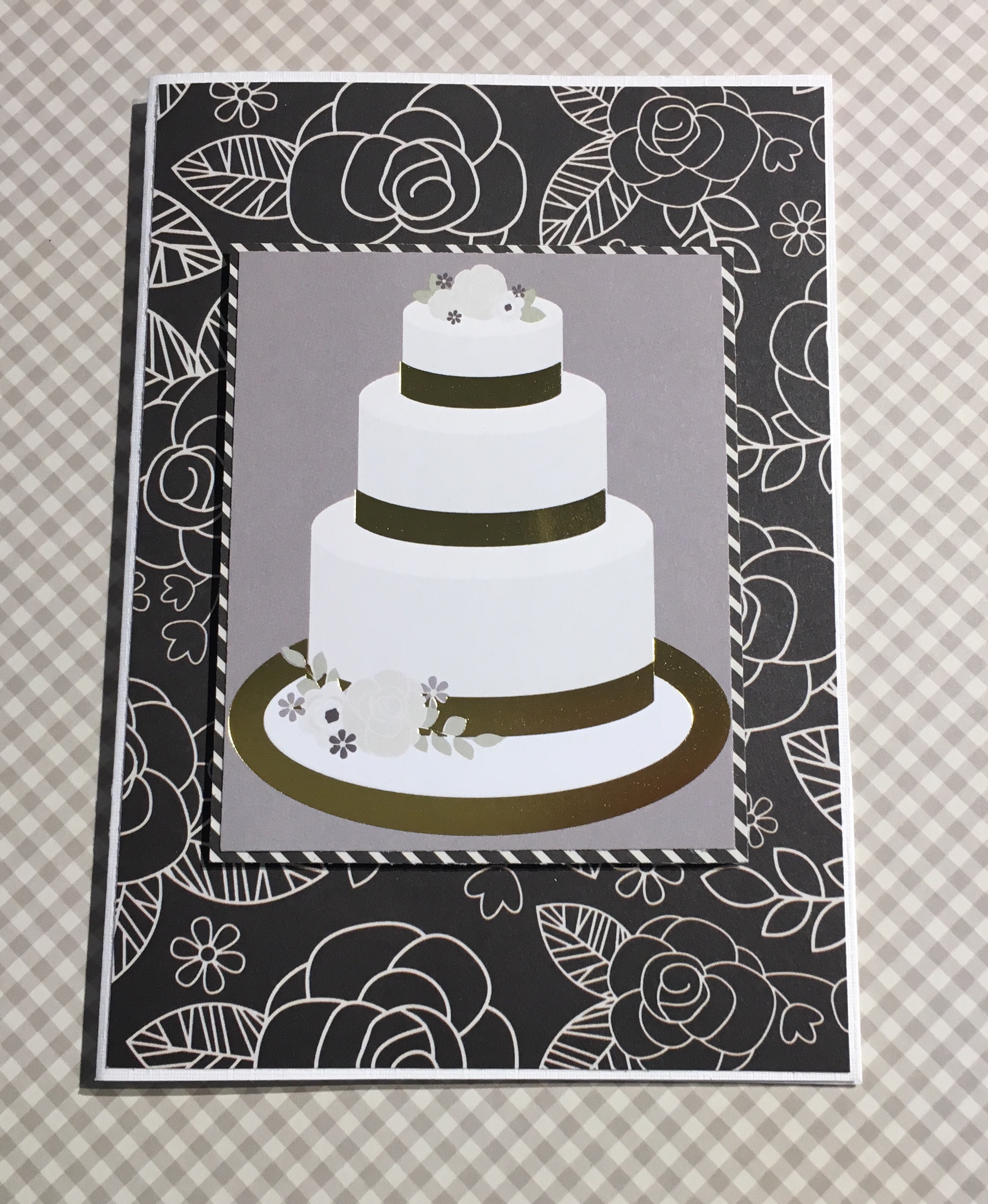 Jeg har skåret bryllupskagen lidt til i størrelsen og brugt bagsiden af samme papir til baggrund bag kagen. Det giver ro. Tilmed har jeg hævet kagen med 3D-puder.