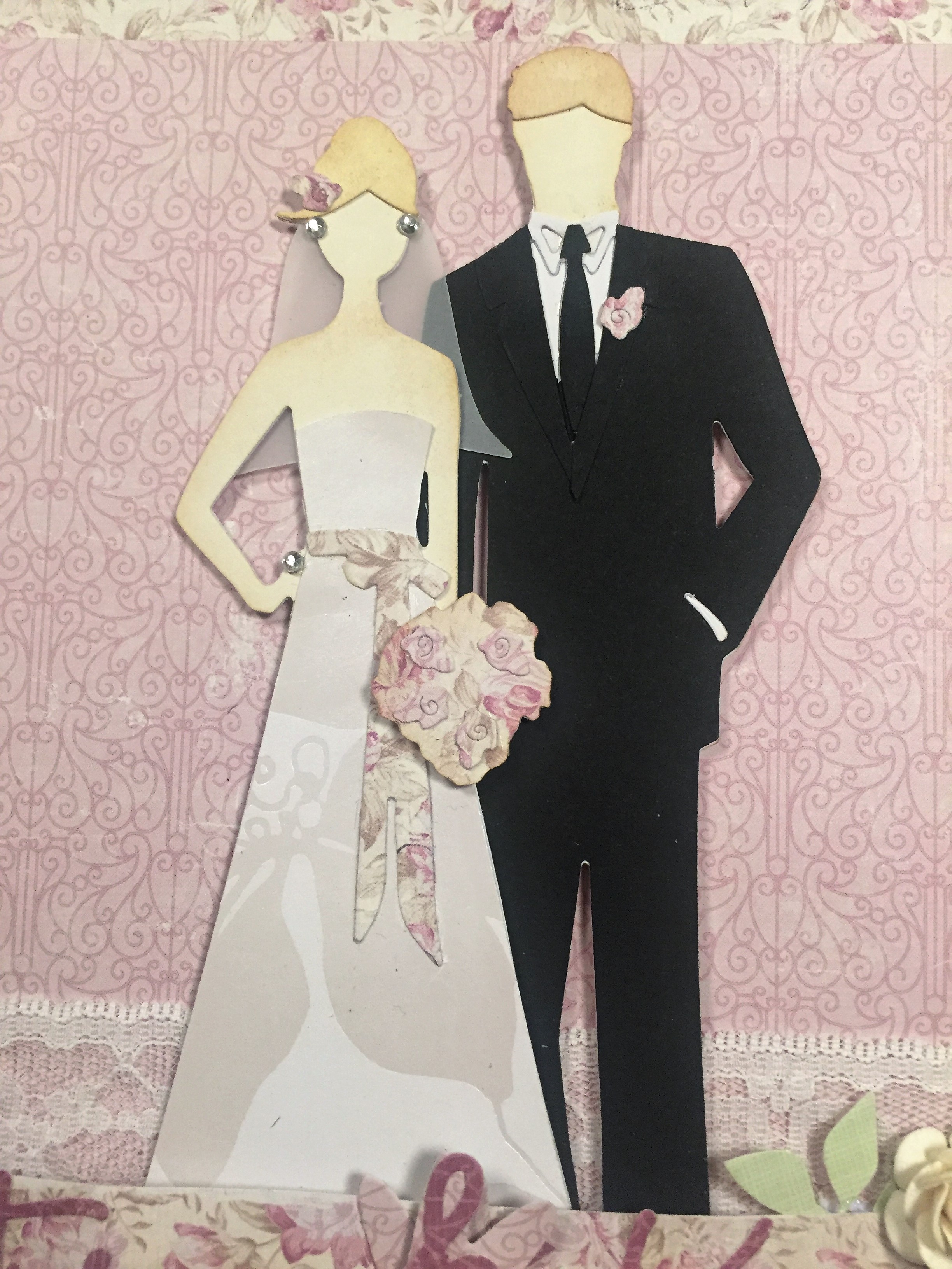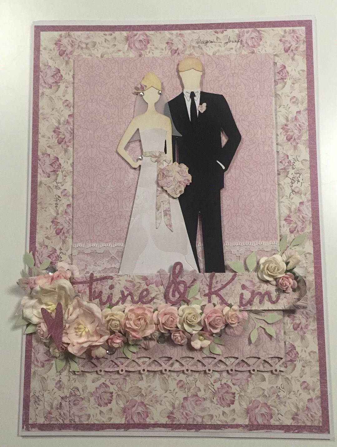 Brudeparret er en meget gammel die fra Quickutz, men man kan sagtens finde filer til Sillouette Cameo for at lave lignende. Jeg har skåret dieen ud flere gange i forskellige mønsterark og karton, klippet og skåret det tilrette, så jeg fik et mere livligt brudepar. Det tager tid, men er bestemt alt arbejdet værd..
