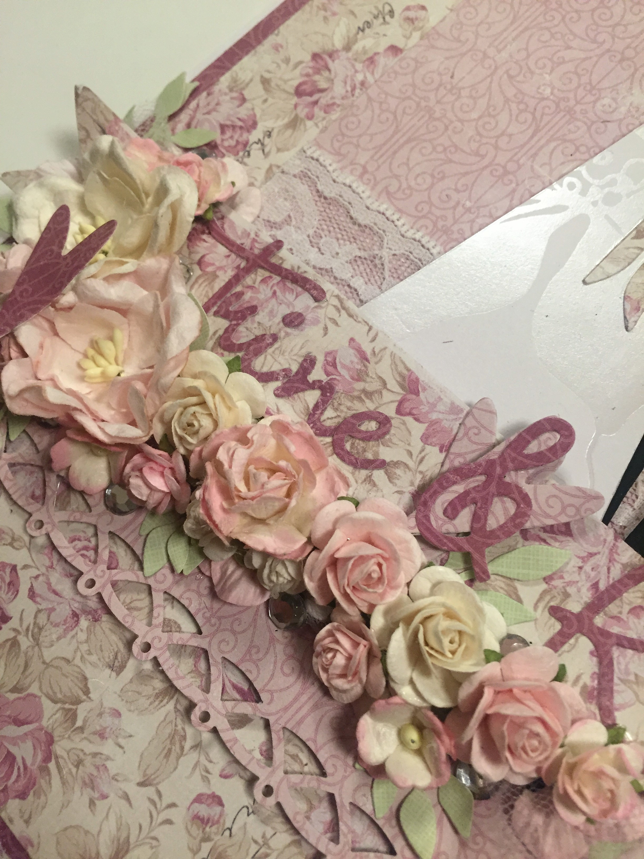 Denne gang var det et meget romantisk og stort bryllupskort. Det skulle vær fyldt med blomster, bling og rosa/hvid.