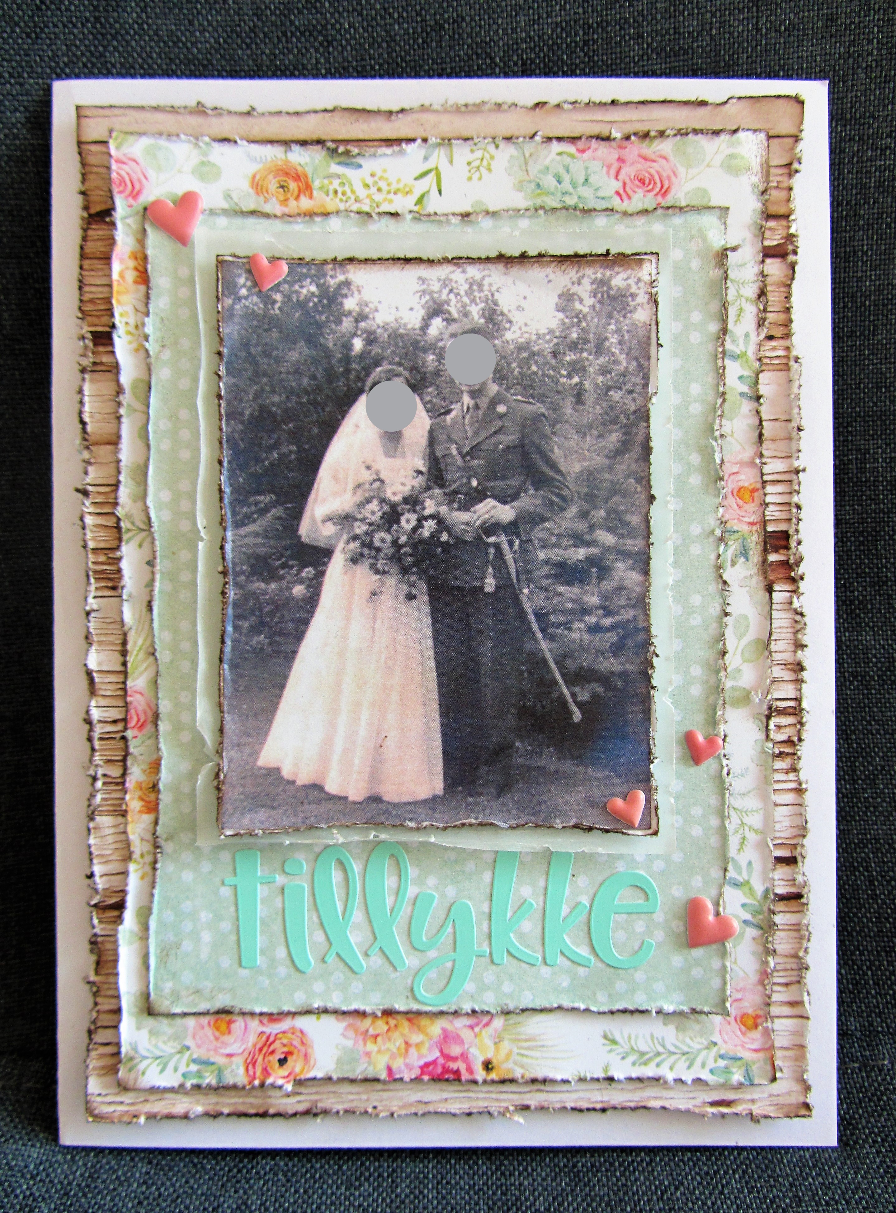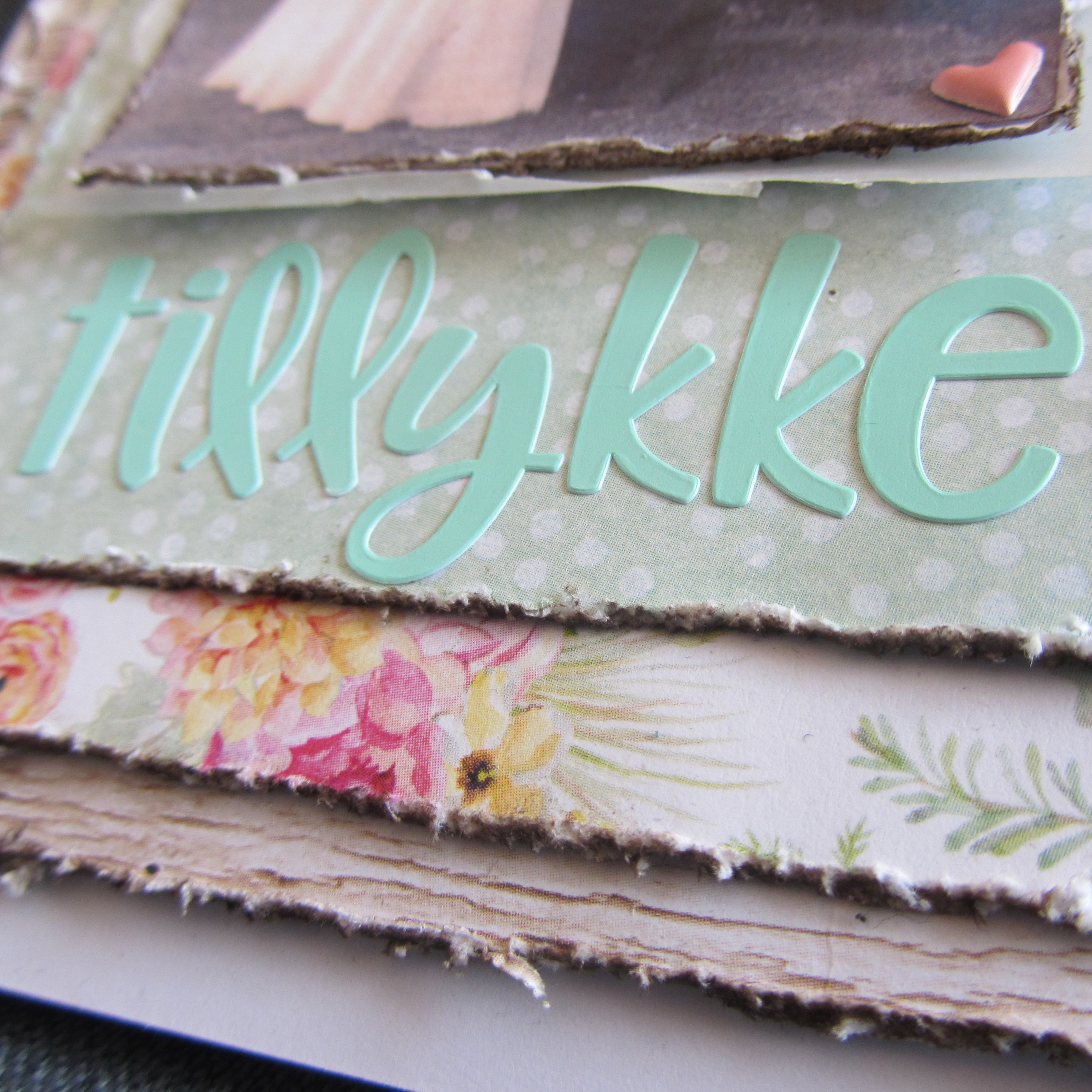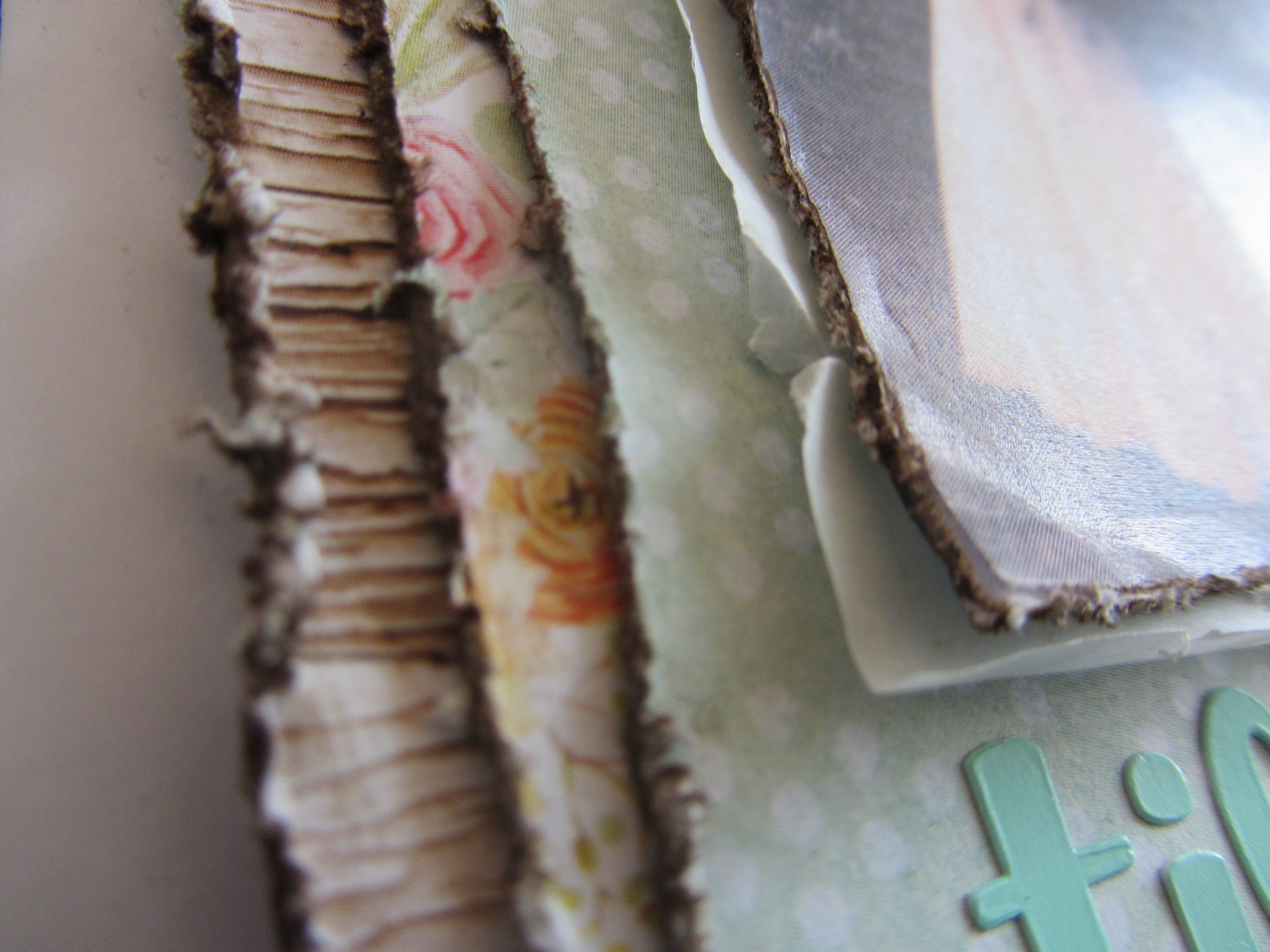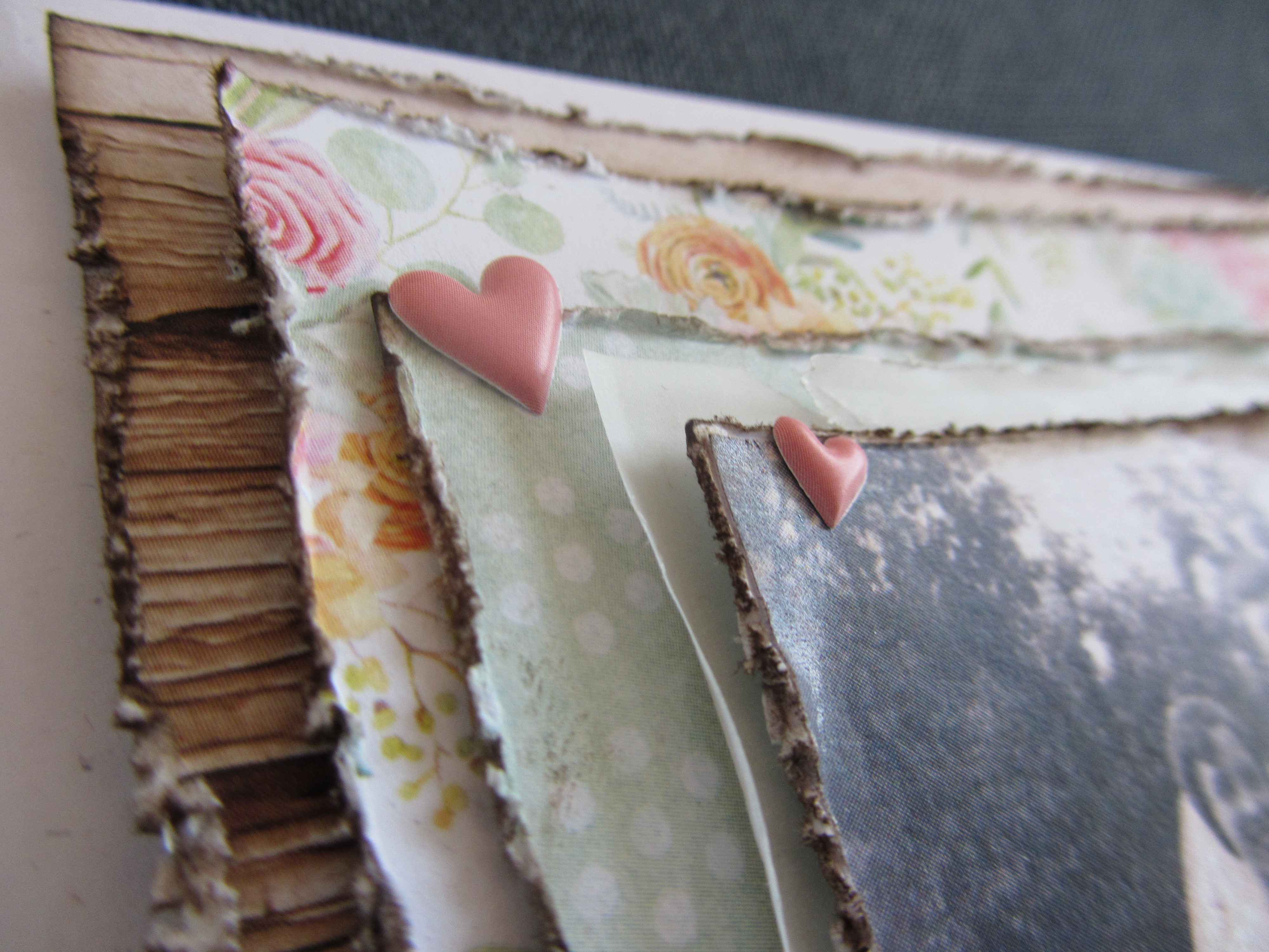 Jeg har for at give kortet et mere rustikt look, som fremhæver lagene, revet kanterne og sværtet med Distress Ink i Walnut Stain.