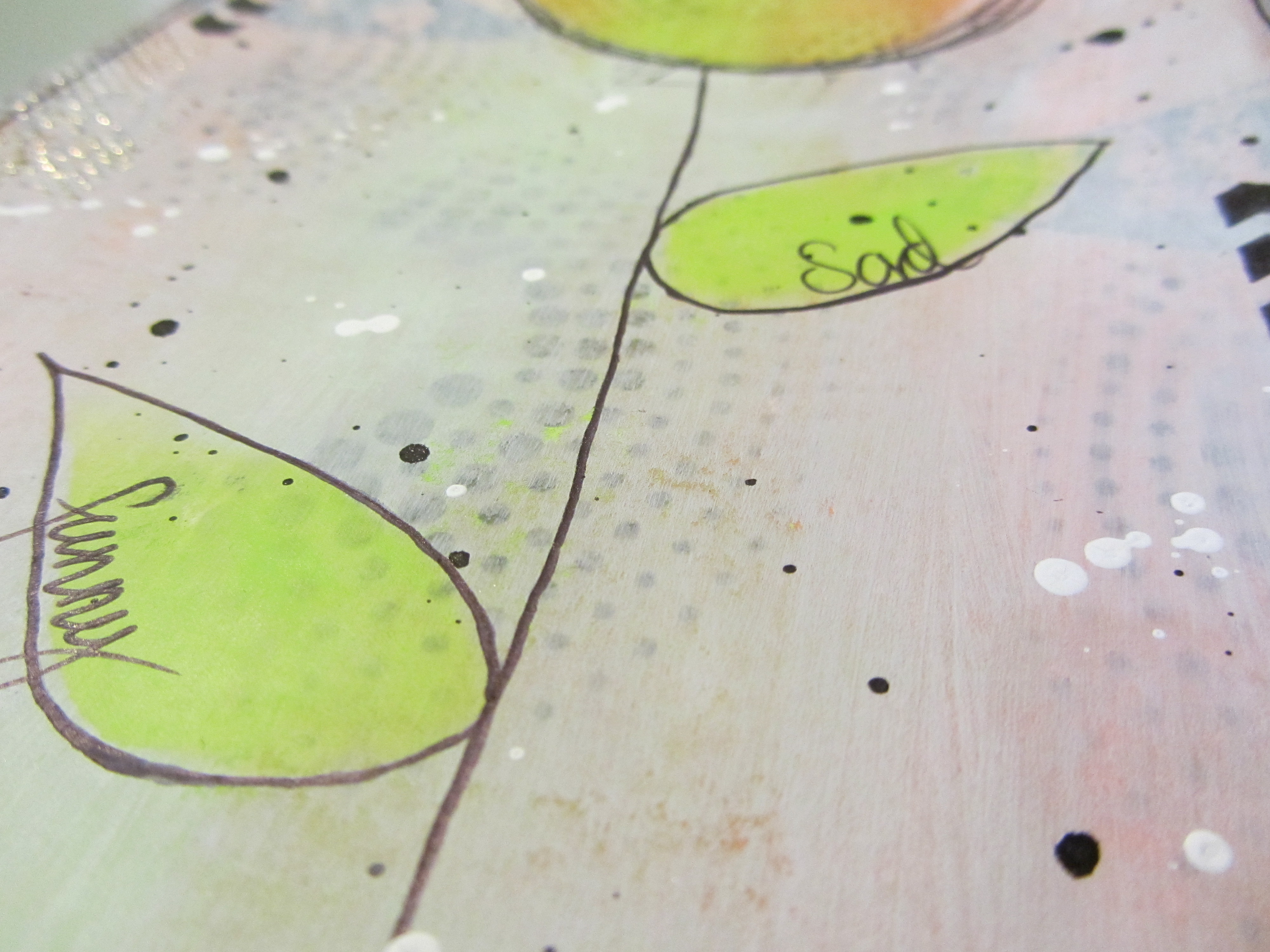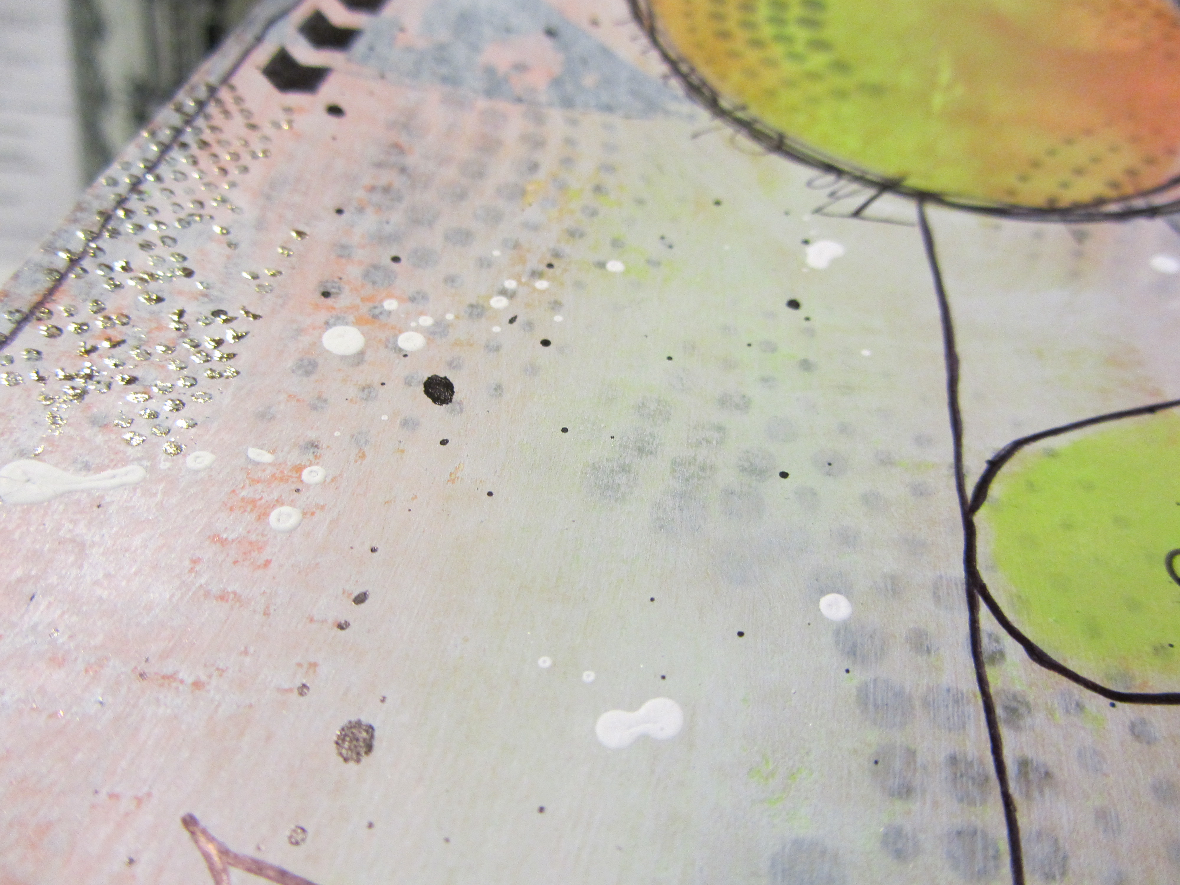 For at tilføje de sidste detaljer har jeg lavet sorte og hvide splats, tilføjet lidt tekst, stemplet og tegnet rundt i kanten og lagt lidt folie på nogle få steder.