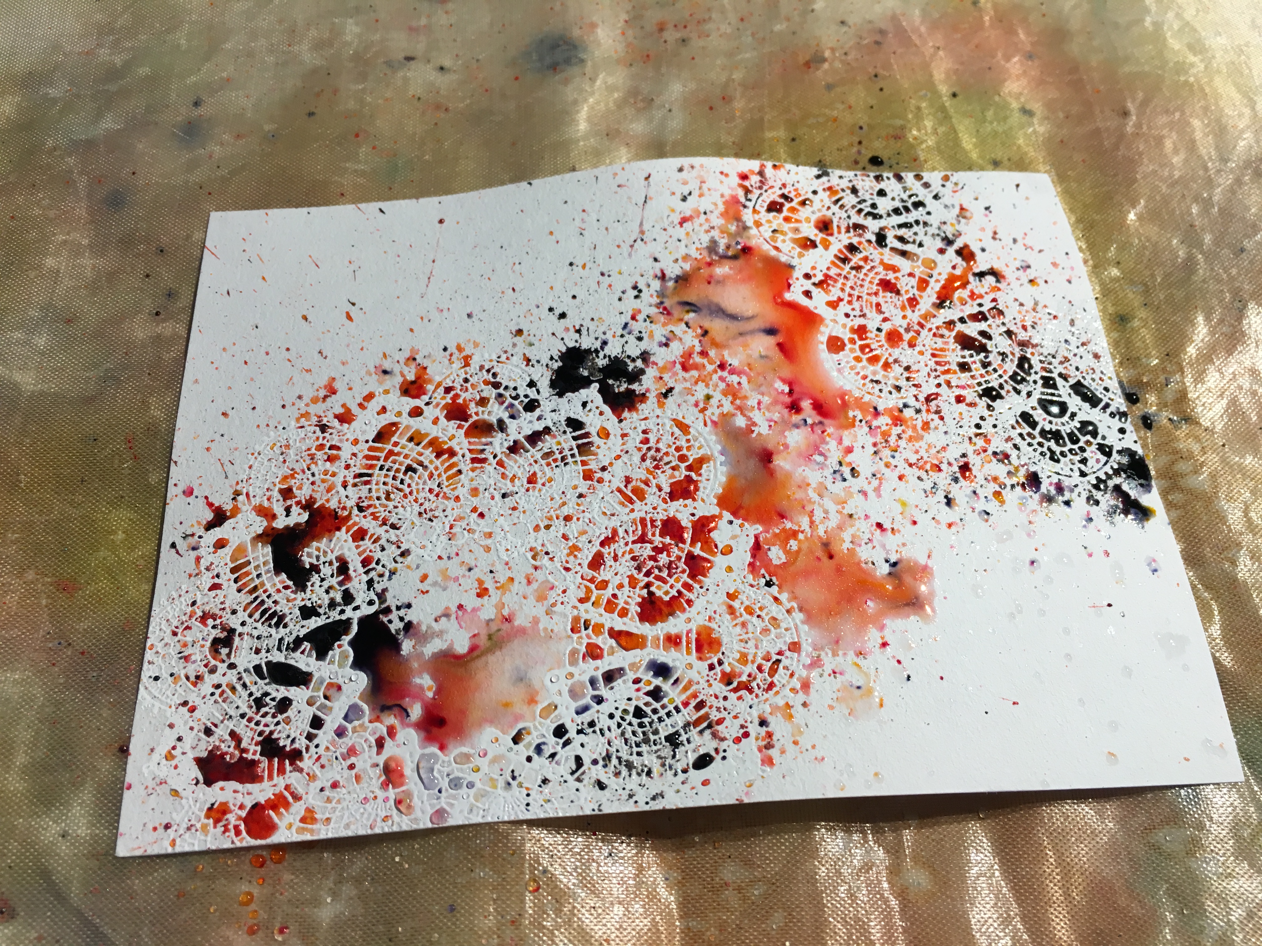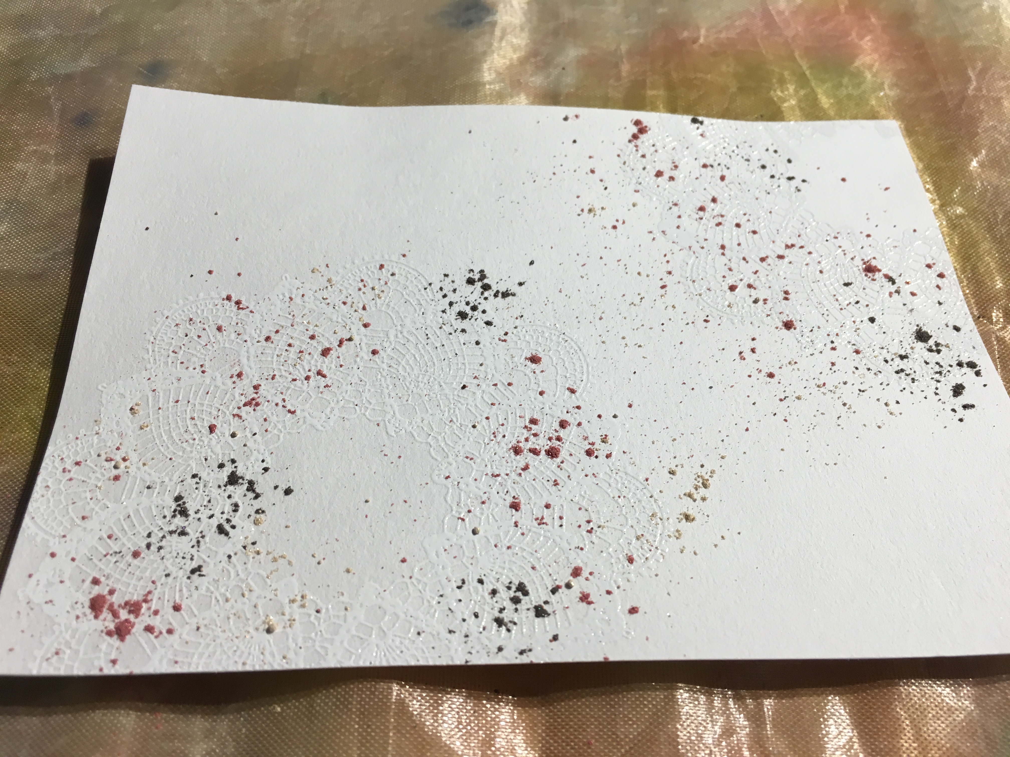 For at fremhæve baggrunden har jeg forsigtigt fjernet det farve, der lå på selve embossingen med en vådeserviet.