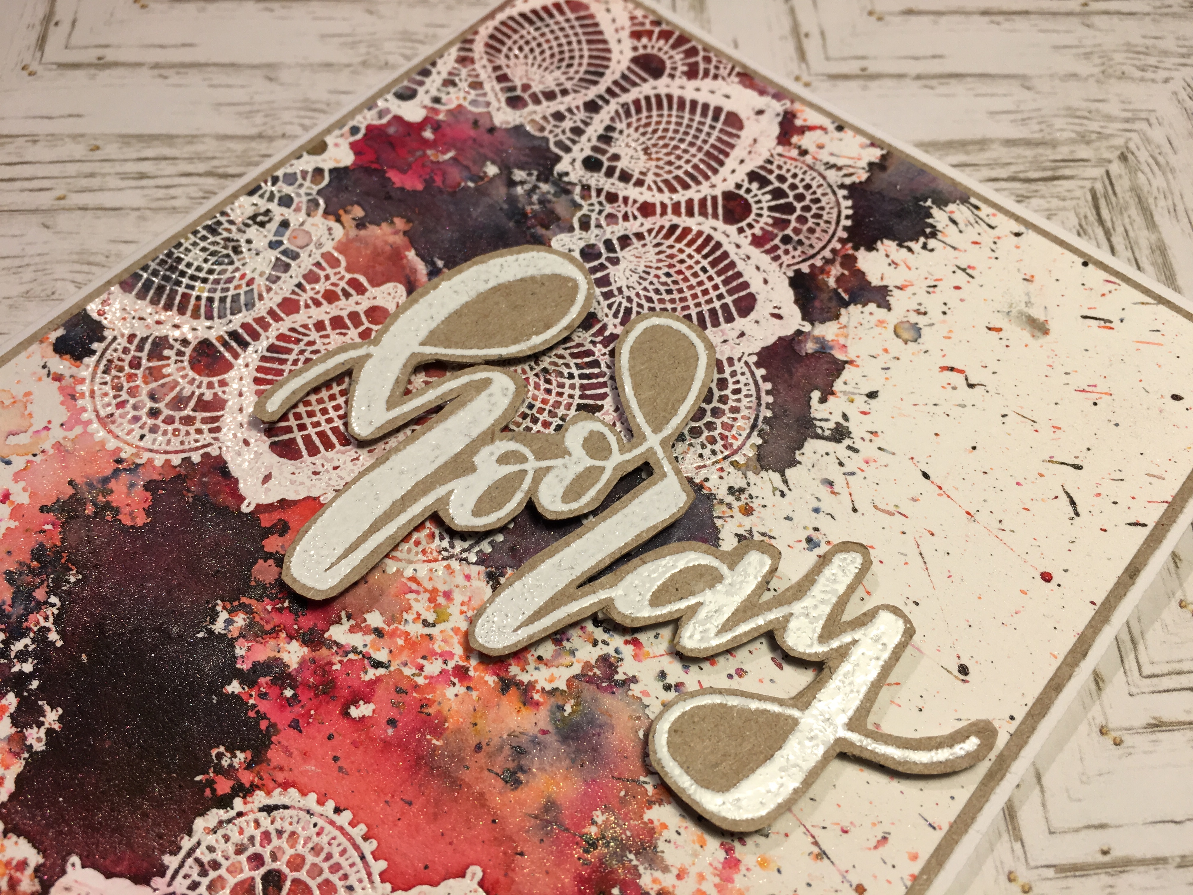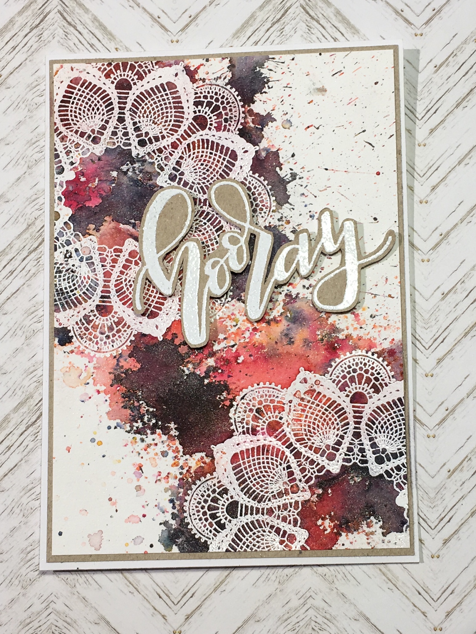 Der behøver ikke ske alt for meget mere på kortet, da baggrunden jo skal være i fokus. Så jeg har alene embosset Hooray på kvistkarton og skåret det ud. Teksten er løftet med 3D-puder.
