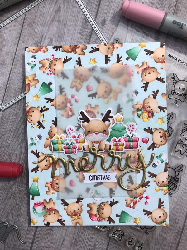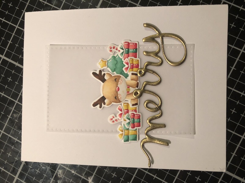Da baggrunden godt kan opfattes som meget travl, fik mit rensdyr et stykke vellum under sig. Dette er skåret med en Crealies die der hedder CLNestXXL76 og jeg har brugt nr. 7 fra kanten.