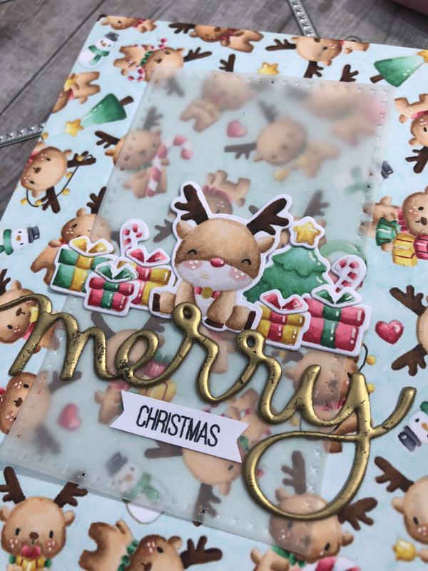 For at man ikke kunne se limen igennem vellumet limede jeg min gavebunke, rensdyret og teksten på vellum stykket inden jeg limede det på baggrunden - på den måde kunne jeg bare komme lim der hvor mine motiver var, og ingen kan se det er er der.