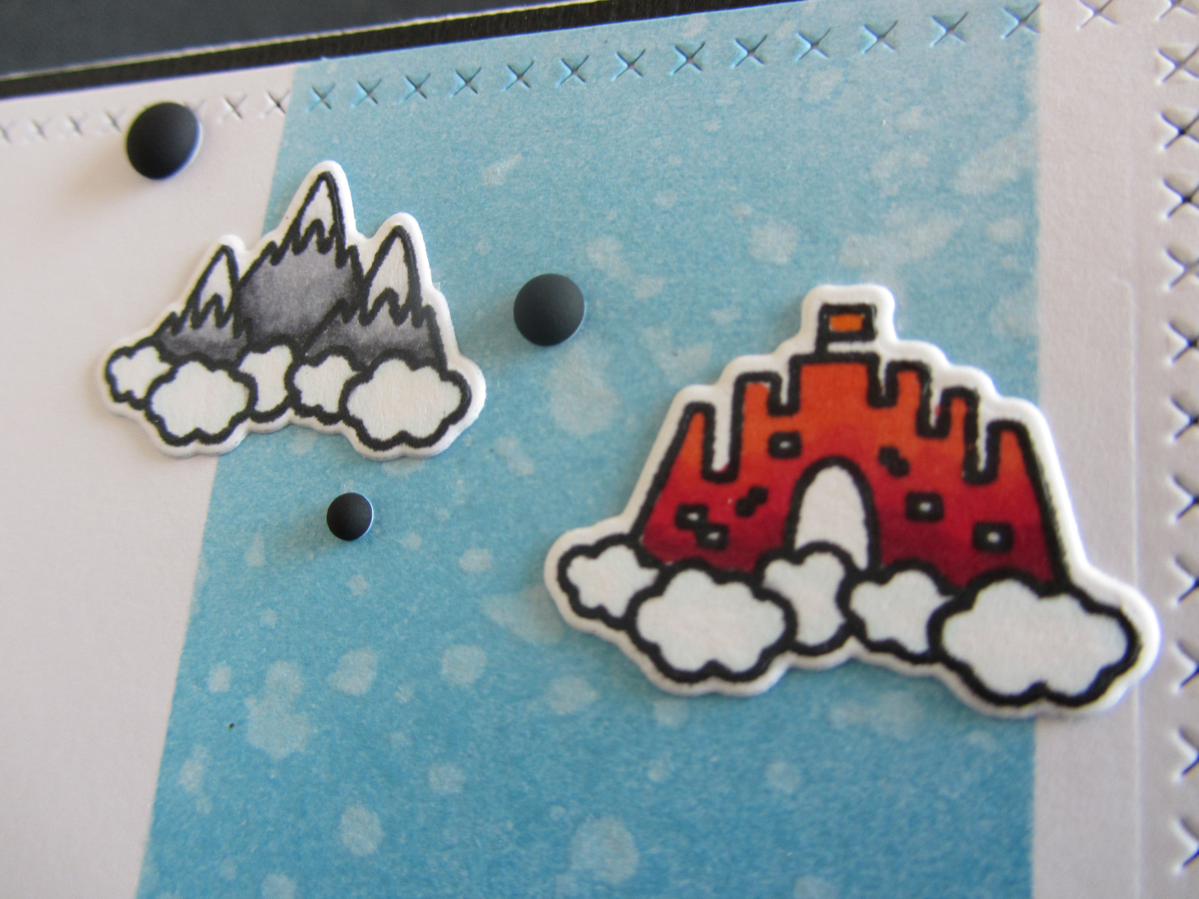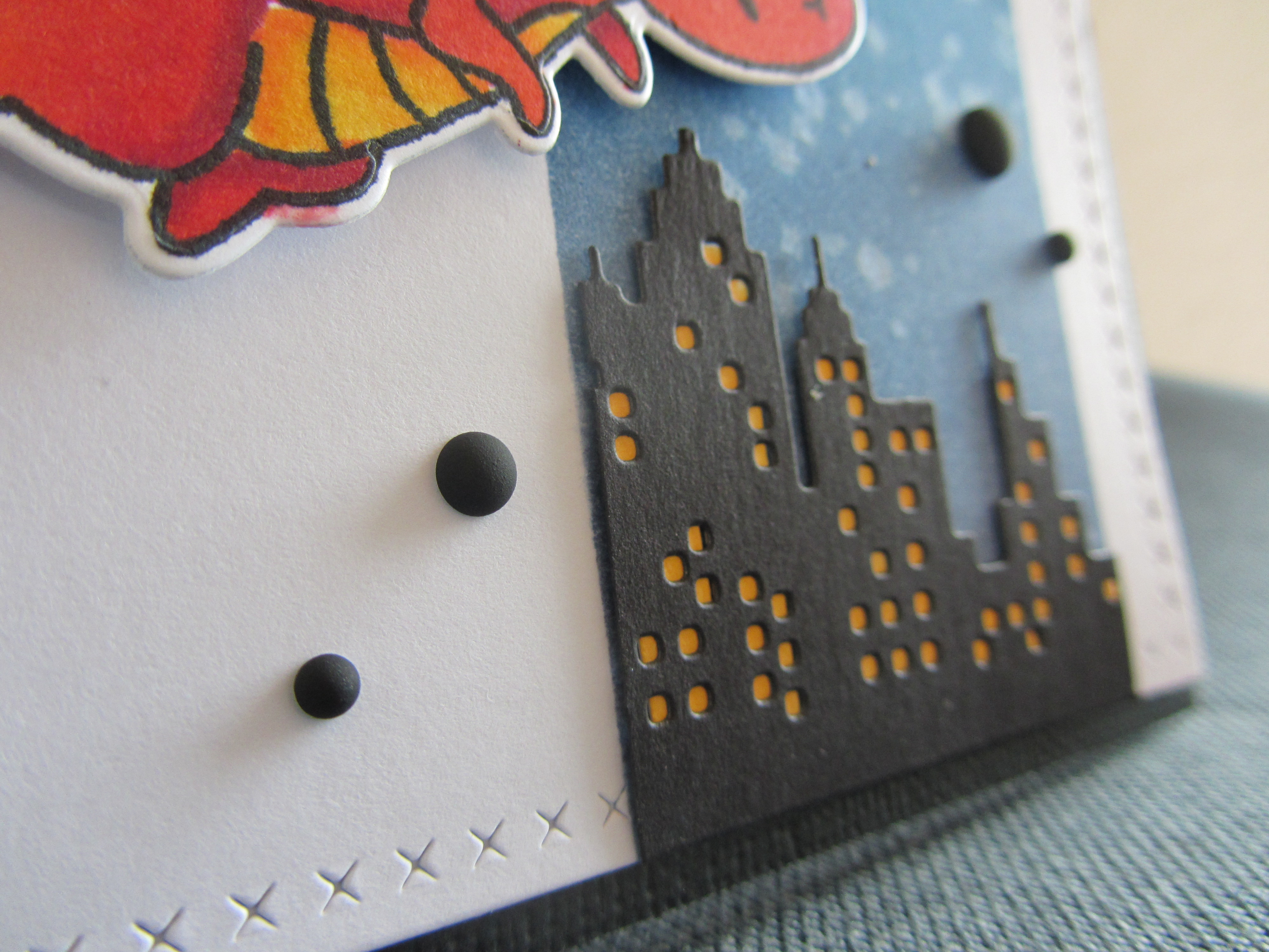 Silhouetten af byen er også en die fra Mama Elephant. Jeg har bagpå påklistret karton, som jeg har indfarvet med en matchende Copic, så det ligner, der er lys i vinduerne.