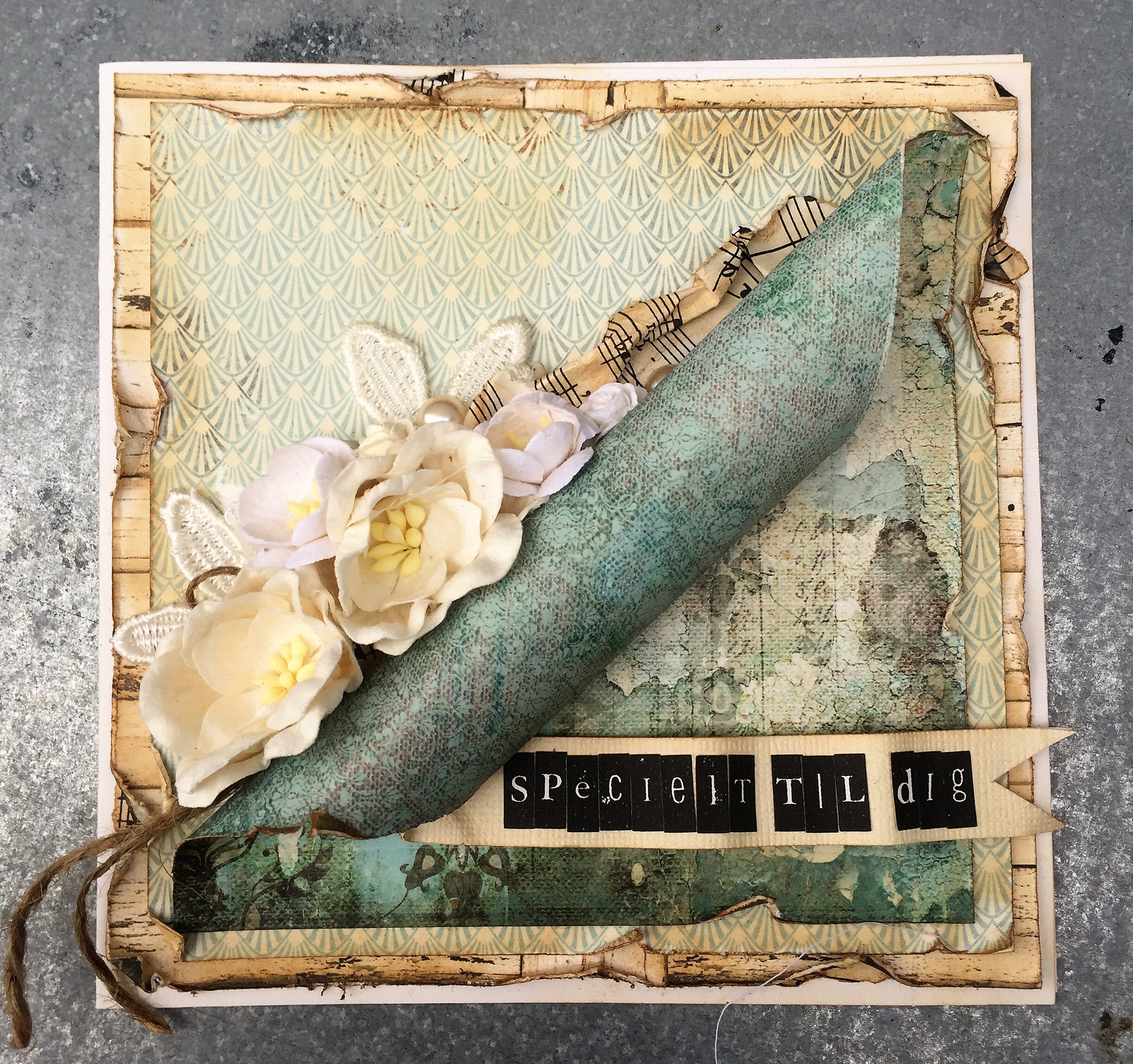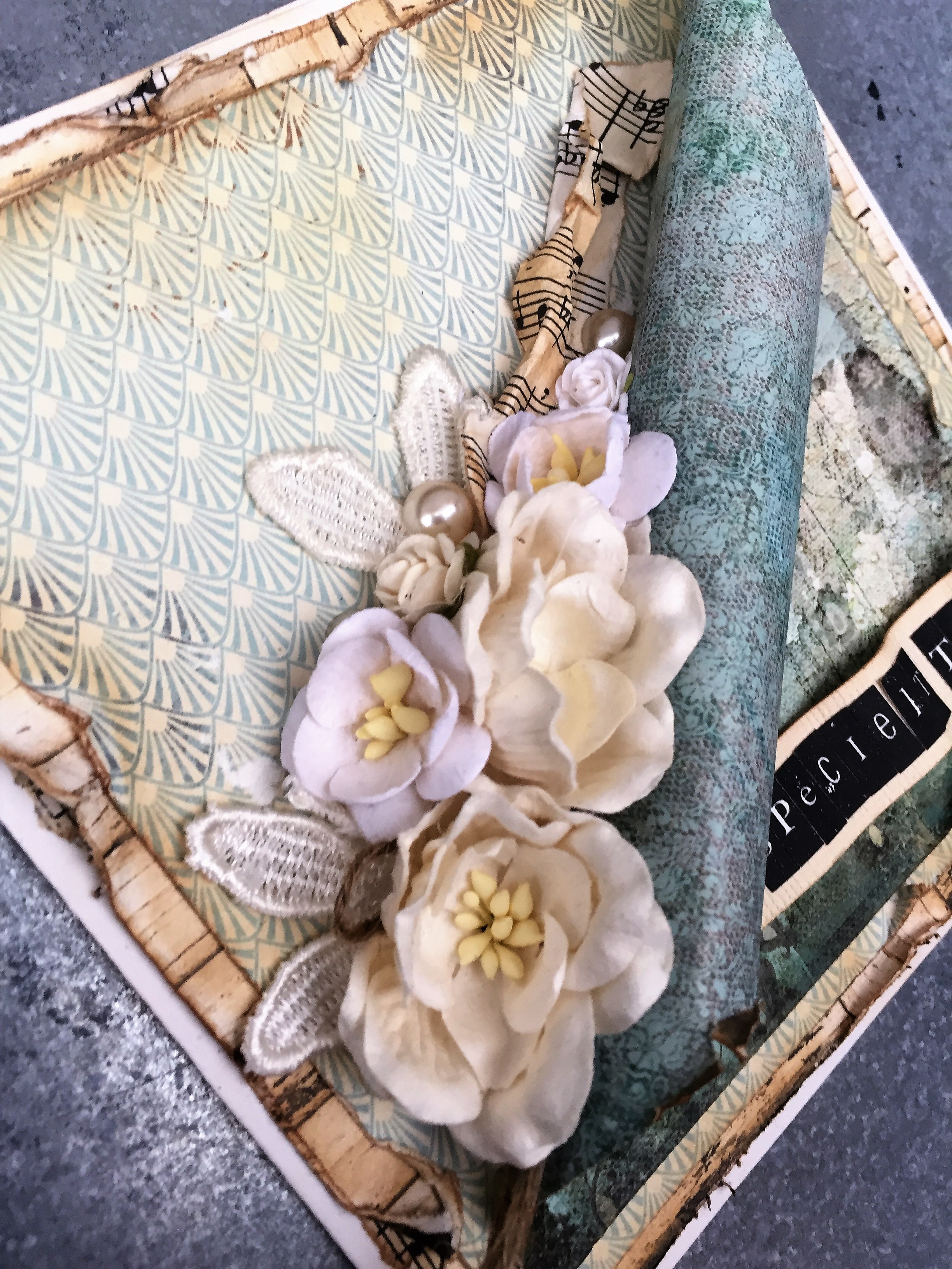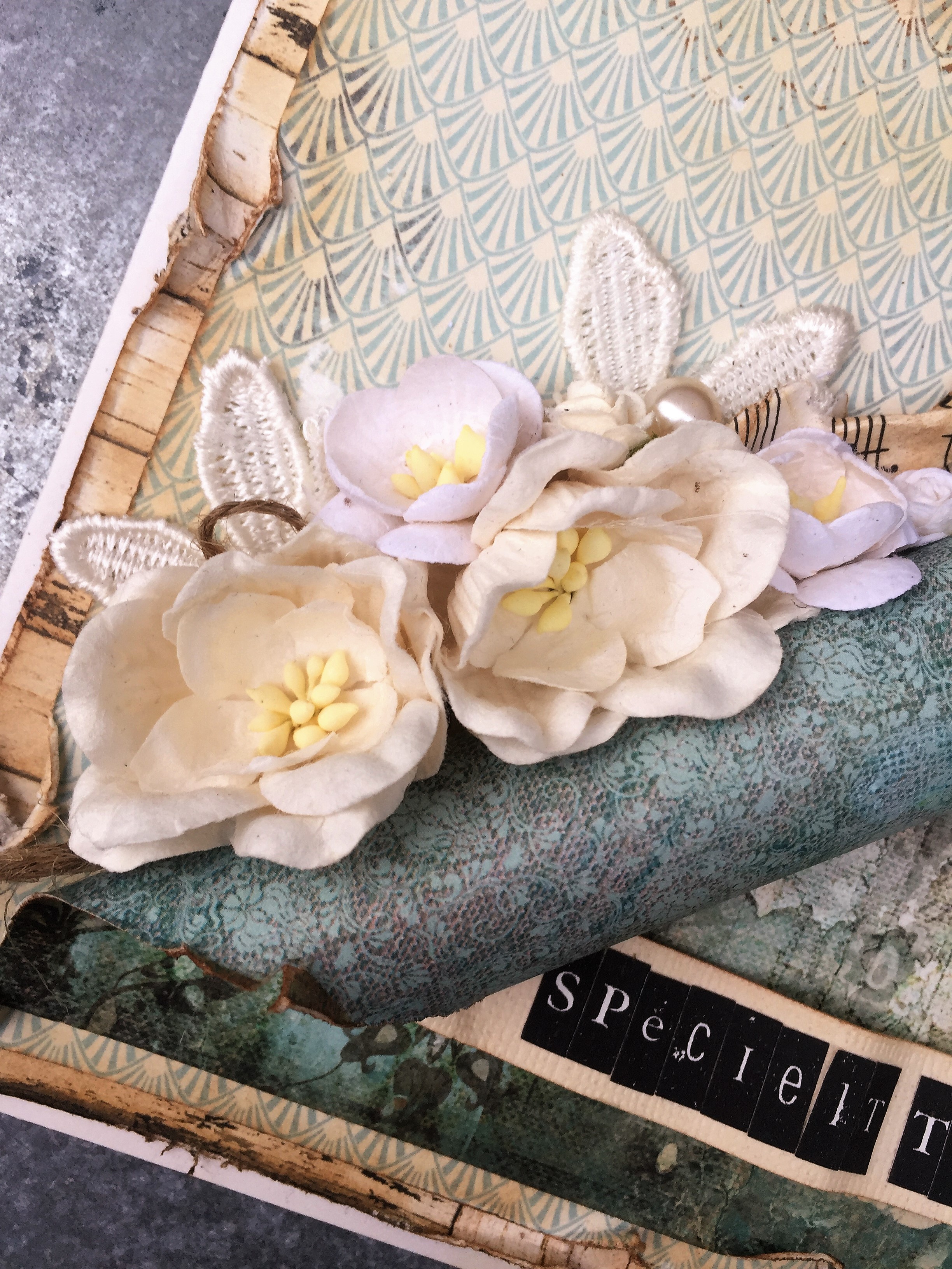Nærbillede af blomster, sværtet nodepapir, groft snor, blonde blomster og perler.