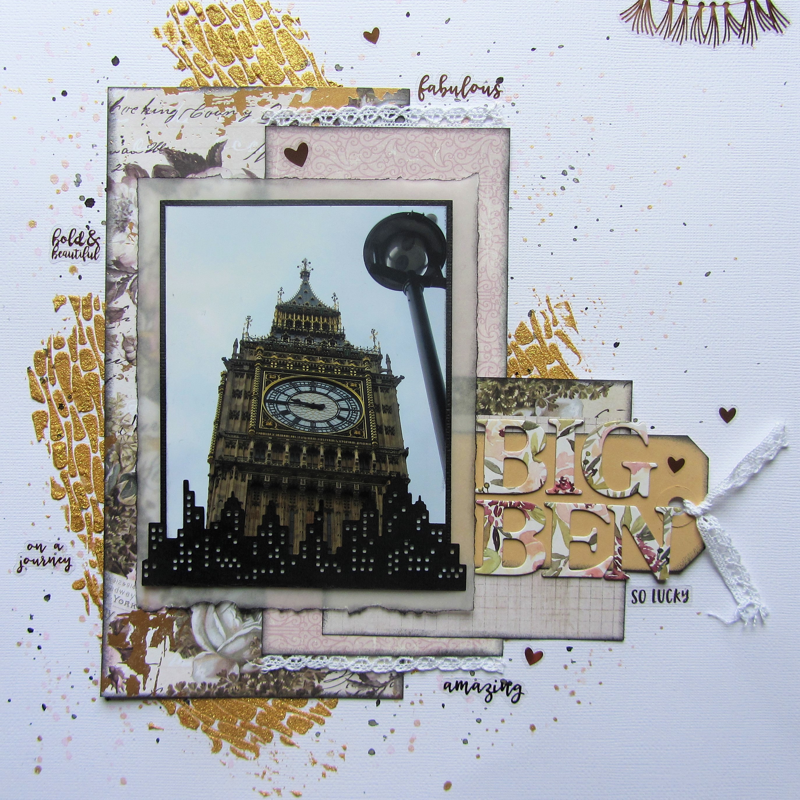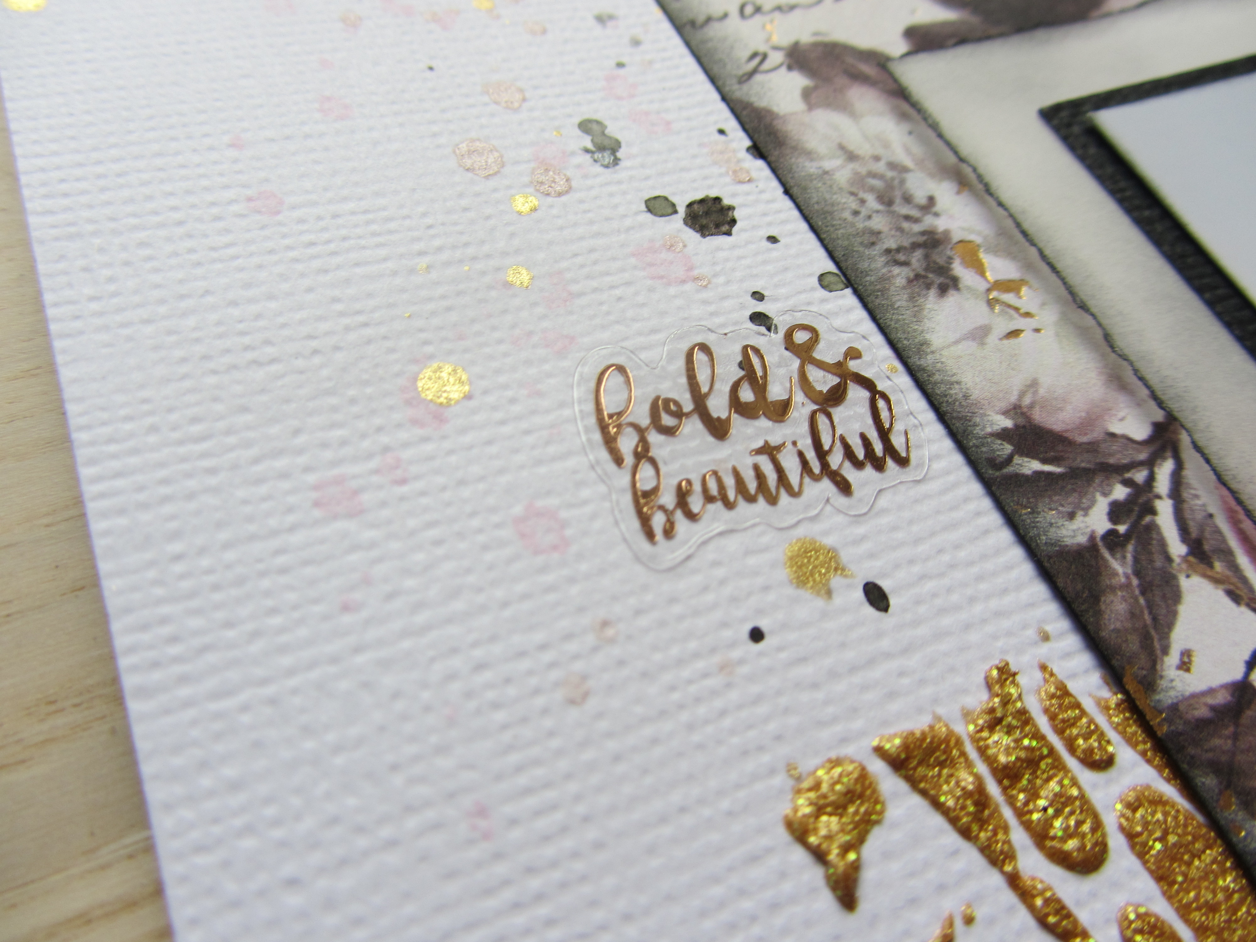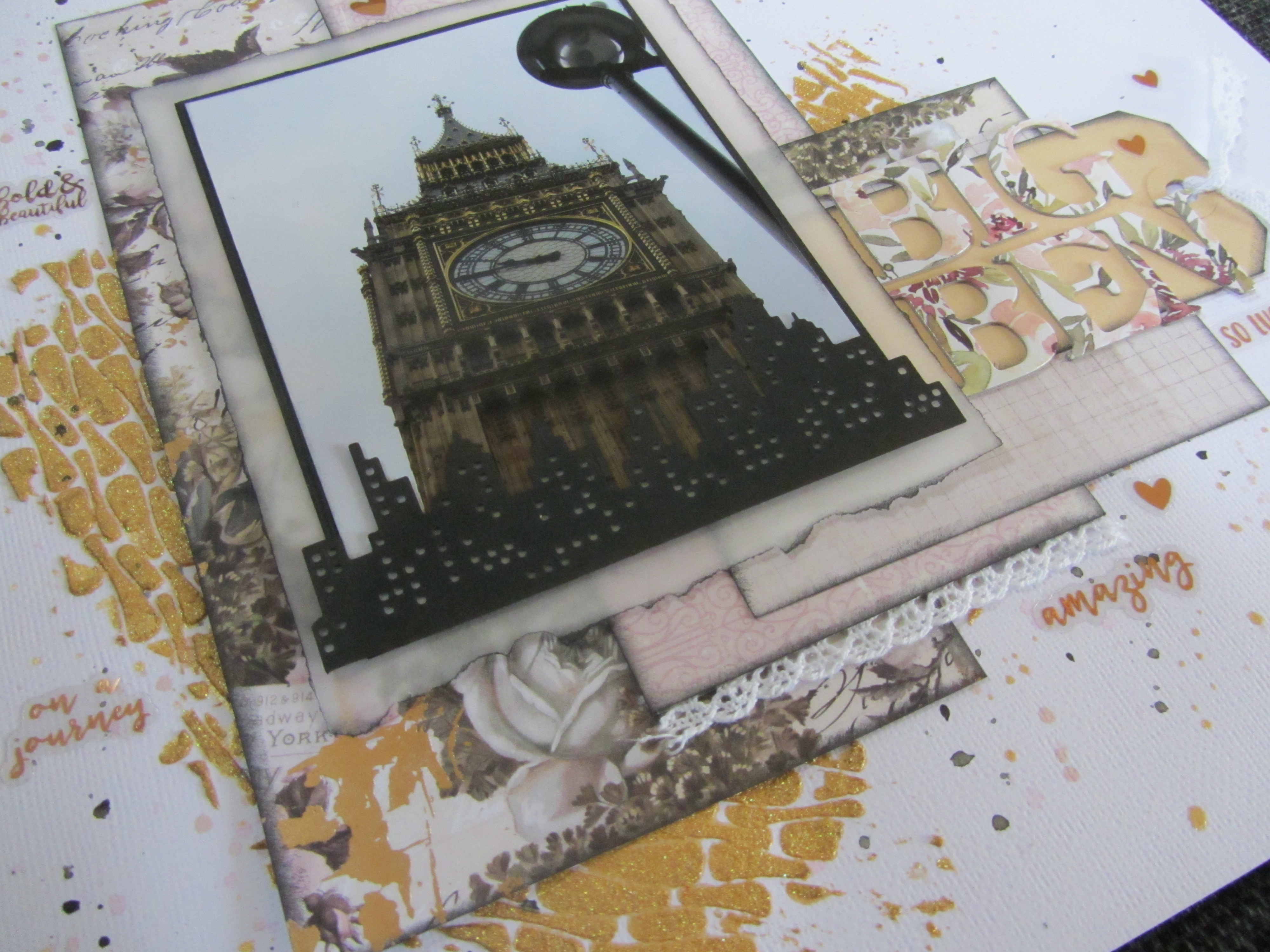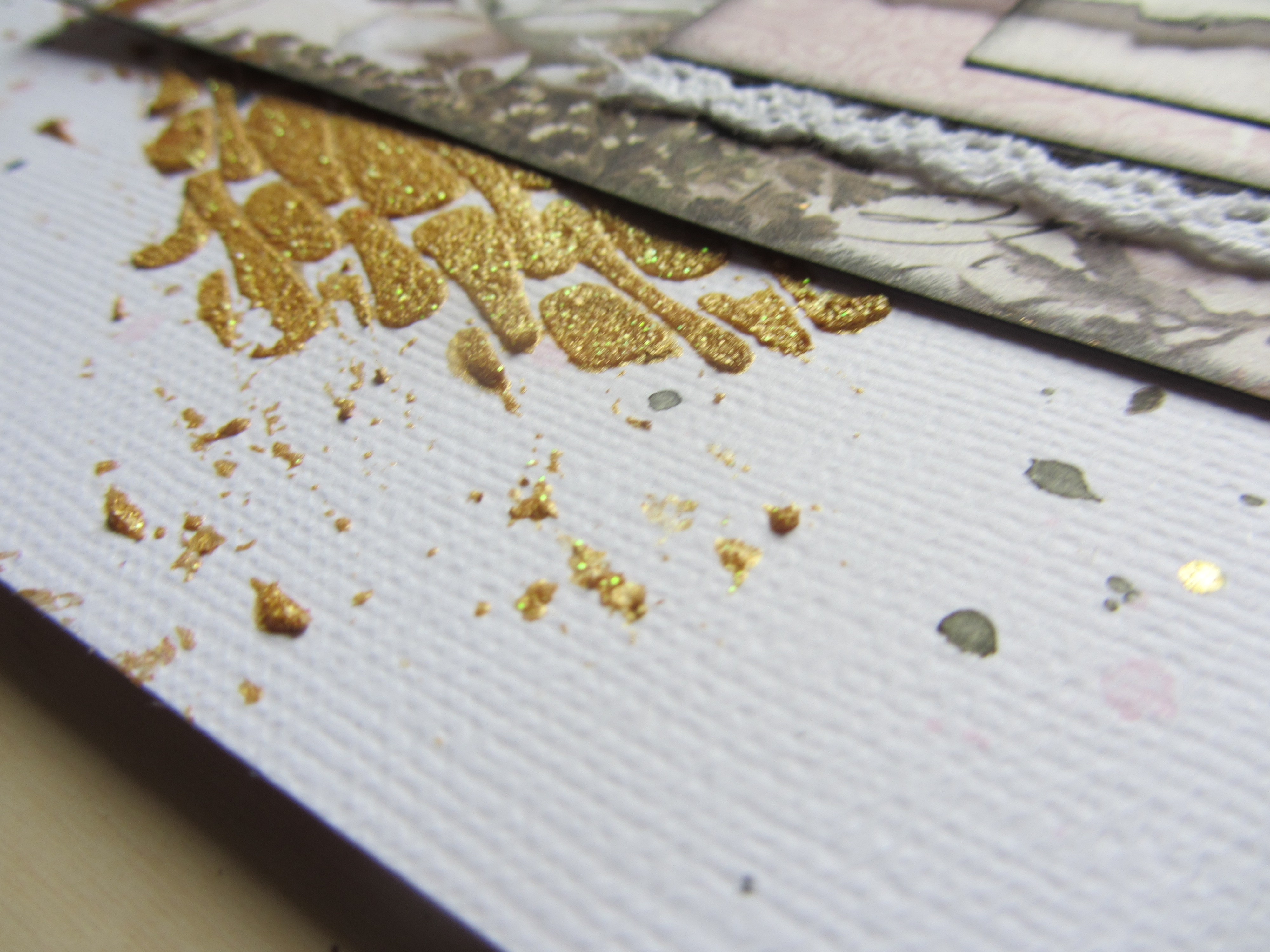På dette layout har jeg påført en guldfarvet glitterpaste gennem en stencil. Da det var tørt, lavede jeg splats med forskellige farver mist.