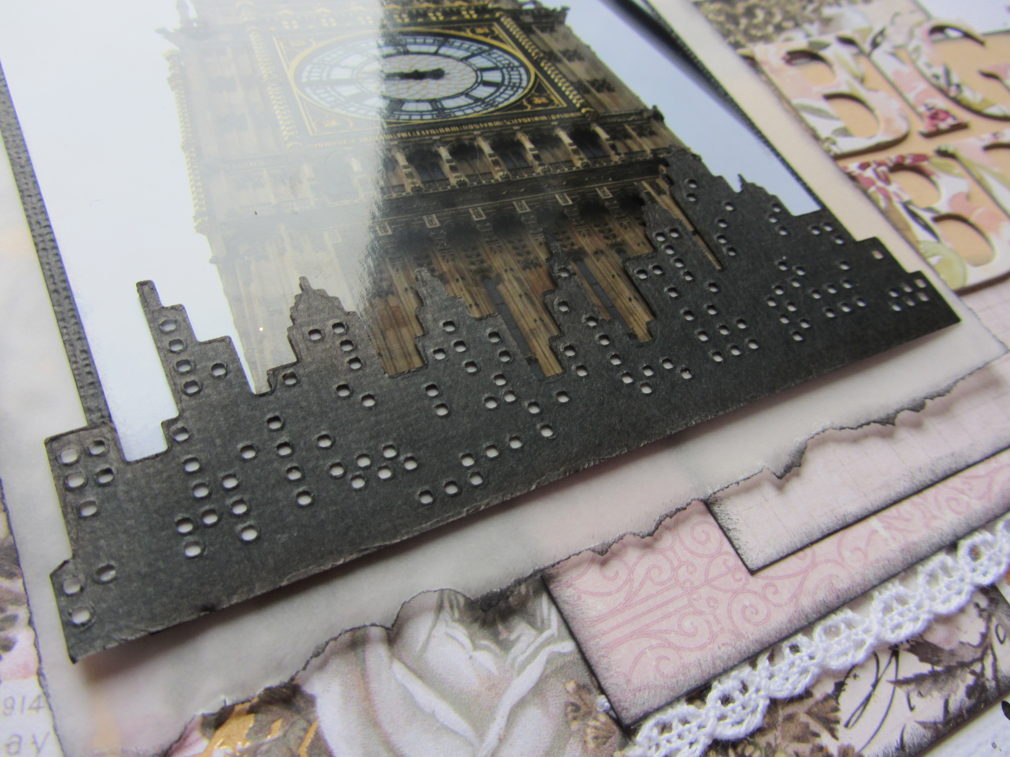 Af sort karton har jeg udskåret Cityscape dien fra Mama Elephant i sort karton. Bagpå har jeg påsat vellum, så det dækker "vinduerne", og gør det sværere at se igennem. Det giver et mere roligt udtryk, da jeg pålimede diecutten på den nederste del af mit billede.