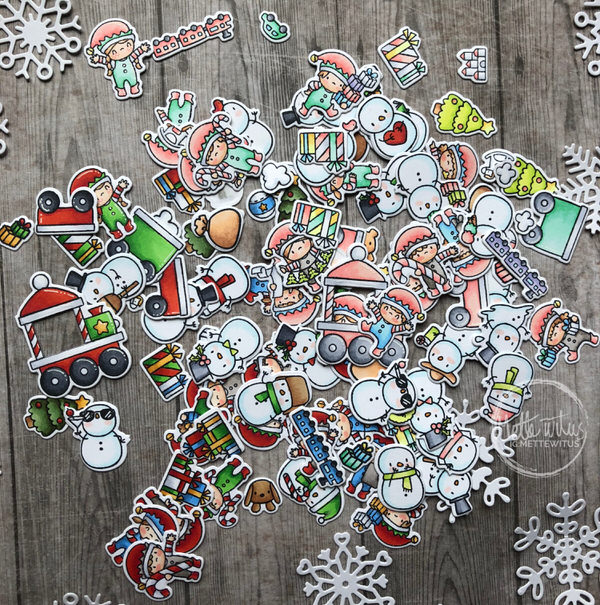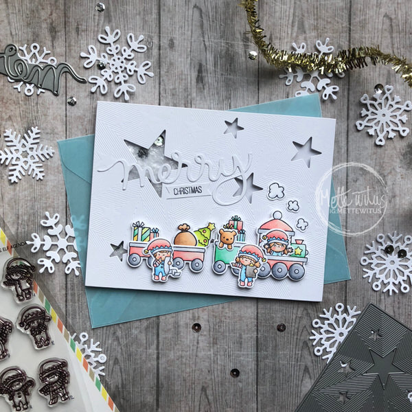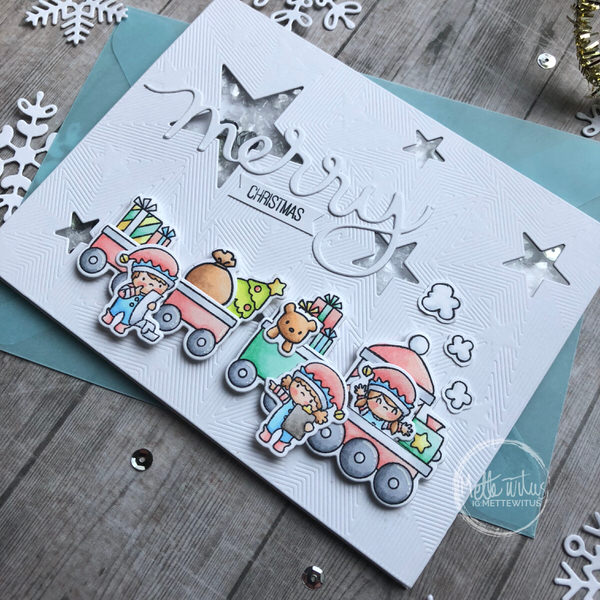 Jeg udvalgte motiver fra Little Agenda Trains, Little Elf agenda og et enkelt fra Little Santa Agenda, som jeg satte på mit kort med 3D foam squares - Et super hurtigt kort når motiverne allerede var farvelagte og klar.