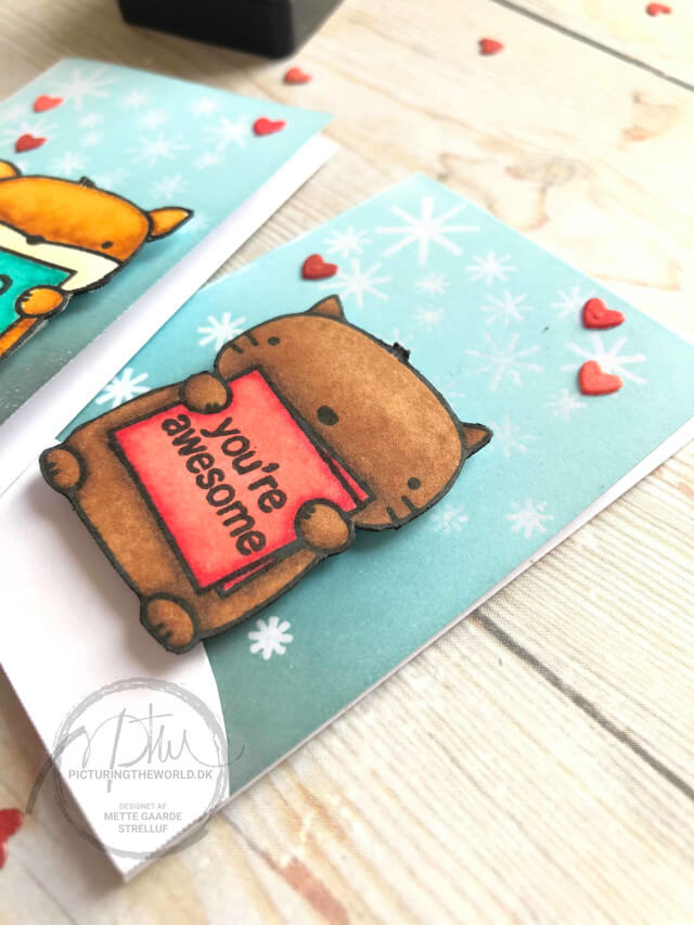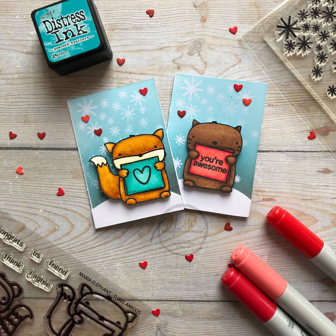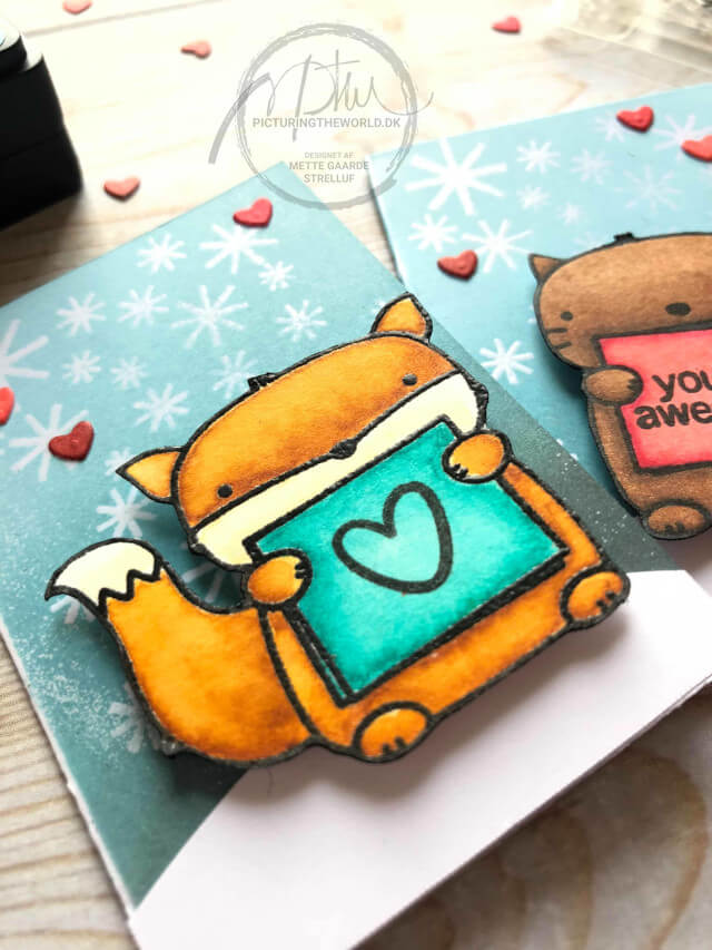 Dem jeg viser i dag, er lavet med et par stempelmotiver, som jeg allerede har farvelagt, så det eneste, jeg har skulle fikse er baggrunden. En god måde at få brugt alle mine små farvelagte motiver på. Ræven er farvelagt med vandfarver, mens det andet motiv er farvelagt med Copics.