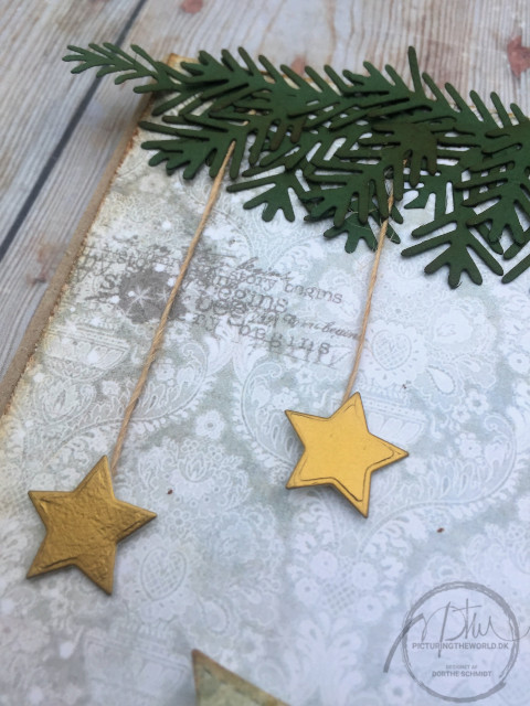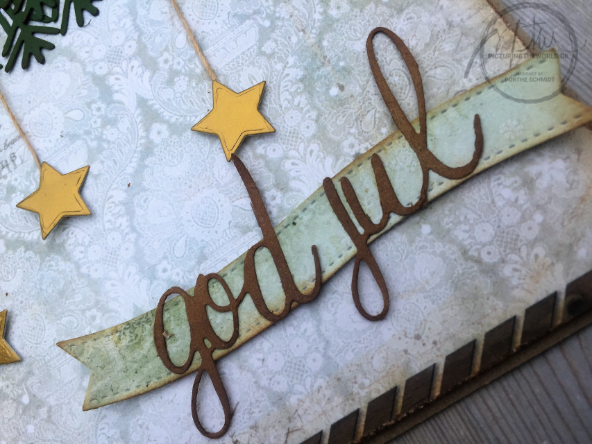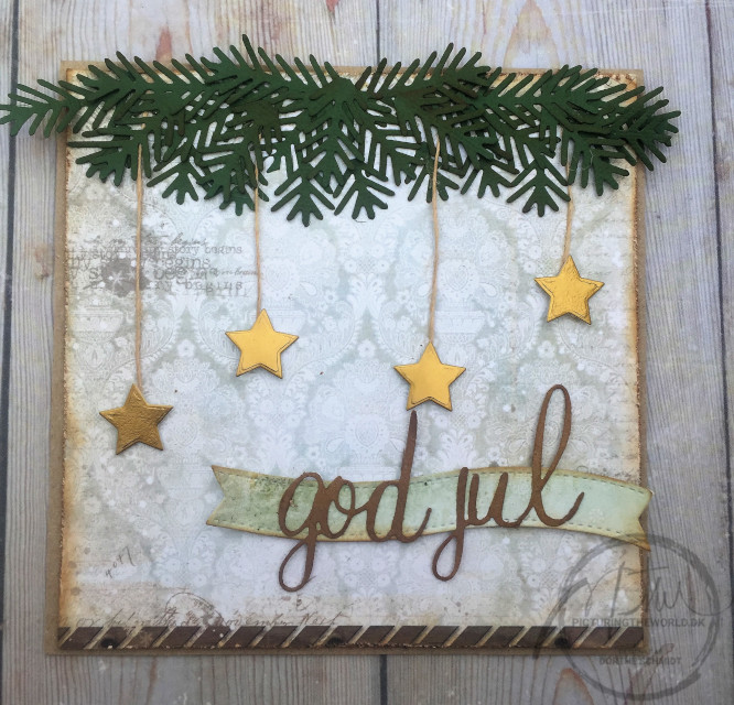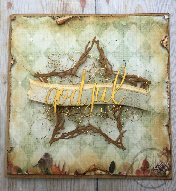 På midten er en rustik stjernediecut i sværtet kraft, 2 ens banner og igen dekoreret med diecut "God Jul".