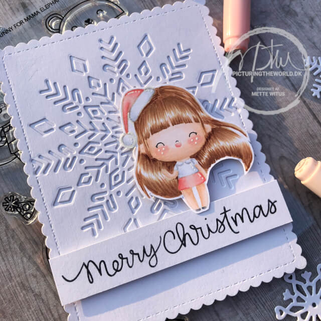 Den lille pige er fra Mama Elephants Pretend Play og har fået en nissehue på fra Krumsprings Naughty or Nice sættet. Jeg har stemplet det med en lysebrun memento for at kunne lave no line coloring med mine copics.