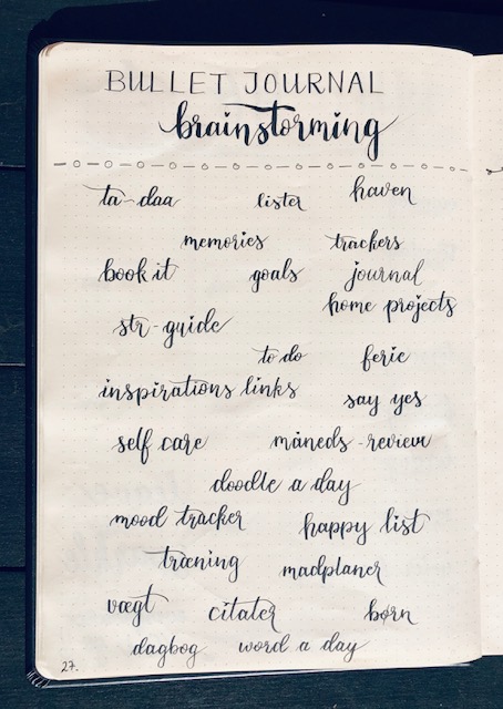 Brainstorming, med ideer til sider i min BuJo: