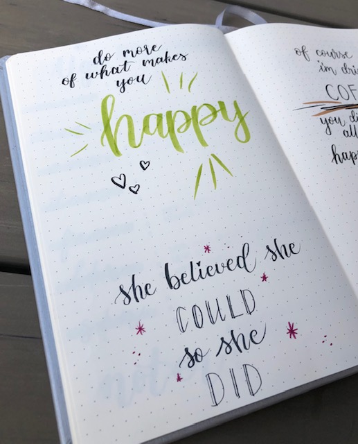 Min lille Rhodia bog ( A5 ):Jeg elsker citater, og også at skrive et lille citat på nogle af siderne. I min lille Rhodia Bullet Journal, som jeg har med mig i tasken, skriver jeg noter osv. Her skriver jeg også små citater, og øver mig samtidig i brush-lettering som bare ser så hammer godt ud! Men som er så svært at skrive! Som venstrehåndet er jeg udfordret med de store penne med stor, blød brush, da jeg mere skubber pennen end trækker - i andre har nok også jeres udfordringer ;) Men skriv alligevel - det er jo din bog som afspejler dig og det du bruger bogen til.