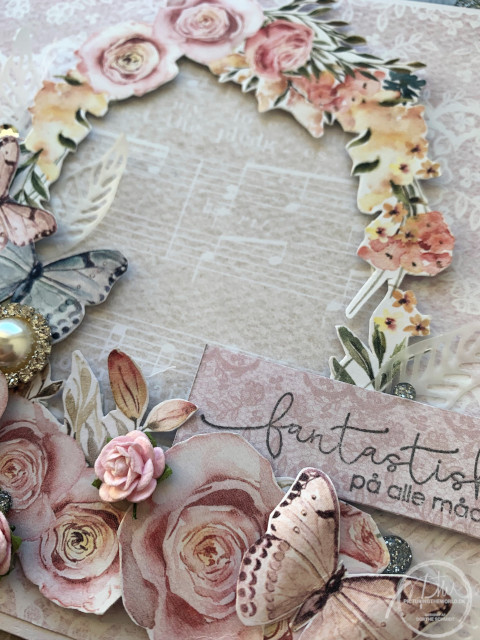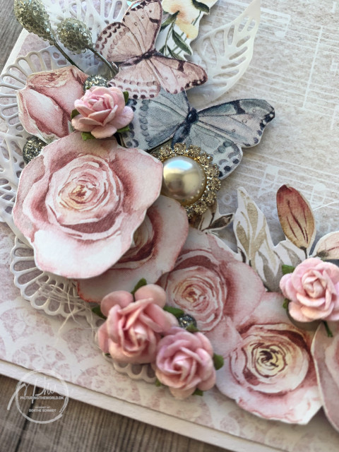 Desuden er der en masse små sart rosafarvet roser, små sølv glitter blingsten og lidt forskelligt glitterdims fra gemmerne.