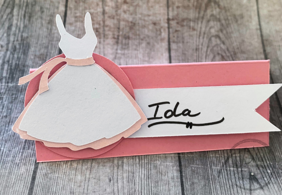 Bæltet er det samme som vi har brugt til kjolen på bordkortet. Det er tilpasset i størrelsen, så det passer på pigen.