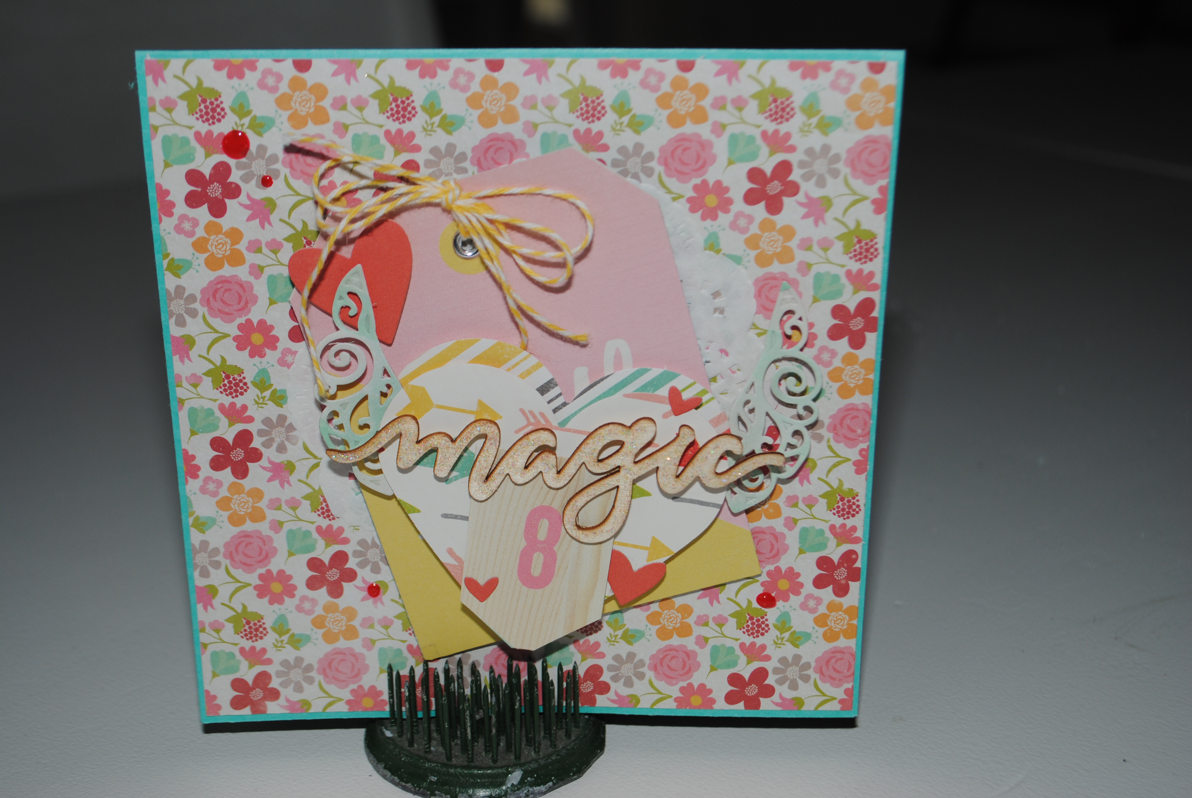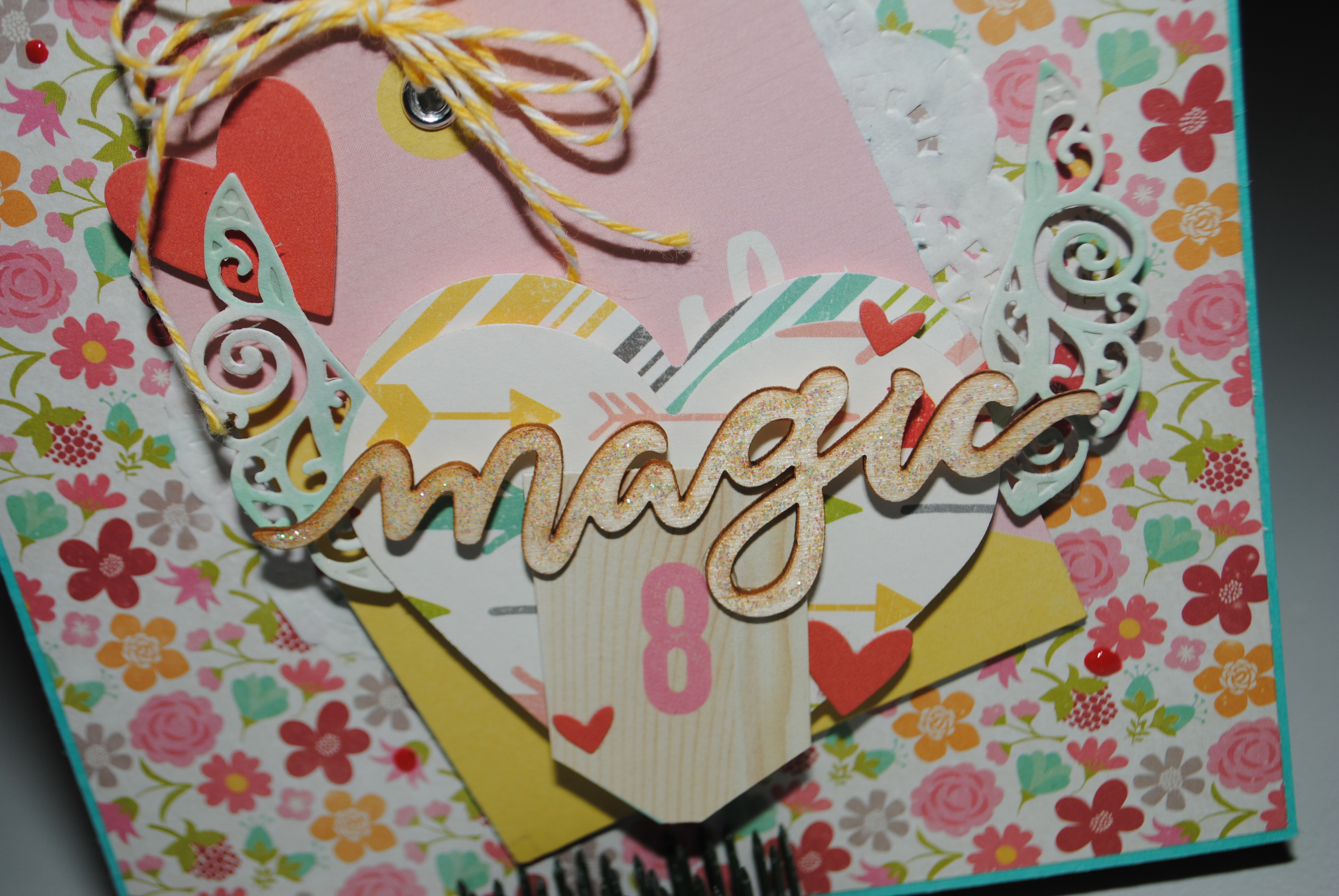 Så frem af gemmerne fandt jeg en masse lækkert papir og pynt i tøset farver og mønstre. Og lidt pynt i form af wood weeneer shapes. Man kan jo kun sige at en 8 årig oplever sin fødselsdag som noget magisk, og derfor passede ordet så fedt, det fik så lidt glimmer sticklers, og så en masse hjerter og noveu drops i rødt.