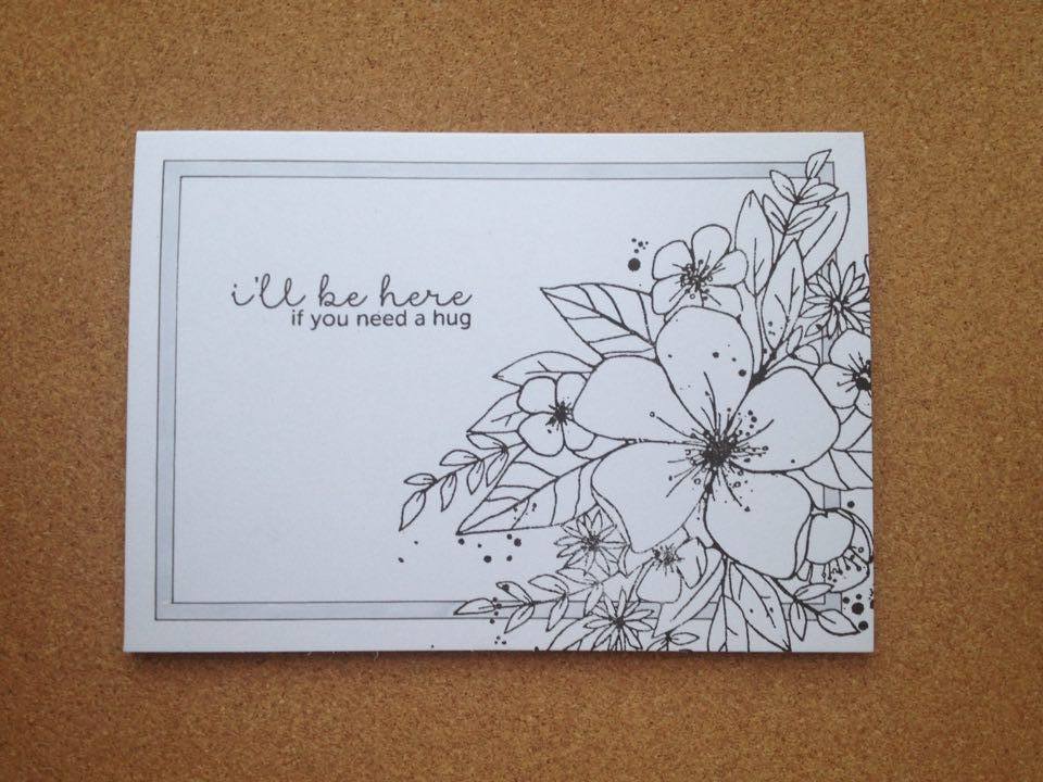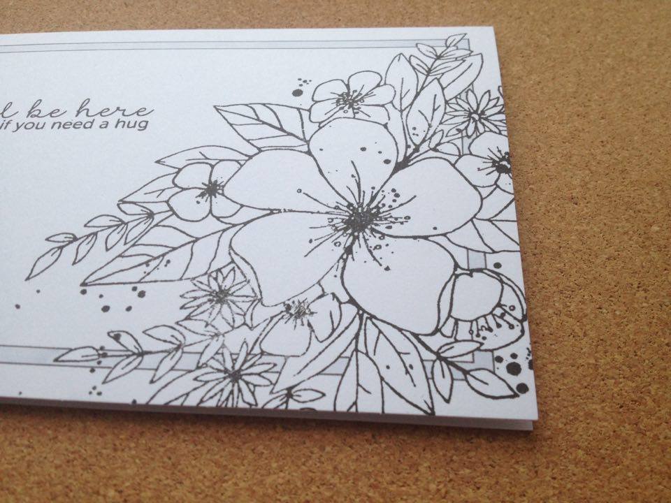 For at det hele ikke bliver til et stort motiv, har jeg farvet rammen lysegrå med en copic marker. Man kunne også farvelægge blomsterne hvis man har tiden til det.