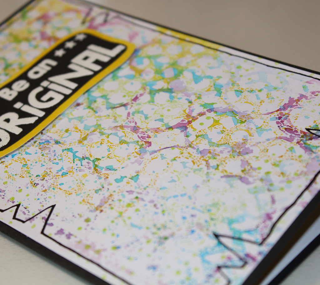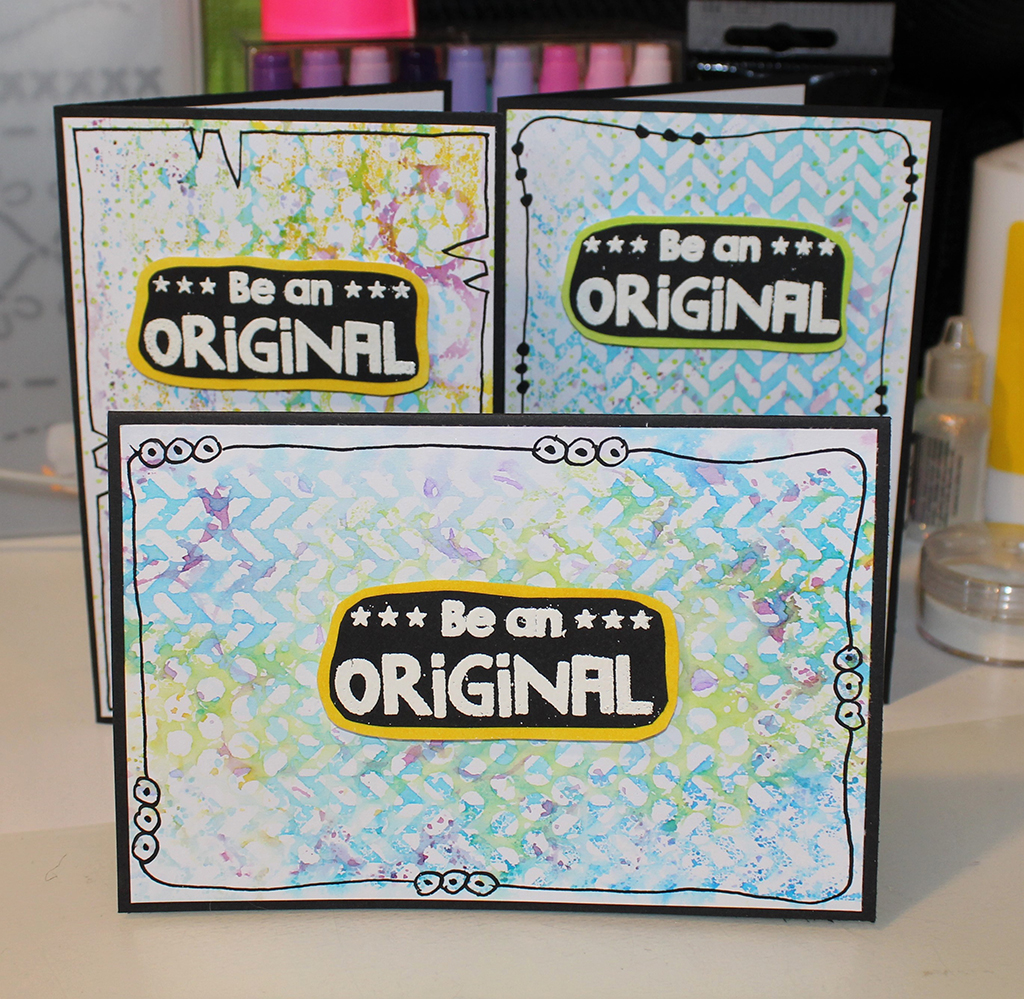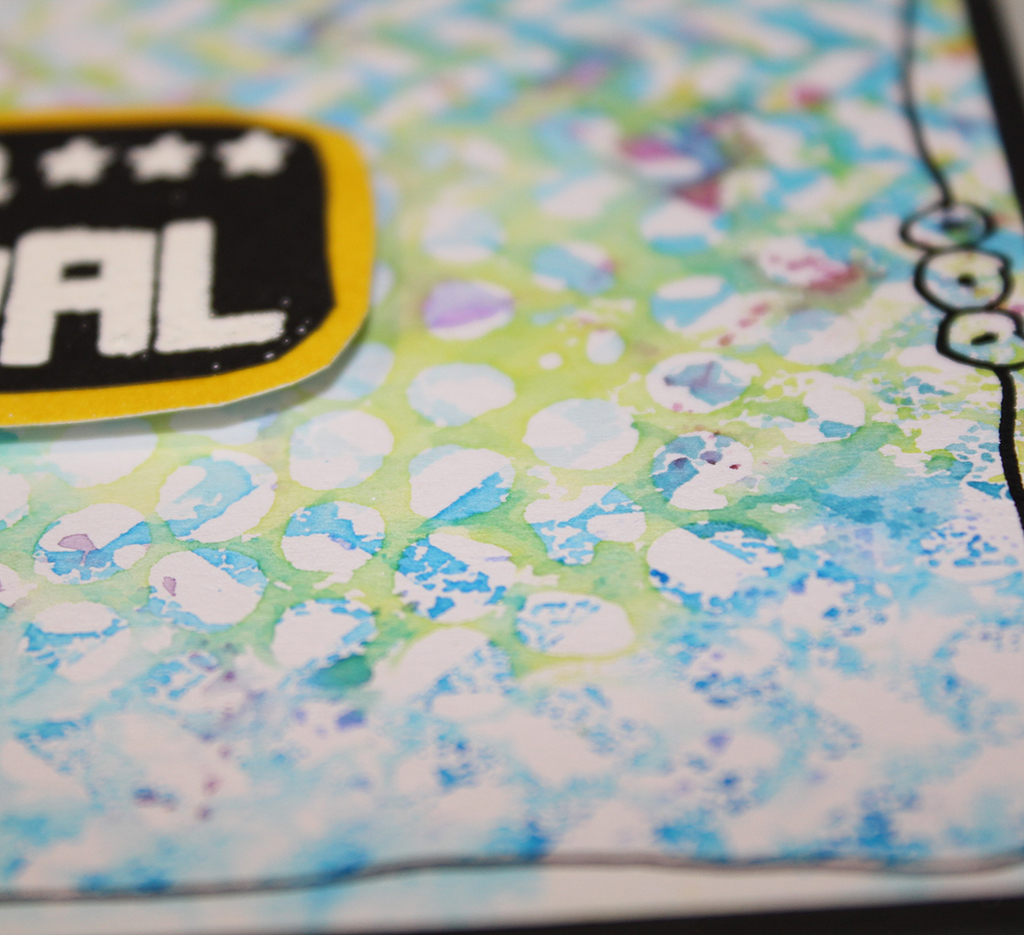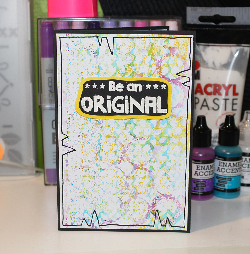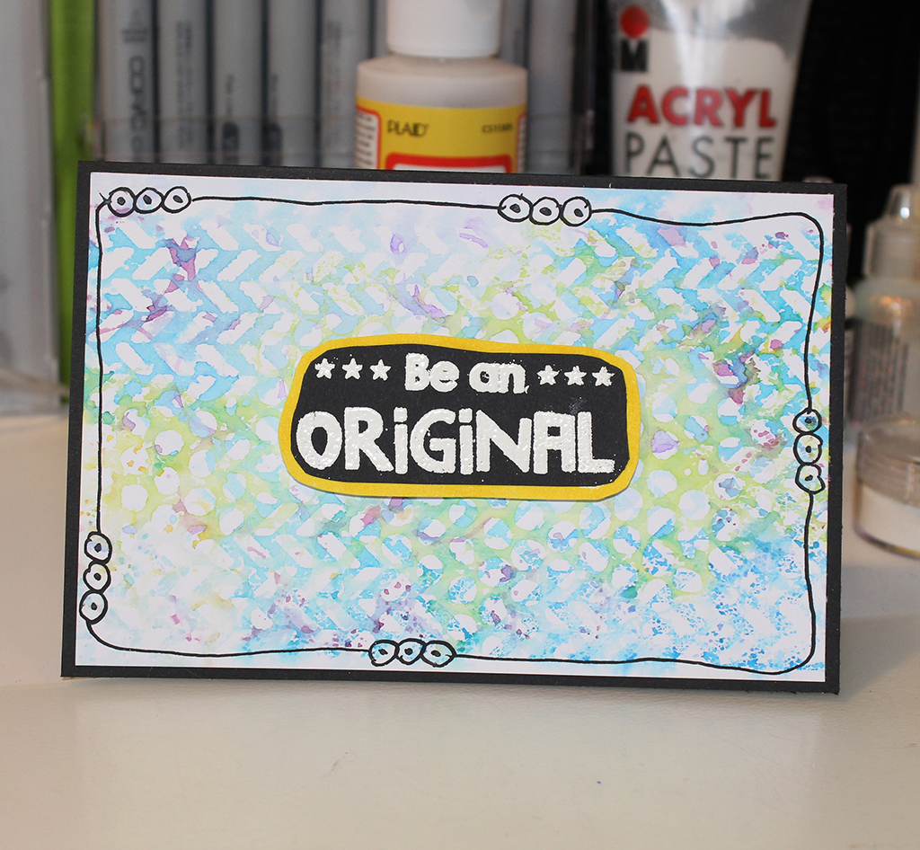 Jeg har trykket Distress Ink på min stencil, sprayet med masser af vand og lagt min stencil over på kortet. Jeg har brugt 3 forskellige stencils på hvert kort. Jeg har valgt at bruge flere nuancer af samme farve på den enkelte stencil. Man kan sagtens blande farverne på sin stencil. Det giver et helt andet, men mindst lige så flot resultat. Jeg har tørret mit kort mellem hver stencil, for at undgå at farverne flød for meget sammen. For at færdiggøre min baggrund har jeg tegnet en kant med en sort Dylusions pen. Jeg har embosset min tekst på sort karton. Jeg syntes ikke jeg fik det tydeligt nok første gang, så jeg valgte at bruge min Precision press, så jeg kunne stemple og embosse samme sted flere gange og få et klarere aftryk. Jeg klippede teksten ud. Derefter har jeg sværtet med en matchende Distress Ink på hvidt karton, limet mit stempel på og klippet rundt om så jeg fik en lille farvet kant. teksten er sat på med 3D puder.