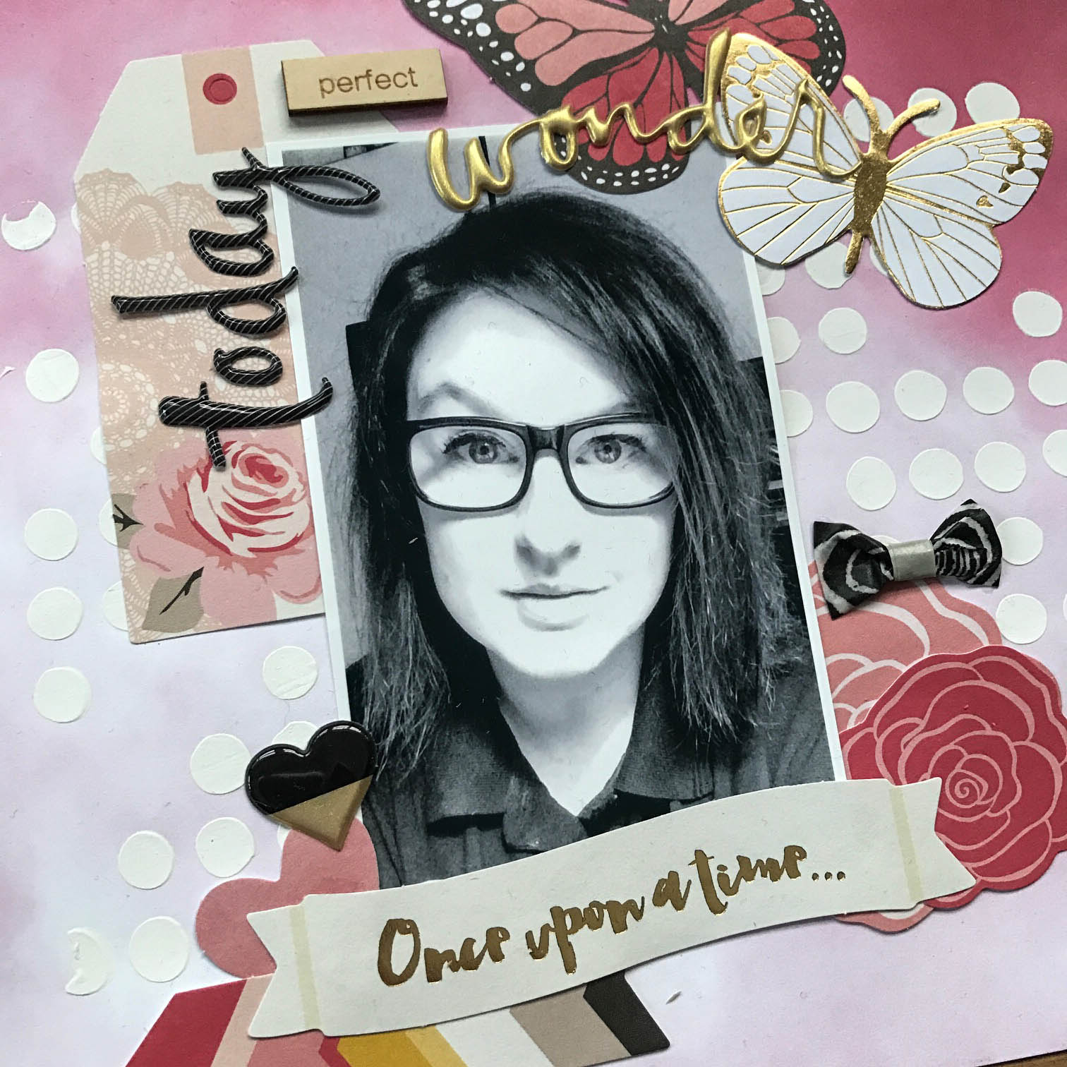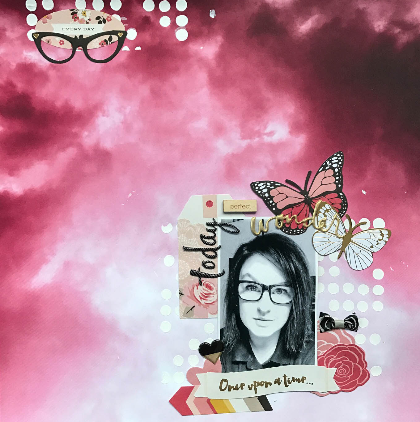 Til dette layout har jeg brugt baggrundspapiret som det var. Jeg har tilføjet hvid gesso og diecuts (som er fra My Minds Eye - dog ikke med i månedskittet). Træpynten, titlen, hjertet og washitapen er fra månedskittet.