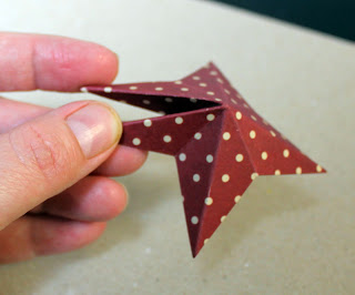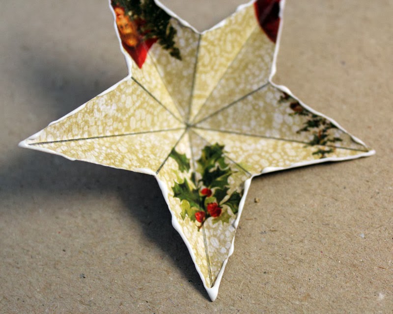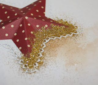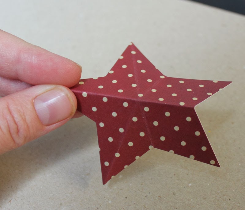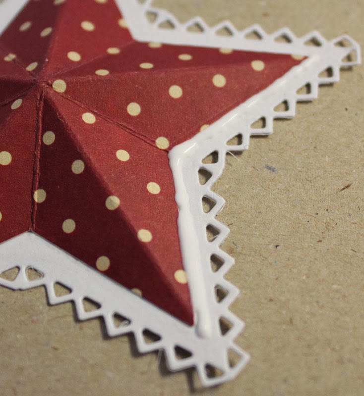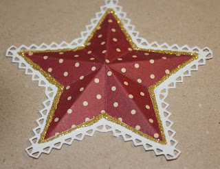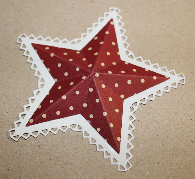 Til hver stjerne har jeg brugt 3 dele. 1 stk. af den store stjerne med "blondekant" og 2 stk. af den største helt almindelige stjerne, de er lavet i mønstret papir.