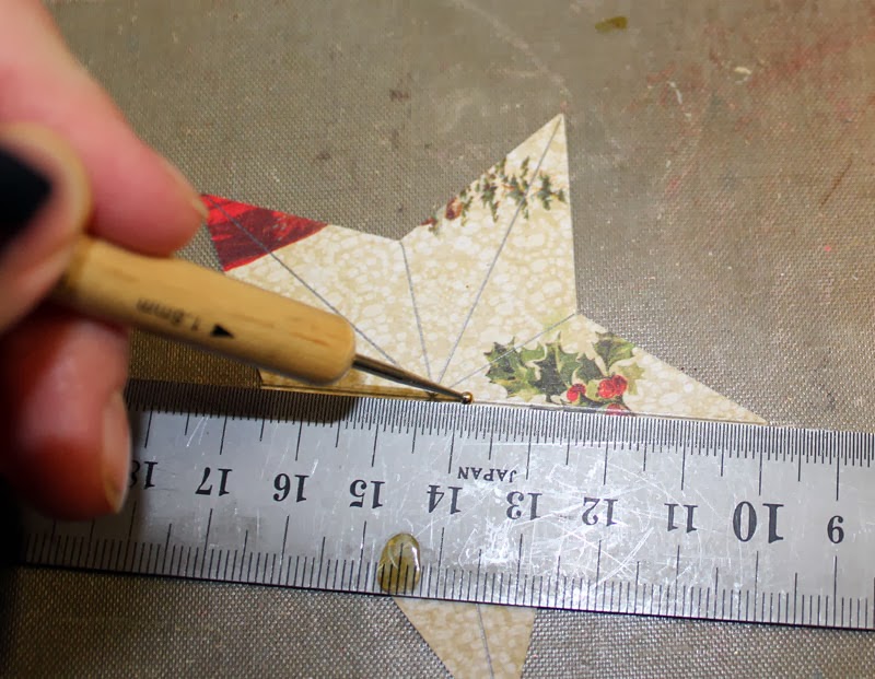 Det er måske lidt svært at se, men her har jeg lagt en stribe hvid lim langs kanten af den mønstrede stjerne.