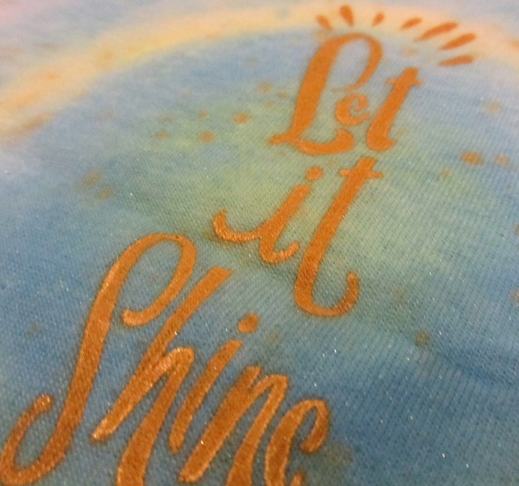 På den ene side startede vi med at gøre t-shirten våd med en vand og pensel. Gelatos smurte vi ud på et stykke plastik ved siden af, og gjorde den våd. Derefter påførte vi den våde gelato på den våde t-shirt med en pensel. Man kan lave lige præcis det mønster, man ønsker. Man kan også lave splats og lignende. Til sidst tørrede vi det med en varmepistol. Derefter tilføjede vi med fingerne gelatos gennem en stencil.