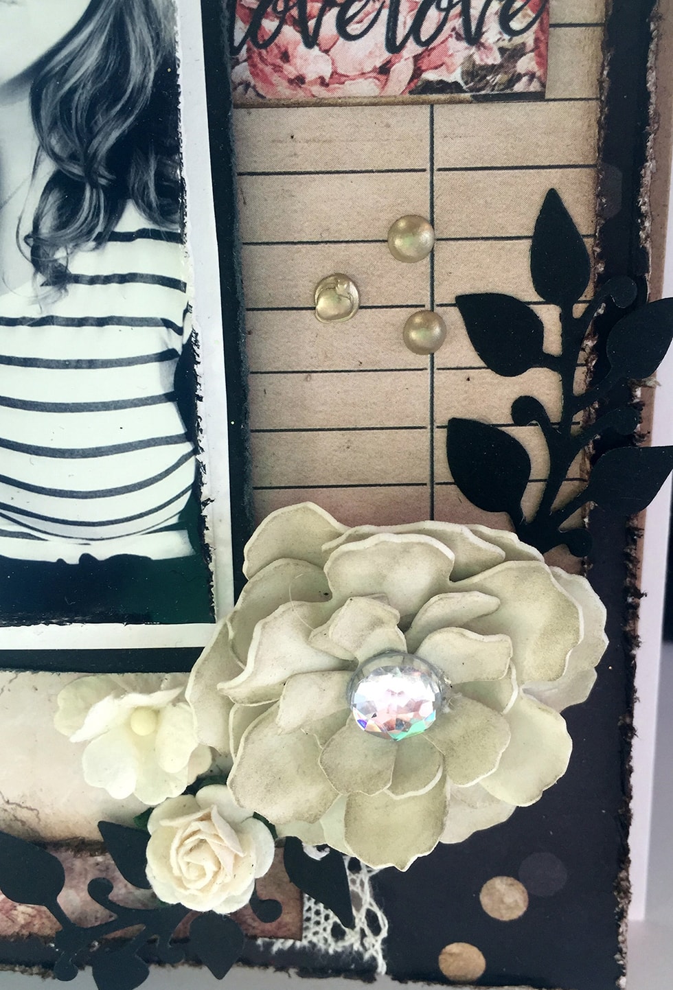 Blomsterne er lavet med foamiran. Jeg har farvet dem med chark fra Prima. Som altid har jeg brugt rigtig meget 3D tape til at skabe dybte i mit projekt.