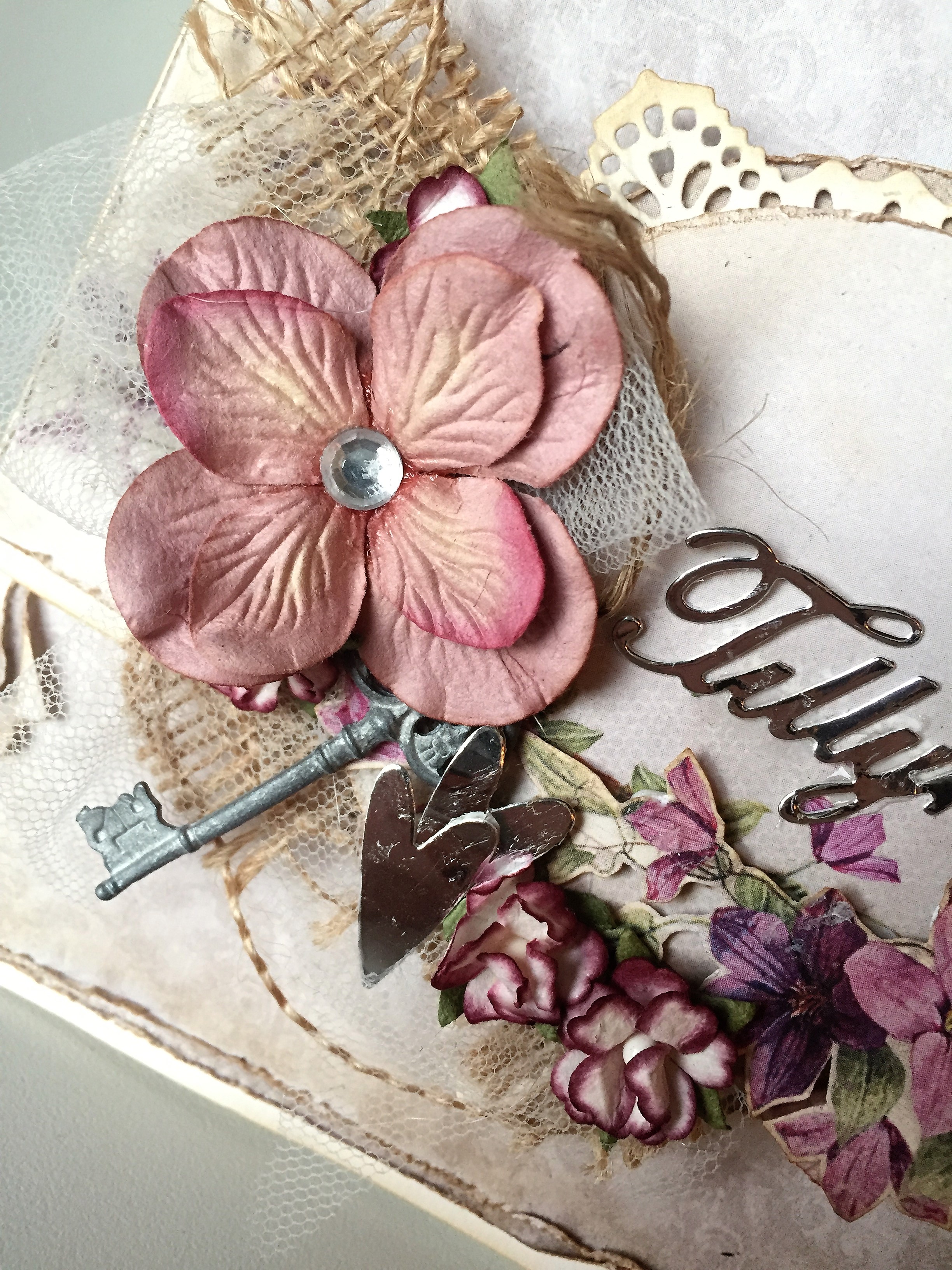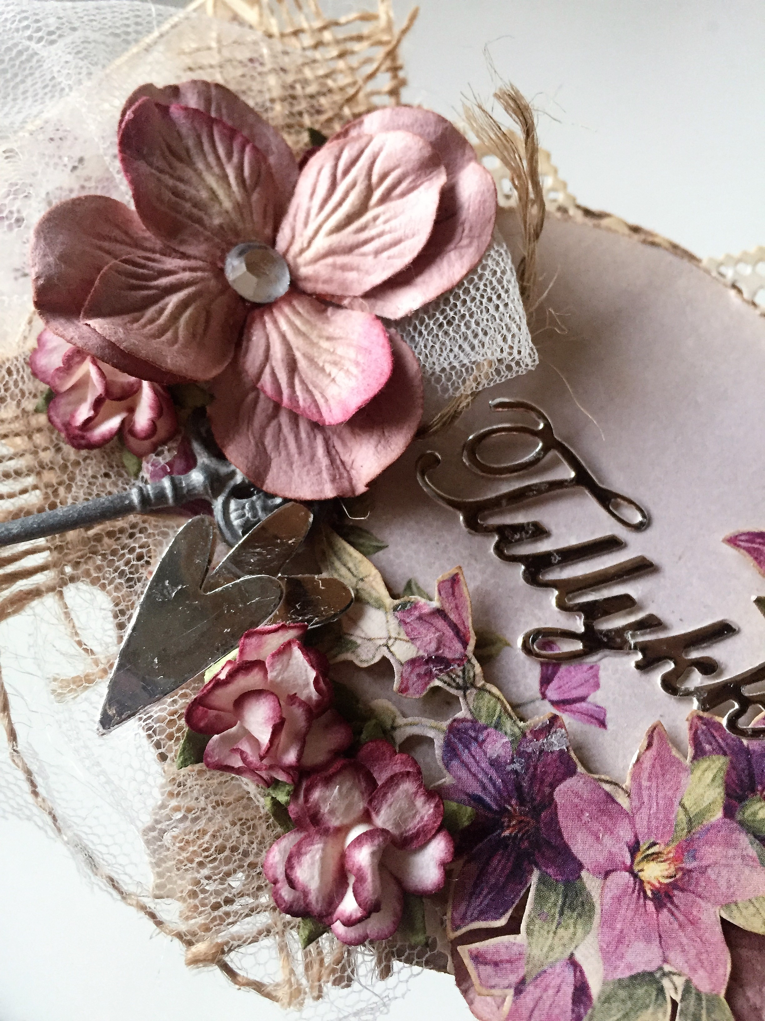 Lækre blomster i rosa/lavendelfarver, tyl, lidt blonde og hessian.