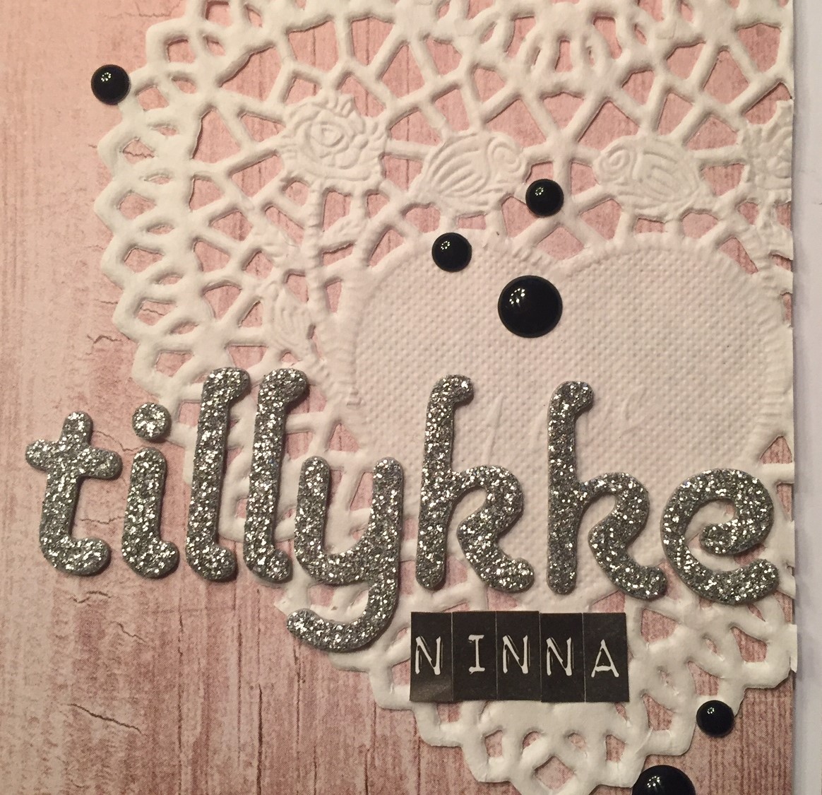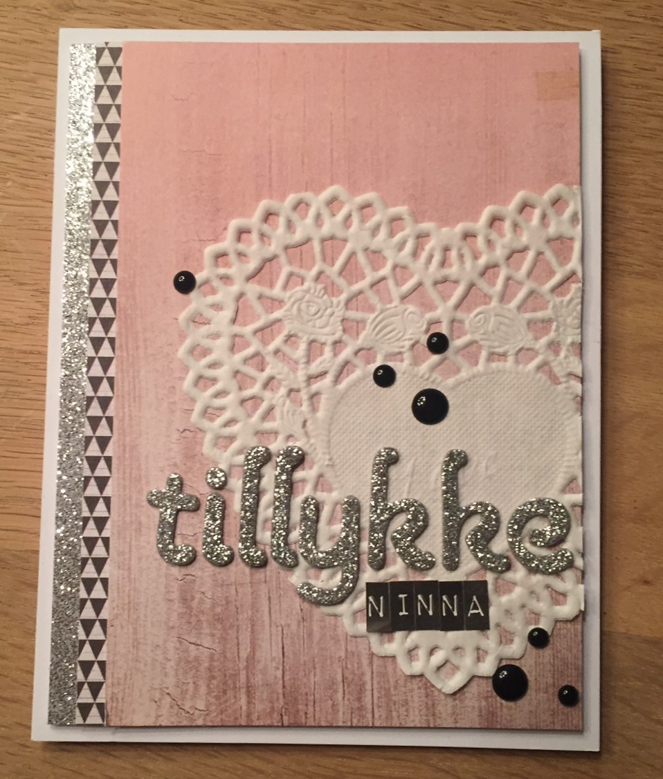 Papiret til dette kort er fra Crate Papers Confetti 6x6 blok. Jeg har yderst til venstre brugt sølvfarvet glitterkarton for at skabe en sammenhæng mellem tillykke (som er Thickers) og resten af kortet. Det sorte og hvide mønsterpapir er fra Crate Paper blokken.